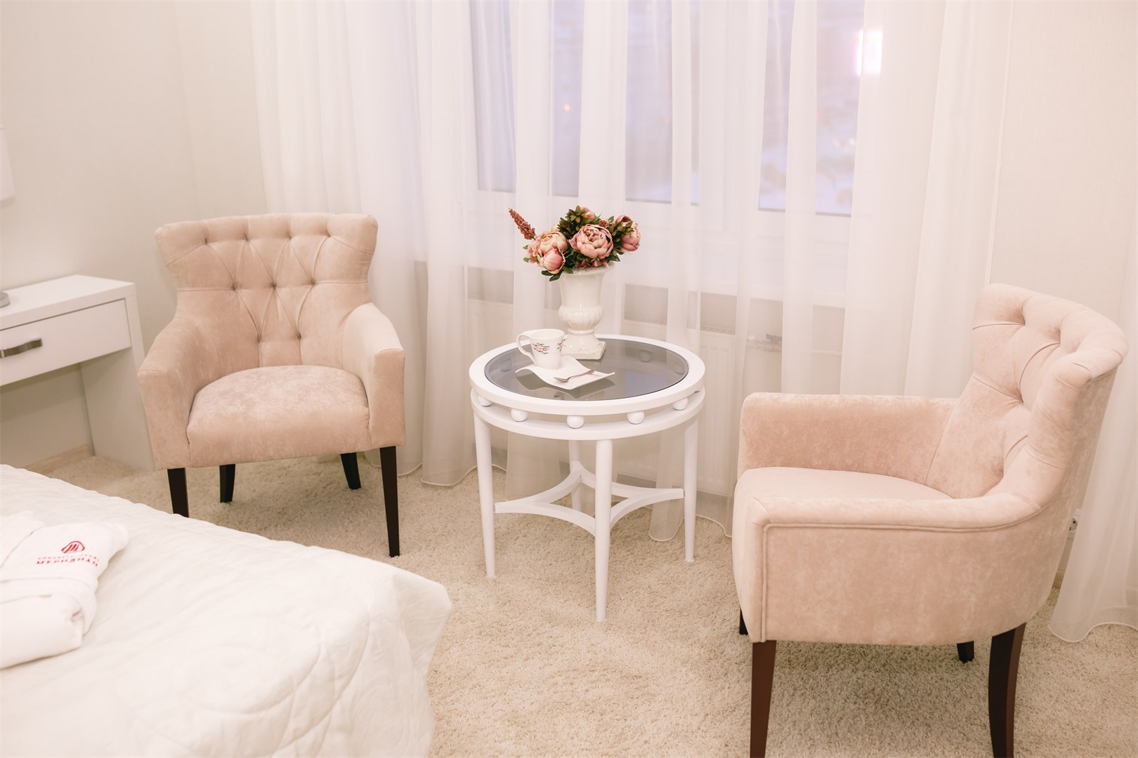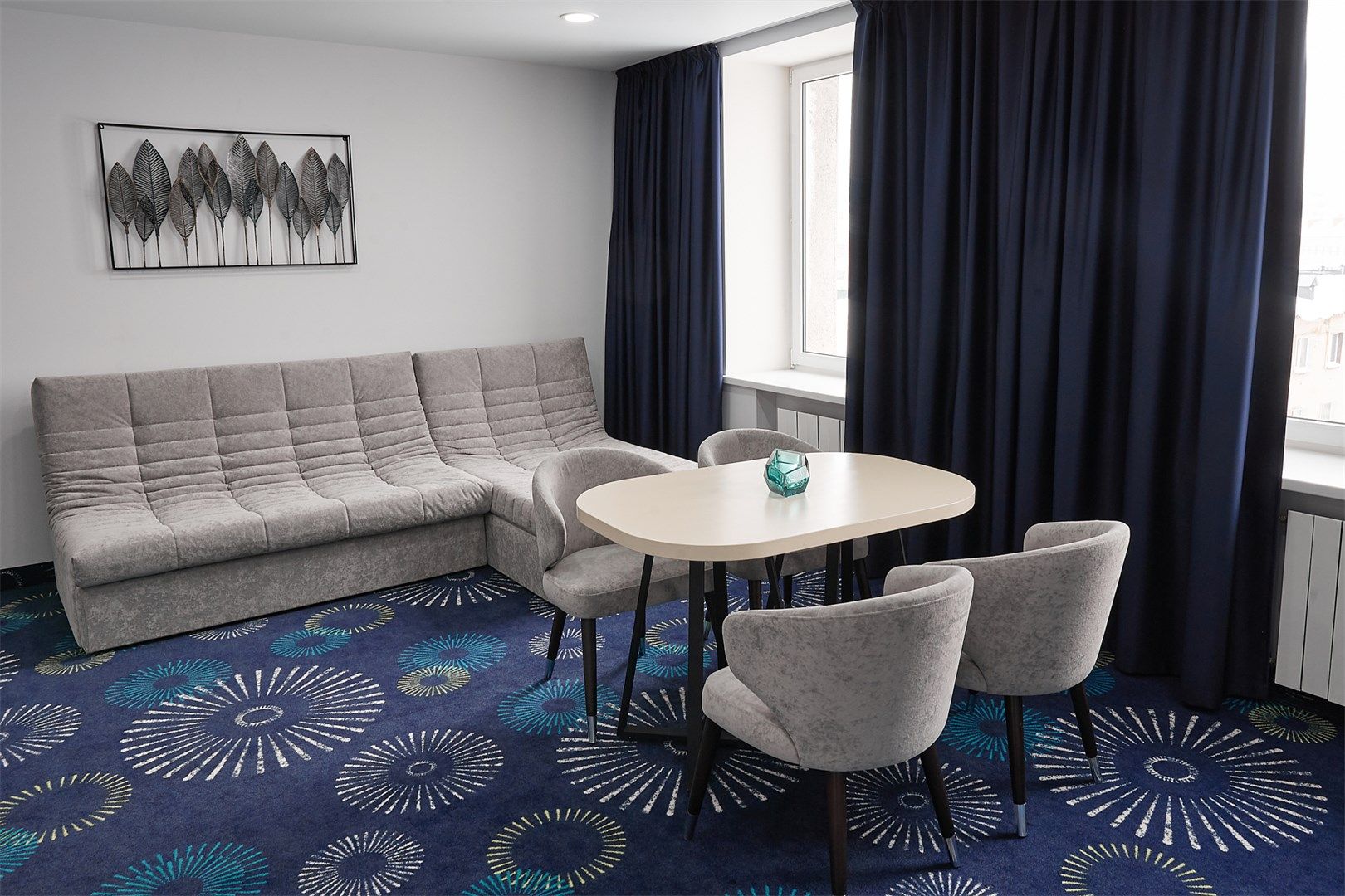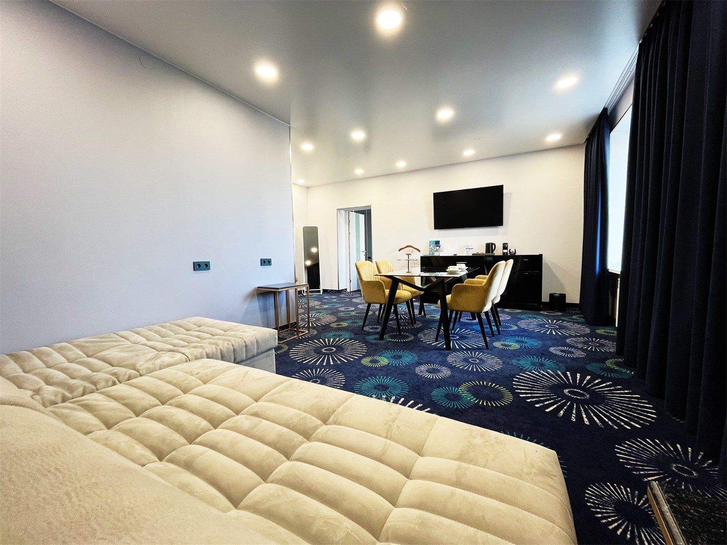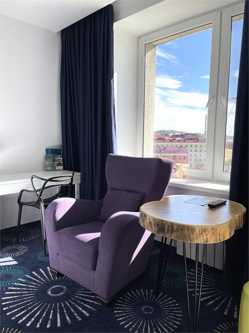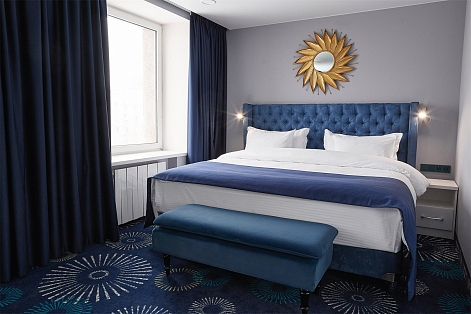 В номере: вешалка, диван, зеркало, кресла, кровать двуспальная, прикроватные тумбочки, стол, стулья, шкаф, мини-холодильник, сейф, телевизор, телефон, чайная станция
