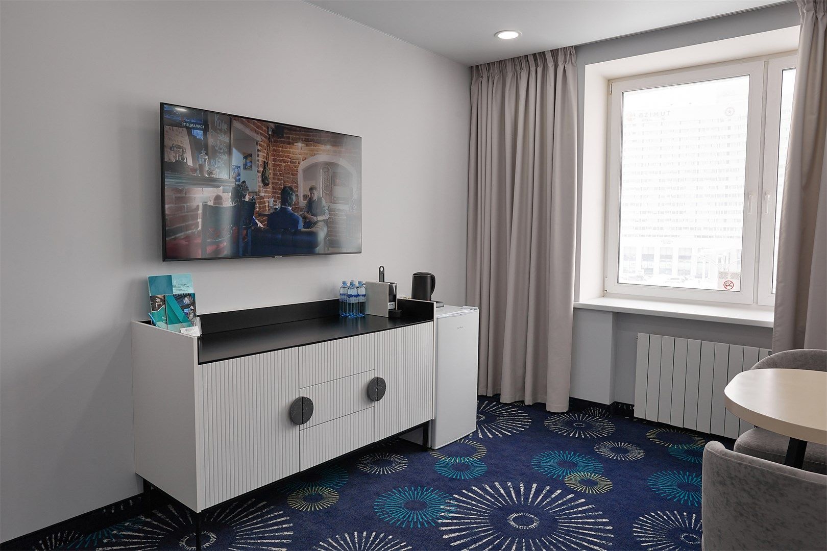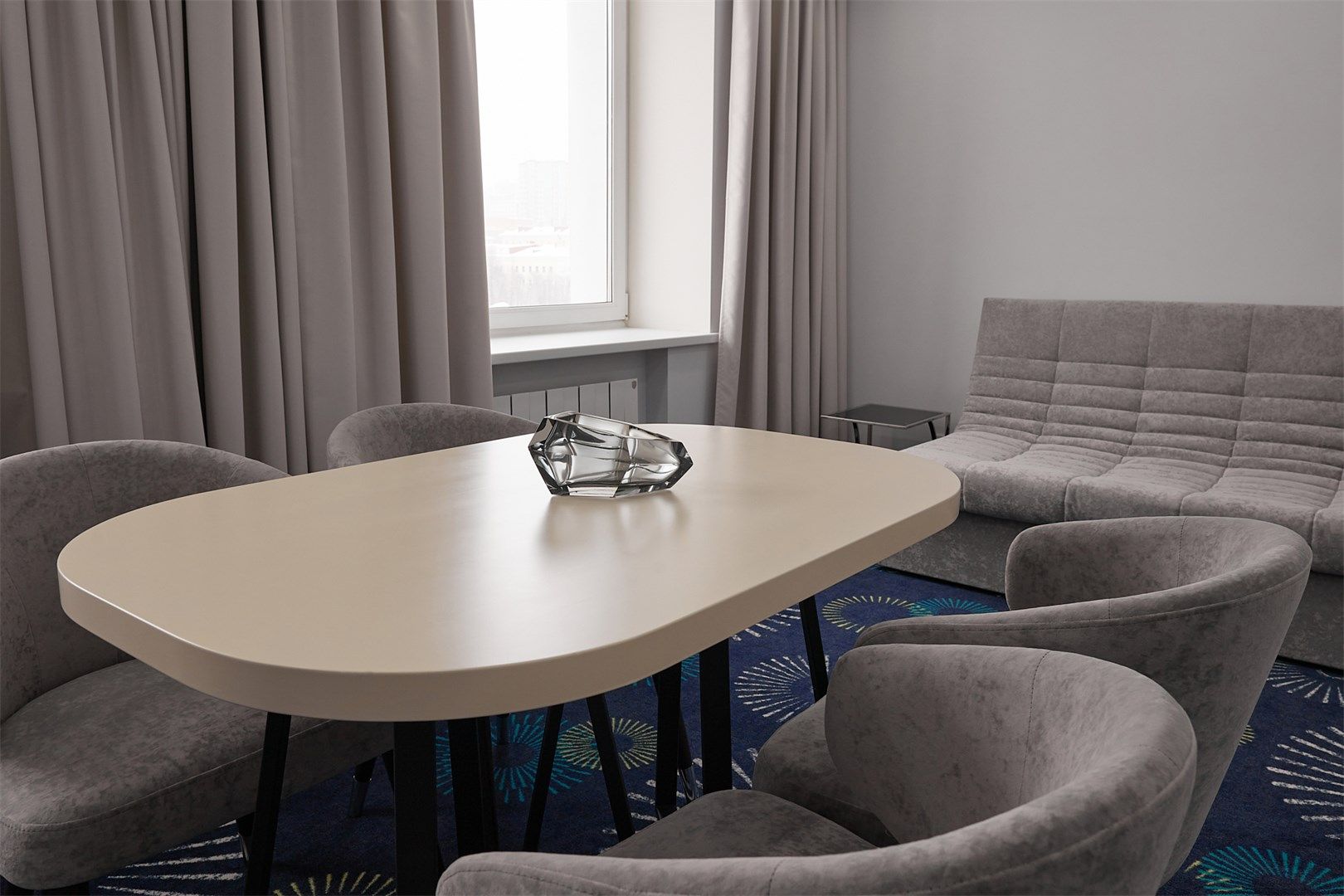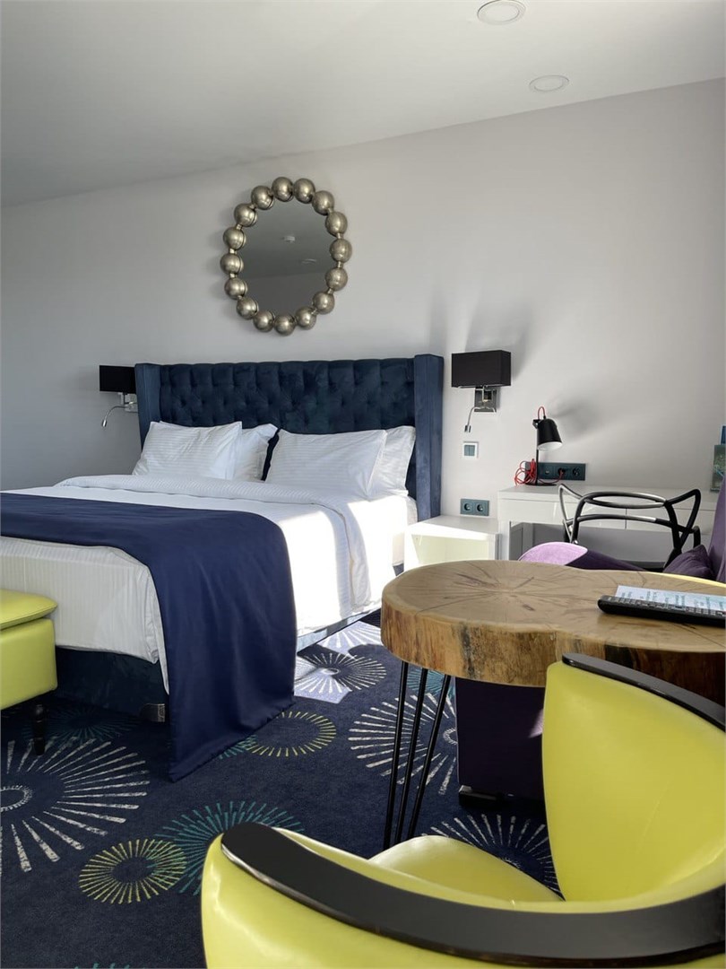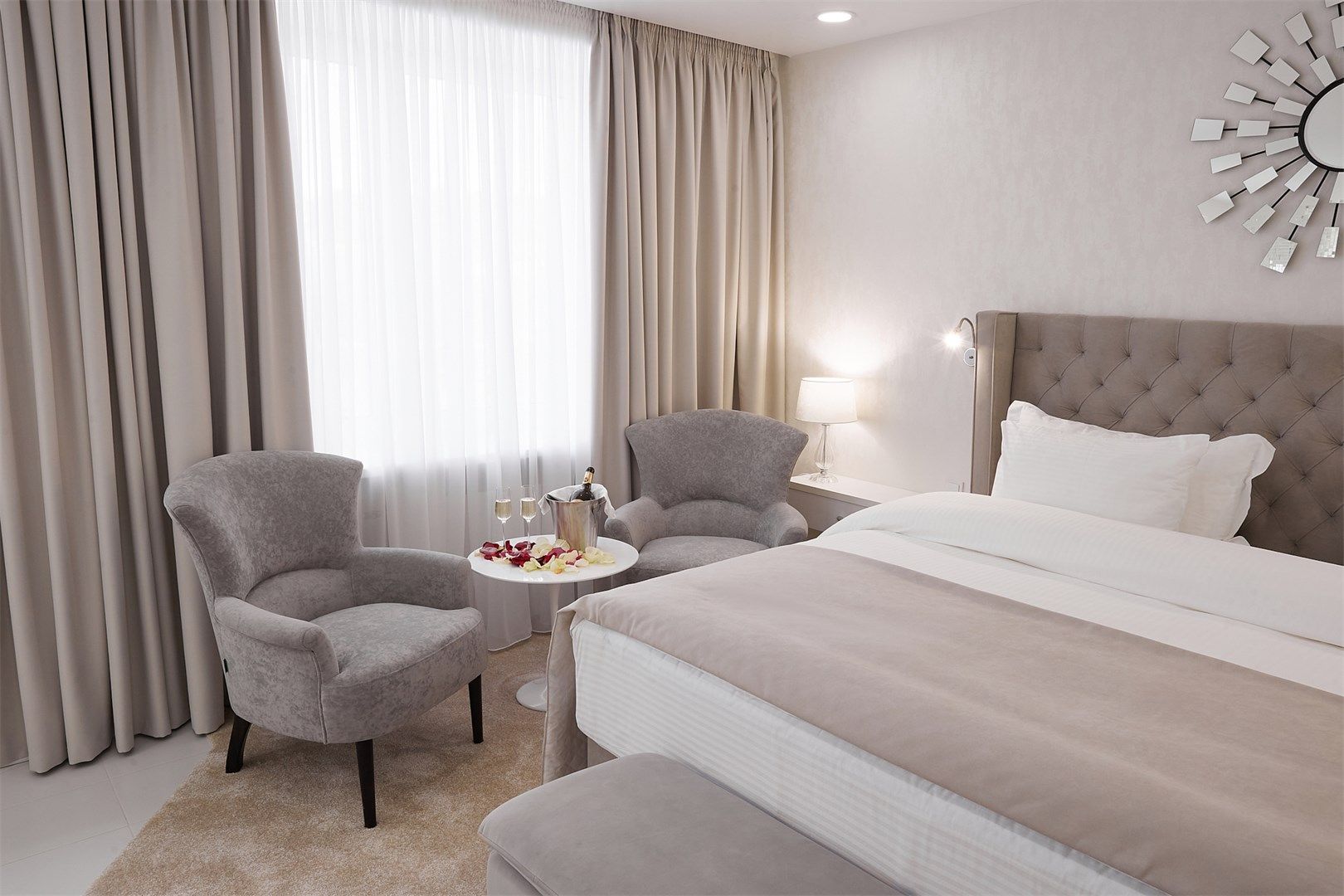В номере: вешалка, диван, зеркало, кресла, кровать двуспальная, прикроватные тумбочки, стол, стулья, шкаф, мини-холодильник, сейф, телевизор, телефон, чайная станция