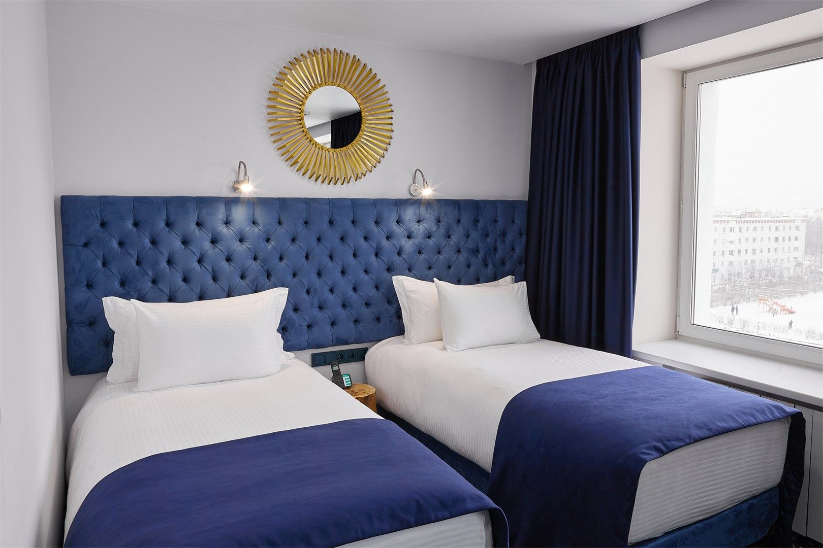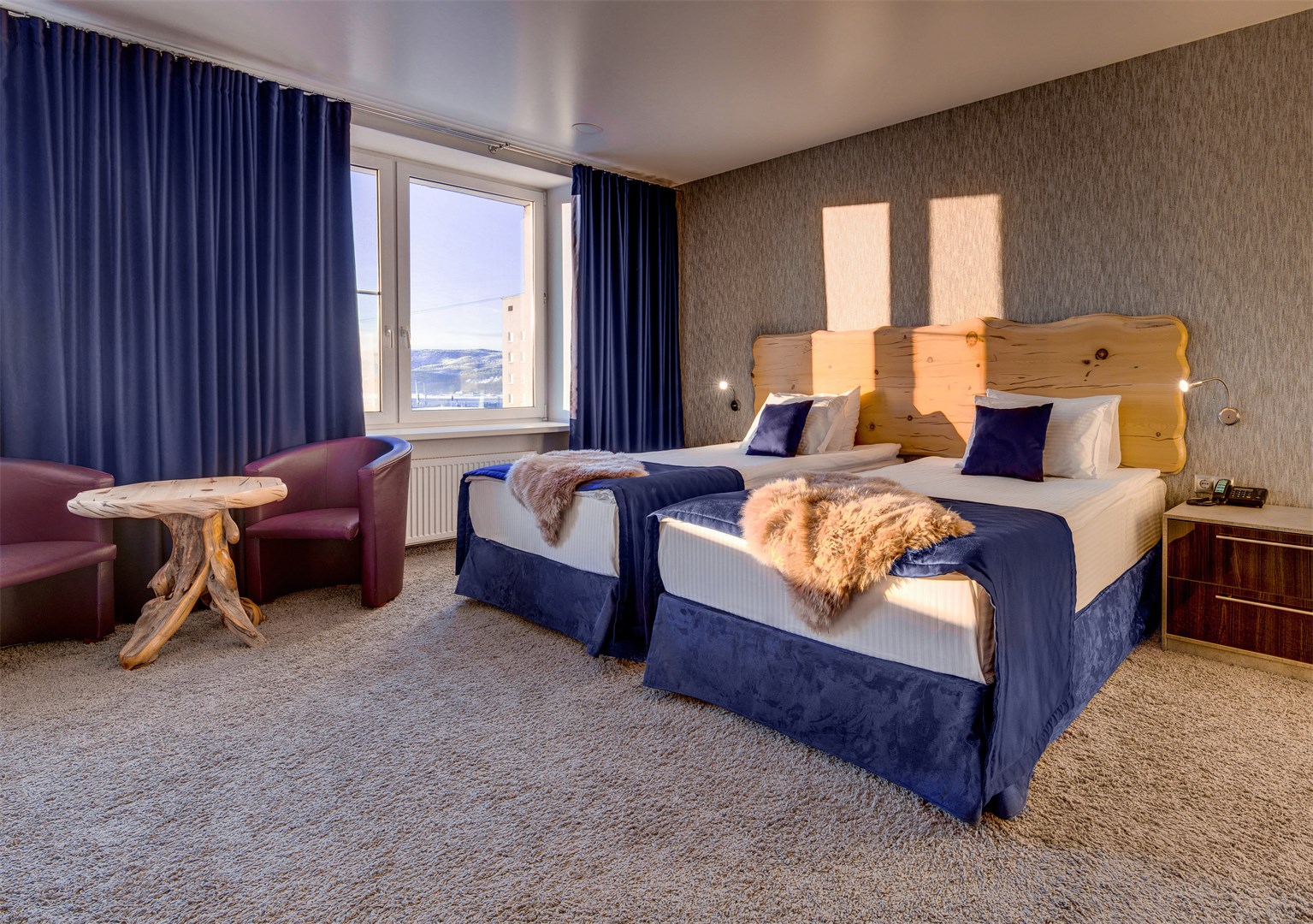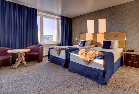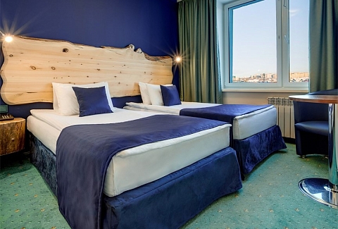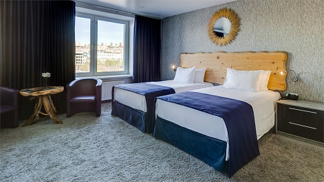 В номере: кровати односпальные, прикроватные тумбочки, стол, стулья, шкаф, мини-холодильник, сейф, телевизор, телефон, чайная станция