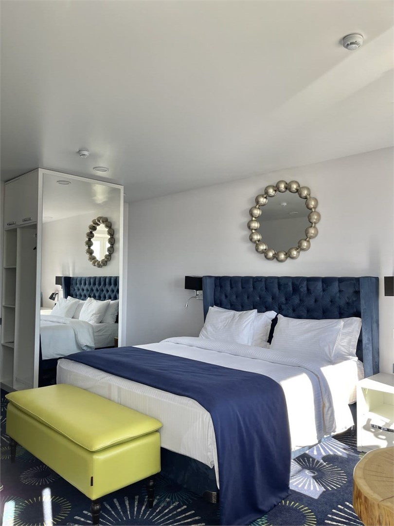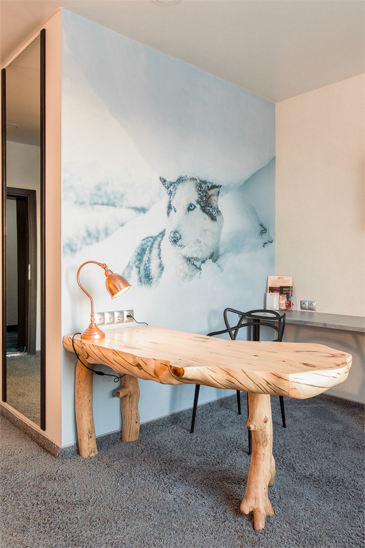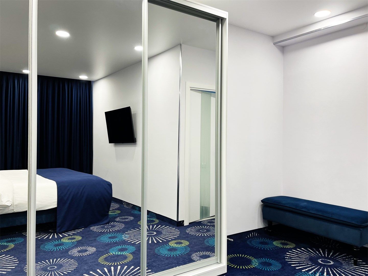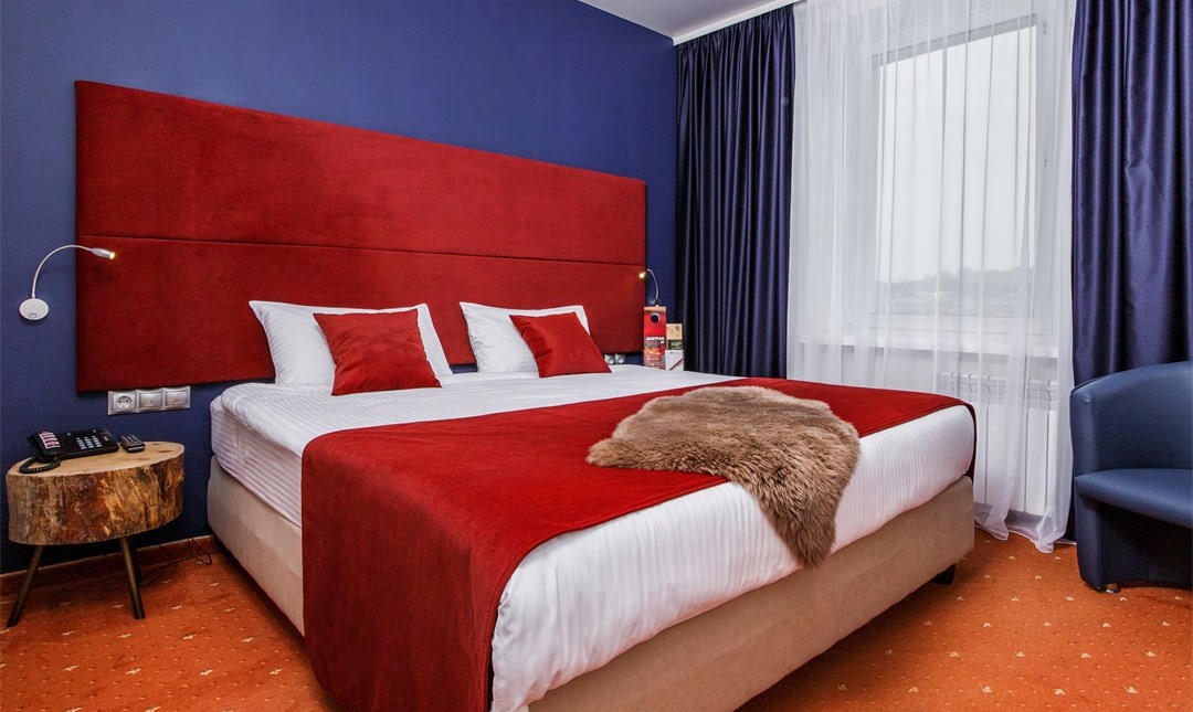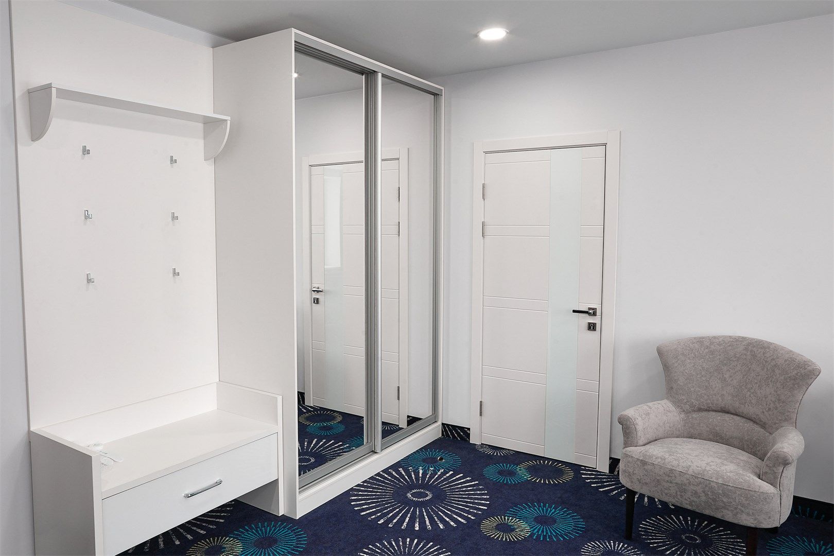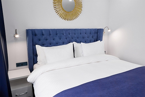 В номере: вешалка, зеркало, кресло, кровать двуспальная, прикроватные тумбочки, стол, стулья, шкаф, мини-холодильник, телевизор, телефон, чайная станция