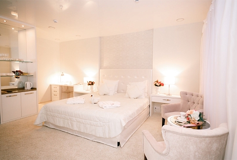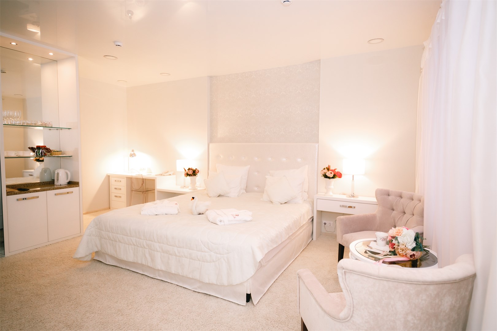 В номере: вешалка, зеркало, кровать для новобрачных, прикроватные тумбочки, стол, стулья, шкаф, кофемашина, мини-холодильник, набор посуды, телевизор, телефон, чайный набор посуды, электрочайник