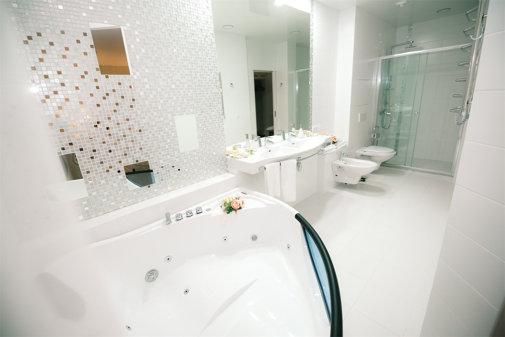 Санузел: биде, с джакузи, с душевой кабиной, тапочки, туалетные принадлежности, фен, халат
