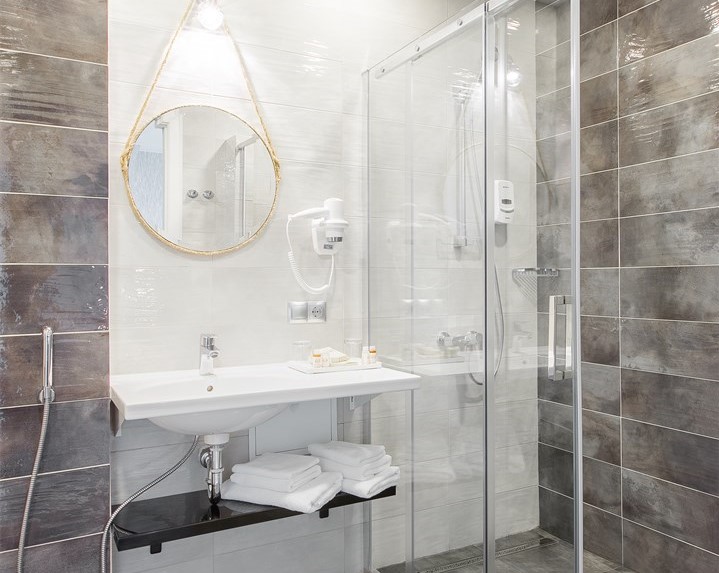 Санузел: с душевой кабиной, тапочки, туалетные принадлежности, фен
