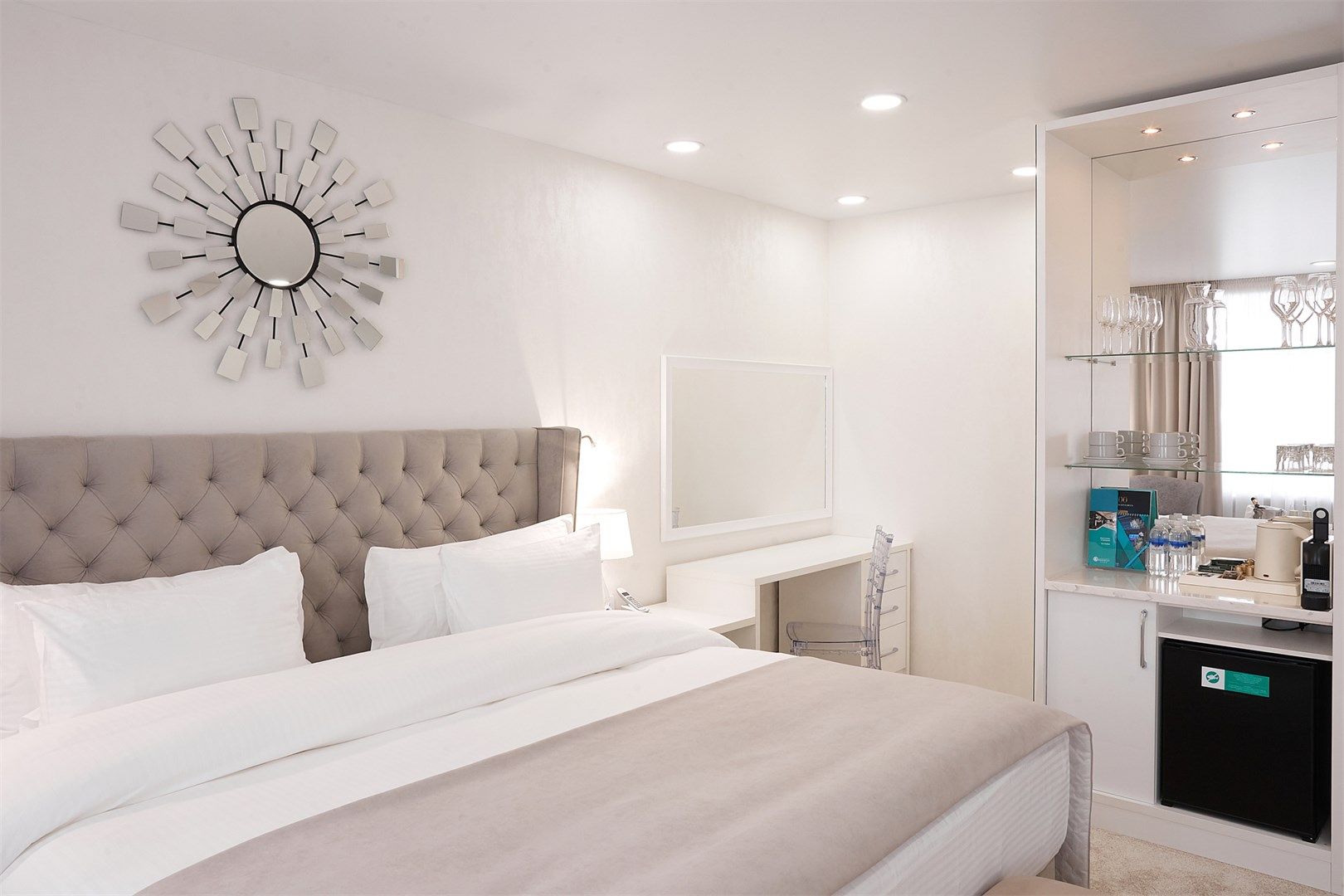 В номере: вешалка, зеркало, кресла, кровать двуспальная, прикроватные тумбочки, стол, стулья, шкаф, кофемашина, мини-холодильник, сейф, телевизор, телефон, чайник