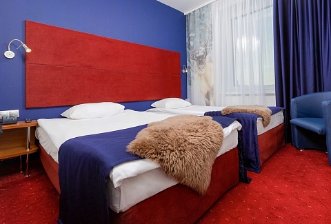 В номере: вешалка, зеркало, кровати полутороспальные, прикроватные тумбочки, стол, стулья, шкаф, мини-холодильник, телевизор, телефон, чайный набор посуды, электрочайник