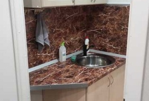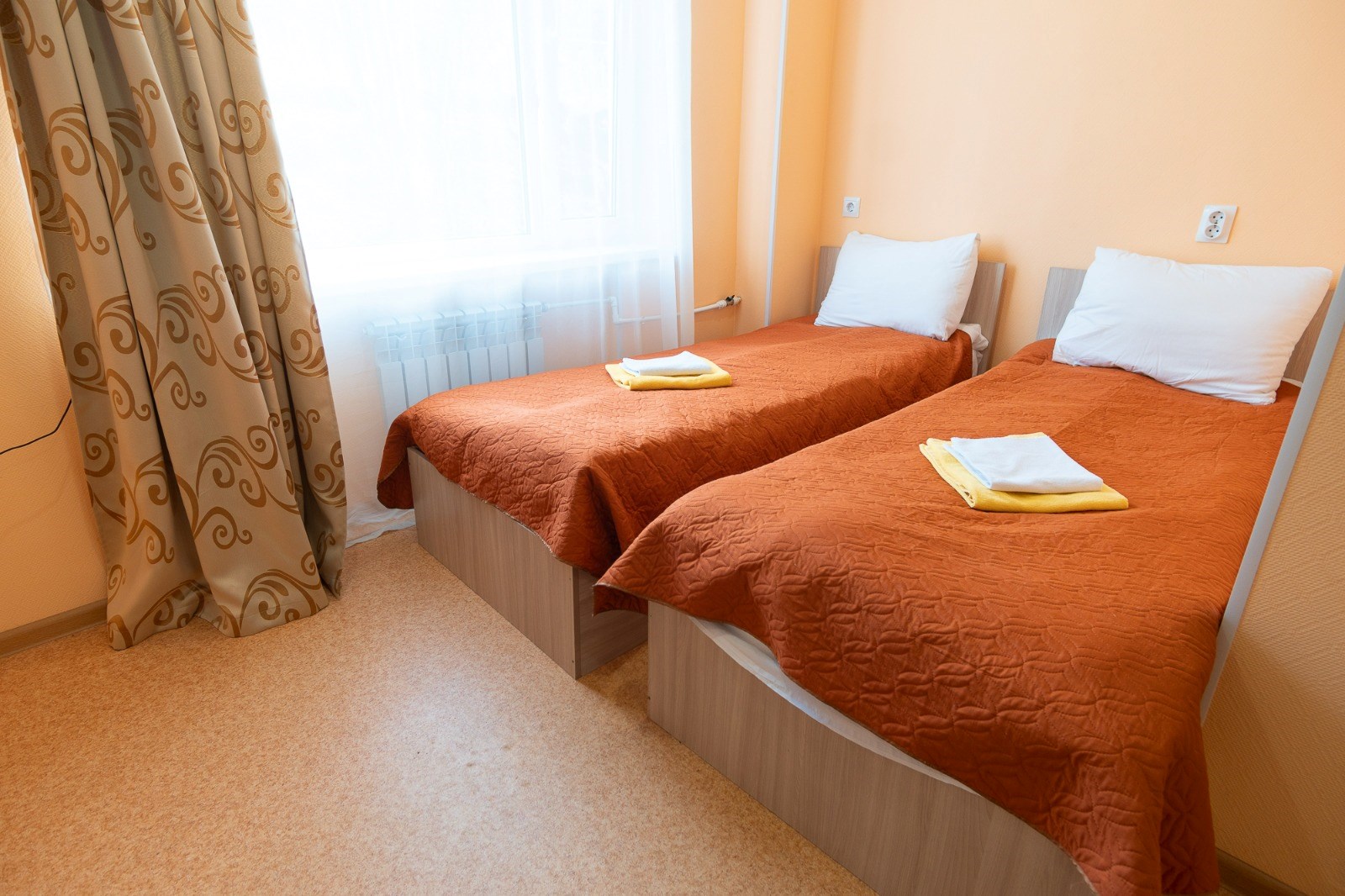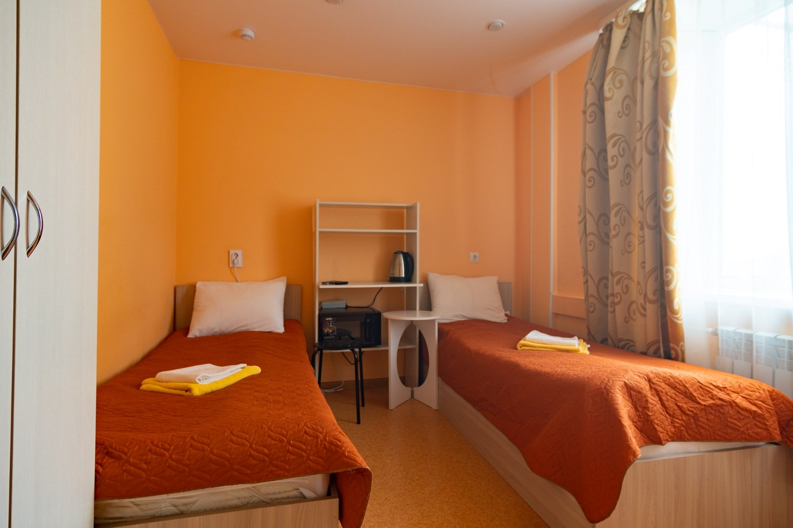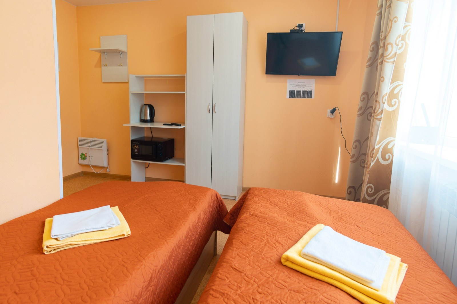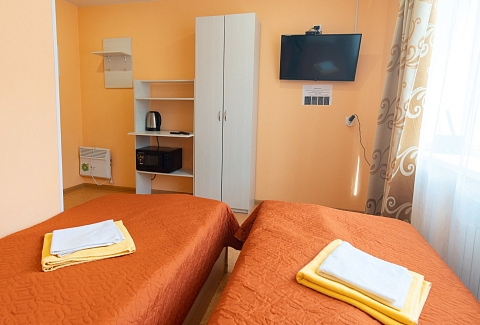 В номере: вешалка, кровати односпальные, стеллаж, стол, стулья, шкаф, микроволновая печь, набор посуды, обогреватель, телевизор ЖК, электрочайник