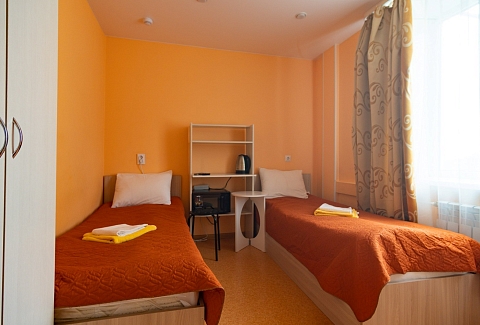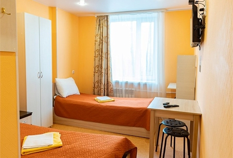 В номере: вешалка, кровати односпальные, стеллаж, стол, стул, шкаф, микроволновая печь, набор посуды, обогреватель, телевизор ЖК, электрочайник