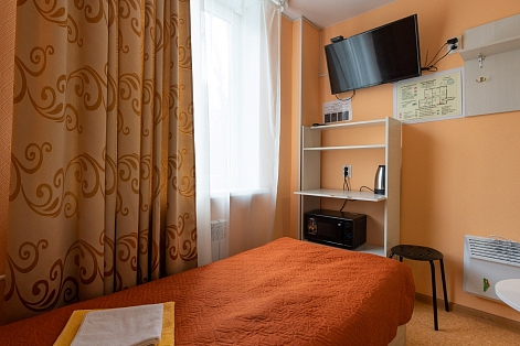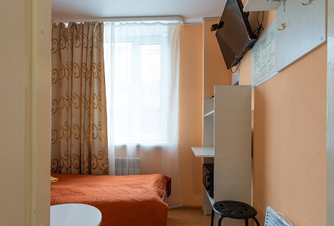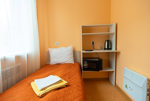 В номере: вешалка, кровать односпальная, стеллаж, стол, стул, шкаф, микроволновая печь, набор посуды, обогреватель, телевизор ЖК, электрочайник