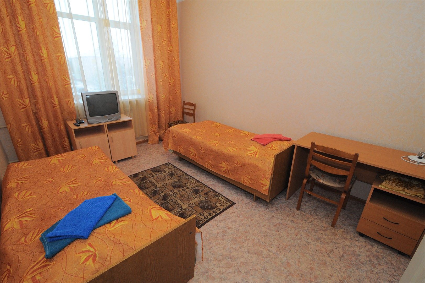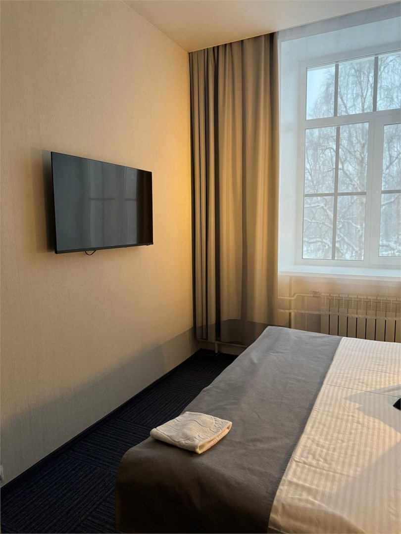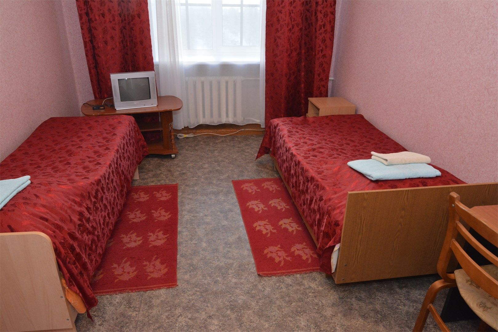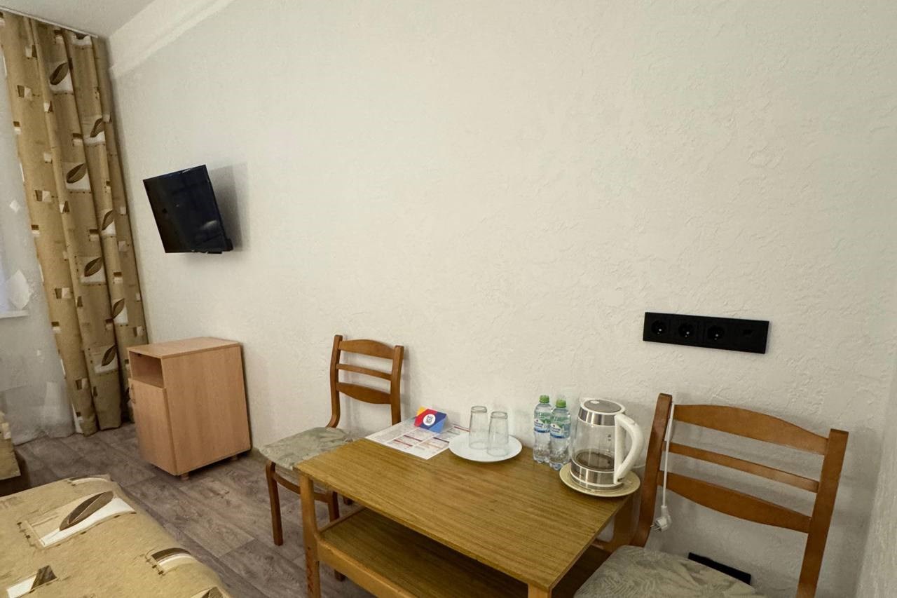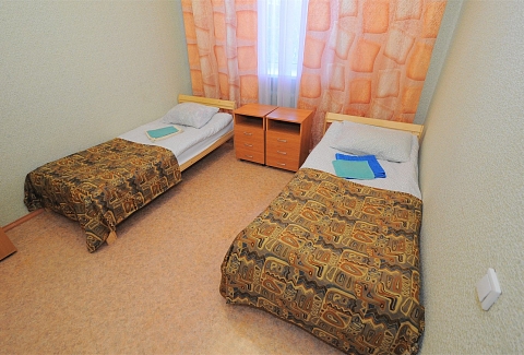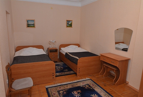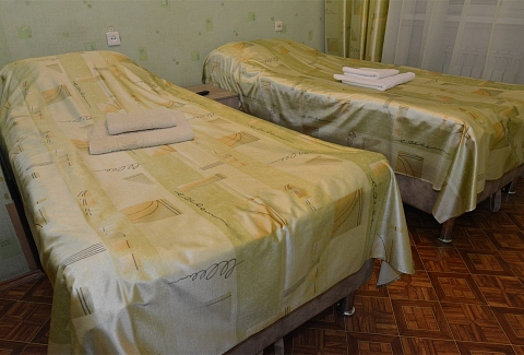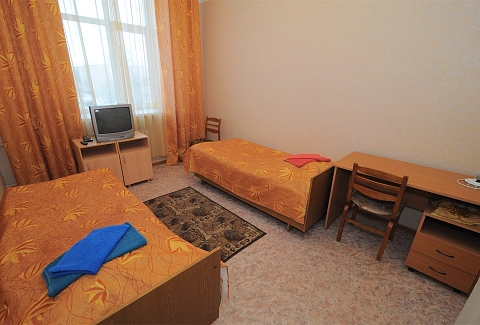 В номере: вешалка, зеркало, кровати односпальные, стол, стулья, шкаф, мини-холодильник, телевизор, чайный набор посуды, электрочайник