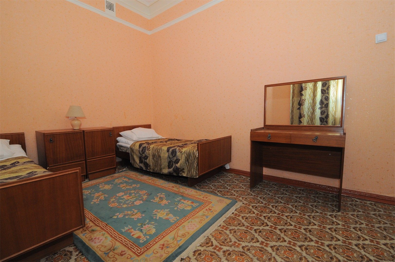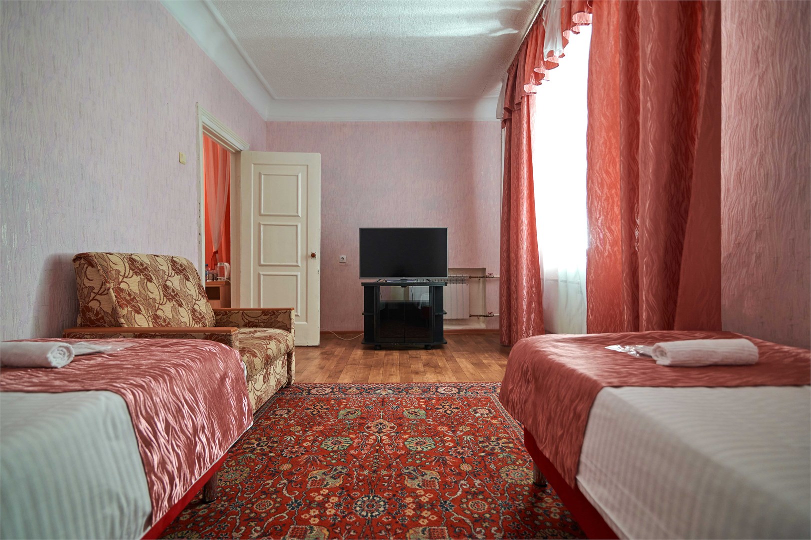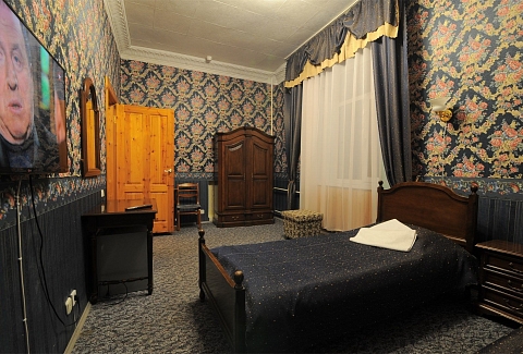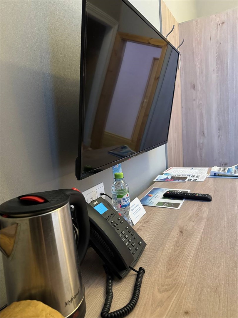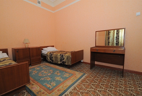 В номере: вешалка, зеркало, кровати односпальные, стол, стулья, шкаф, мини-холодильник, телевизор, чайный набор посуды, электрочайник
