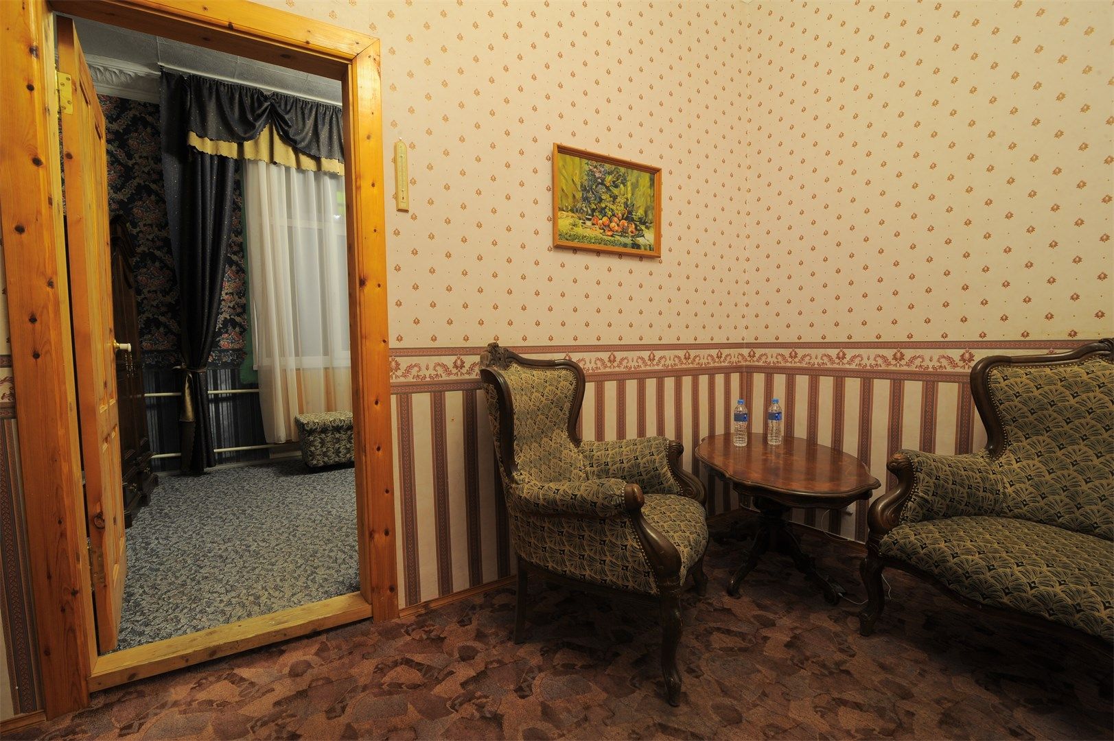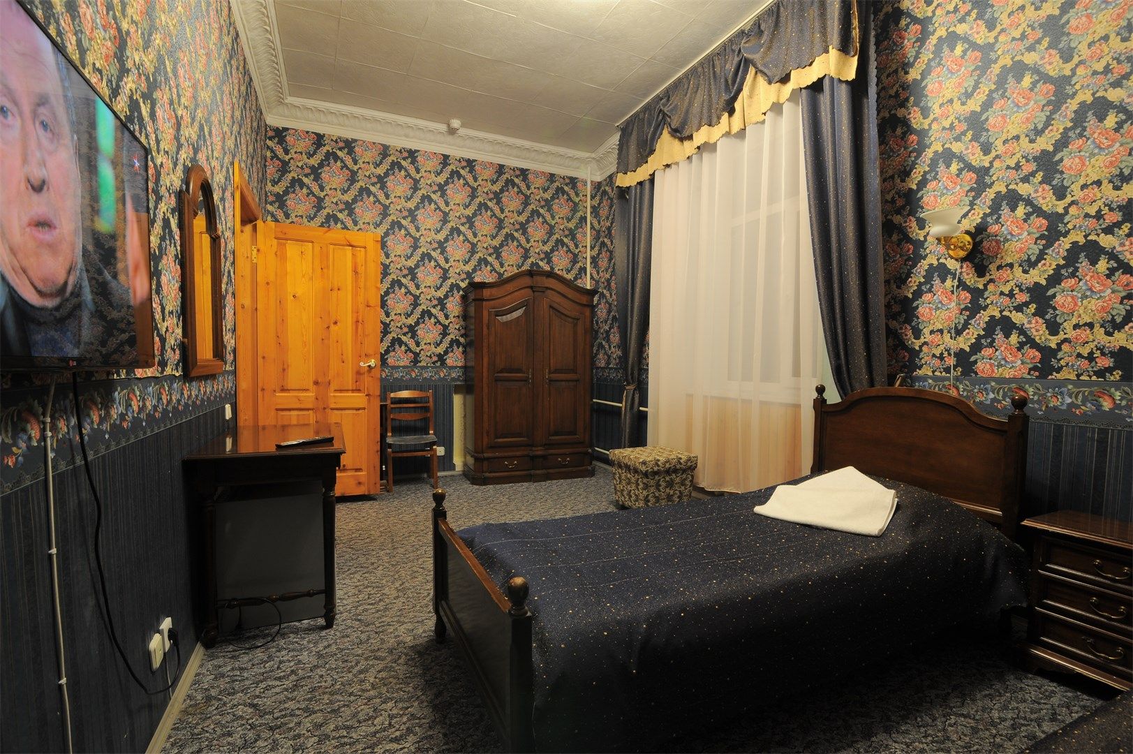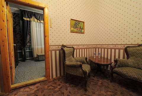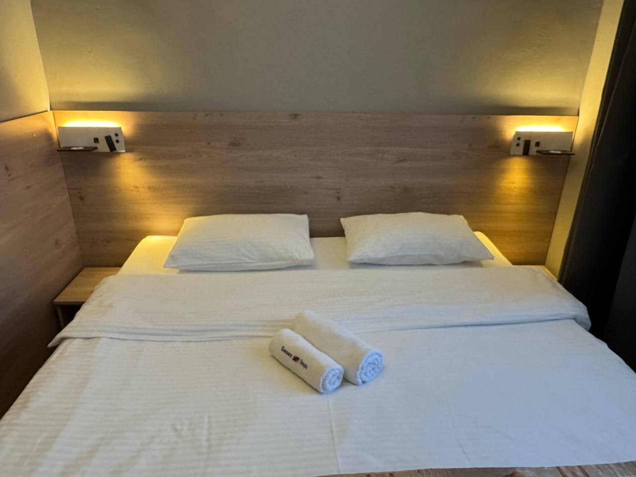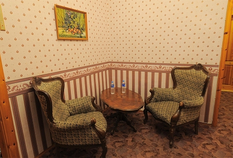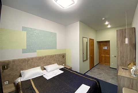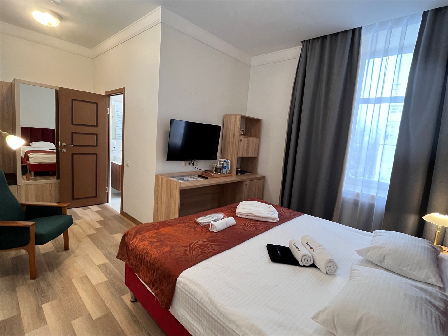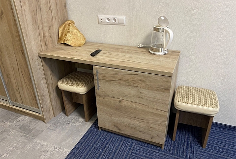 В номере: вешалка, зеркало, кровать двуспальная, прикроватные тумбочки, стол, стулья, шкаф, мини-холодильник, телевизор, чайный набор посуды, электрочайник