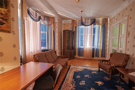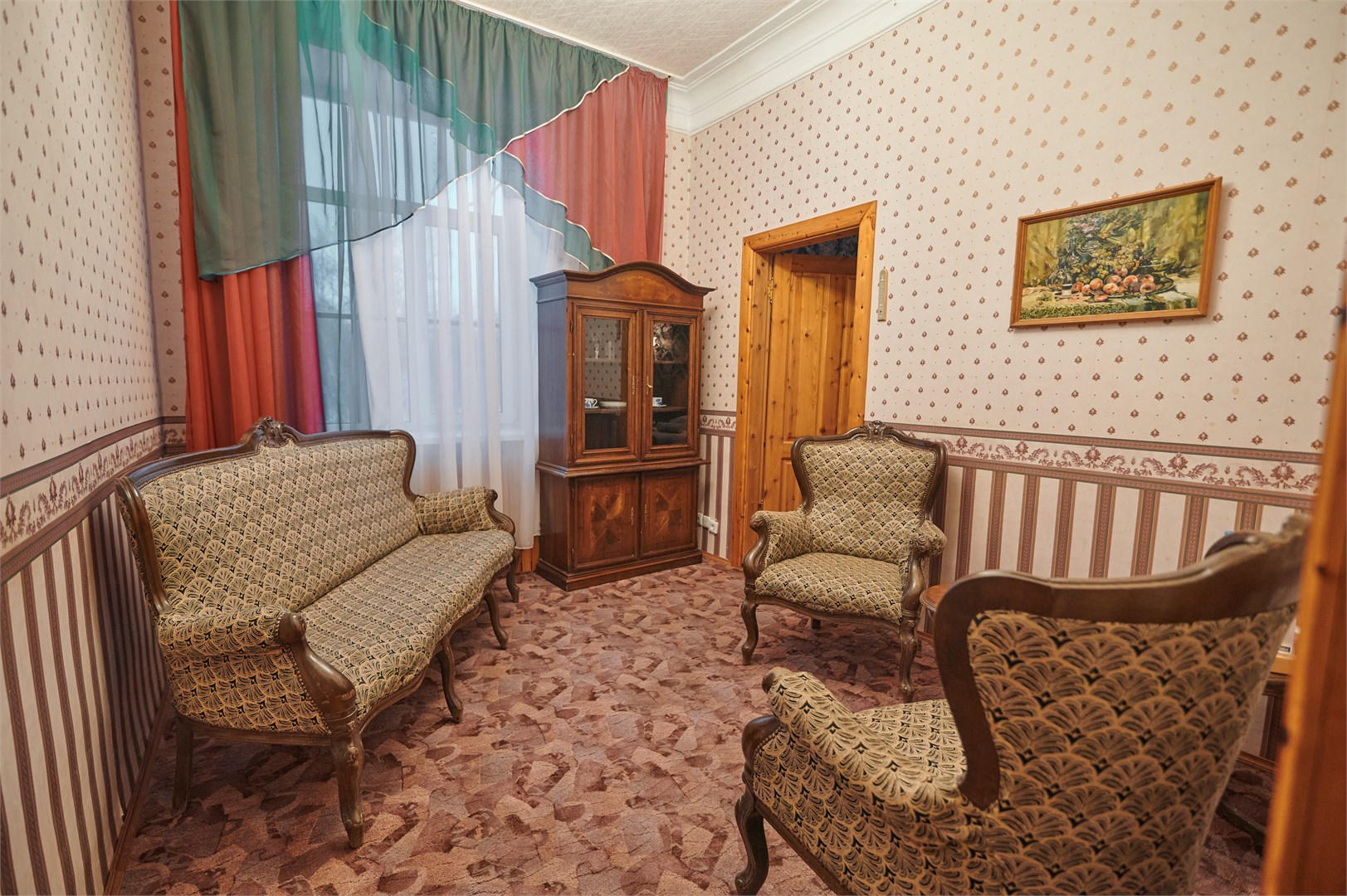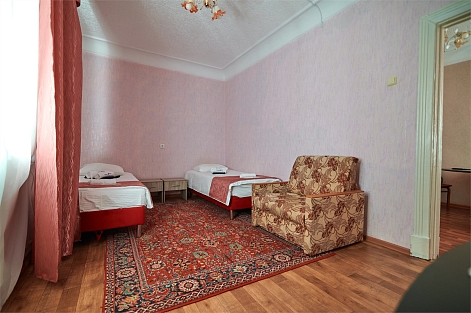 В номере: диван, кровати односпальные, прикроватные тумбочки, стол, стулья, шкаф, микроволновая печь, мини-холодильник, телевизор, чайник