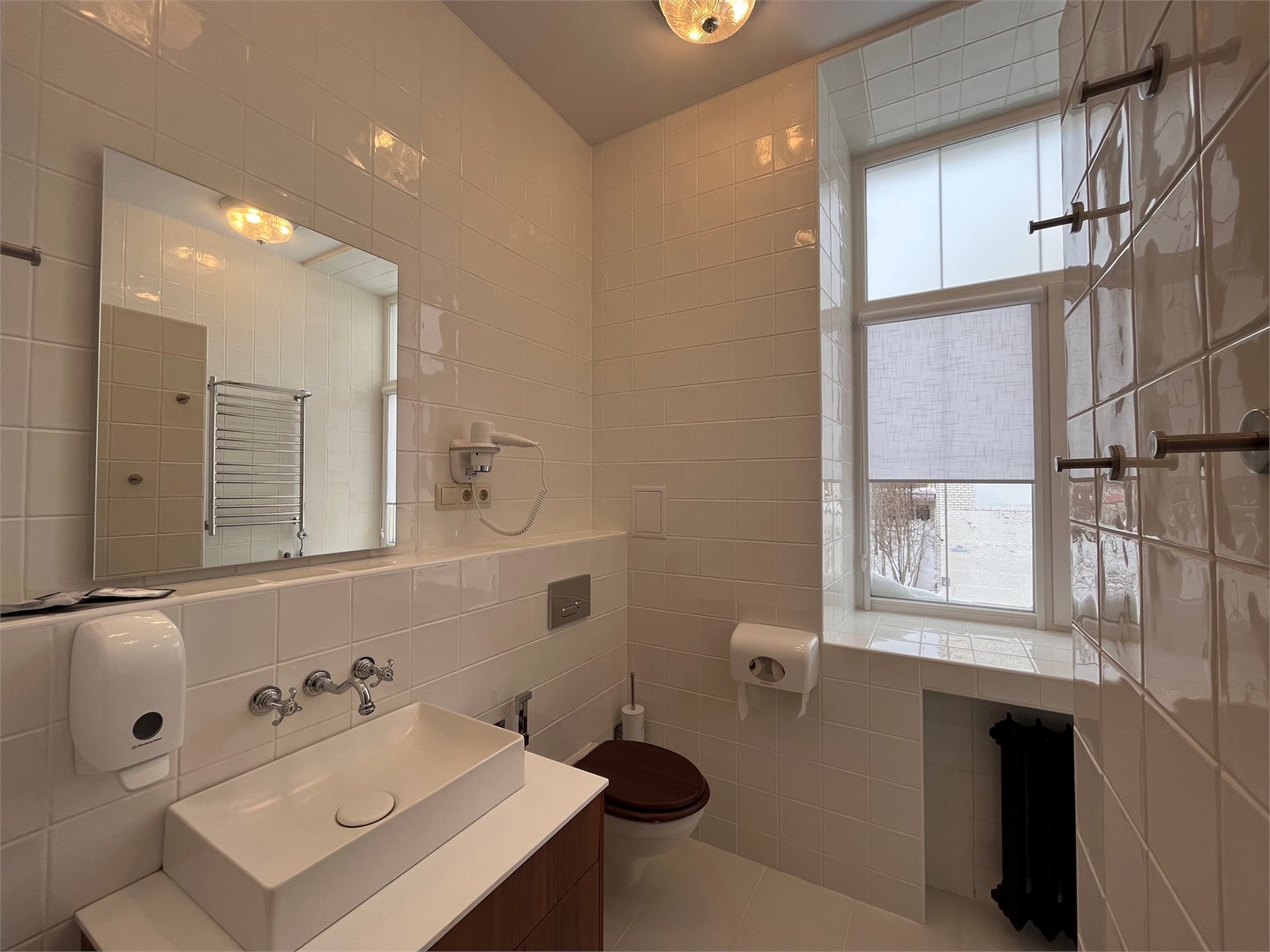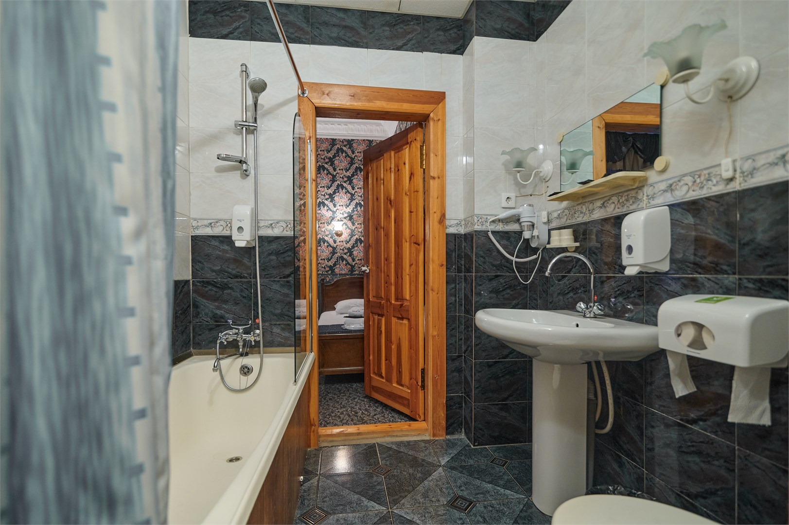 Санузел: с ванной, тапочки, туалетные принадлежности, фен