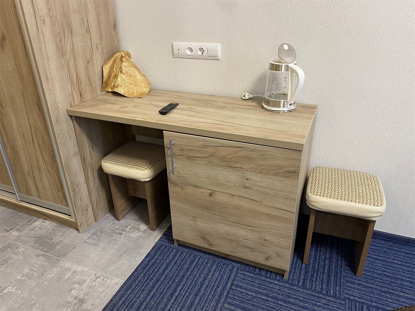 В номере: вешалка, зеркало, кровати односпальные, прикроватные тумбочки, стол, стулья, шкаф, телевизор, чайный набор посуды, электрочайник
