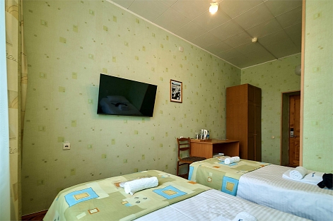 В номере: вешалка, зеркало, кровати односпальные /одна двуспальная кровать, прикроватные тумбочки, стол, стулья, шкаф, мини-холодильник, телевизор, чайный набор посуды, электрочайник