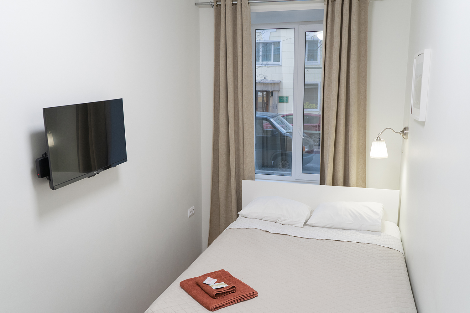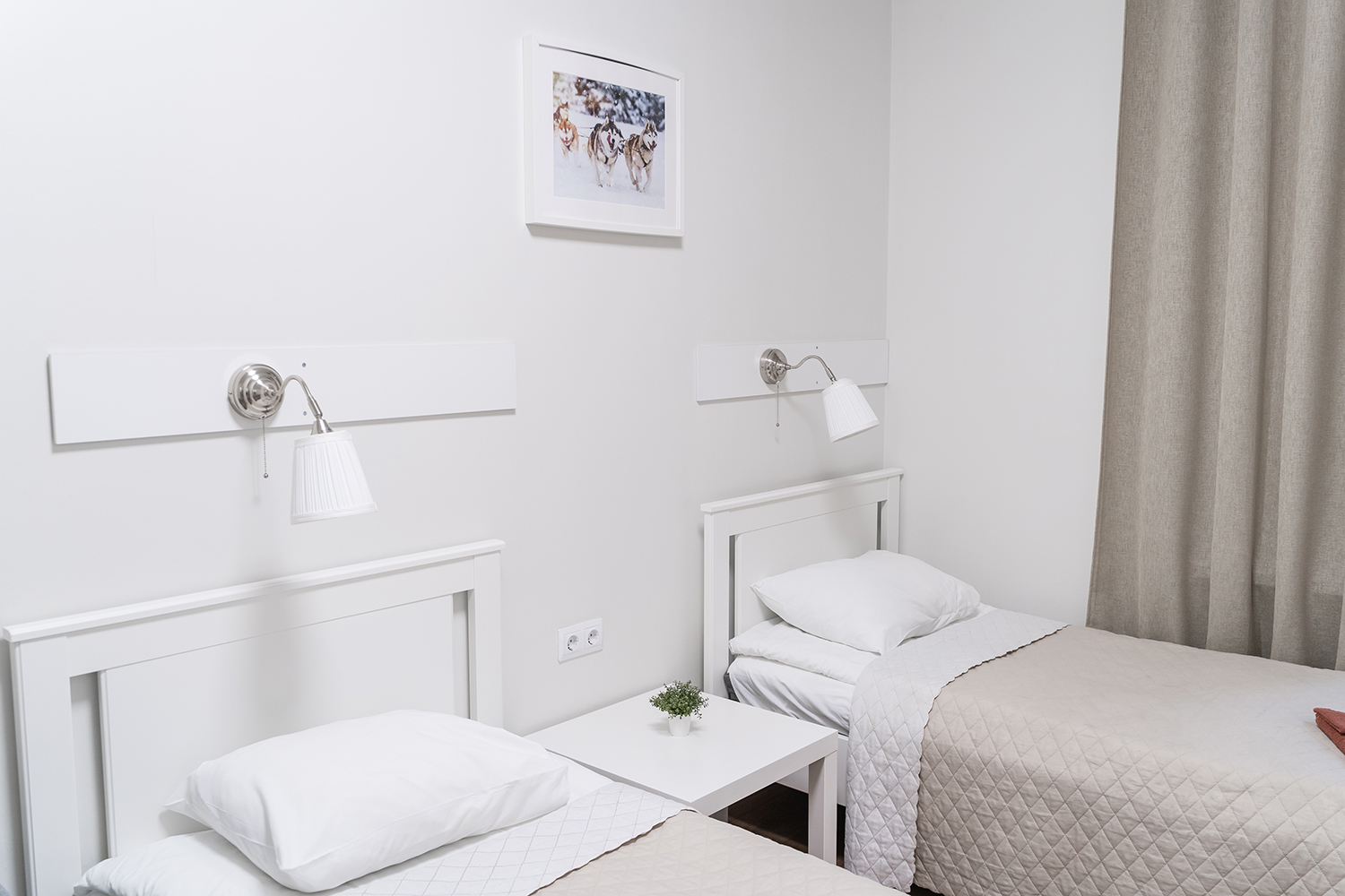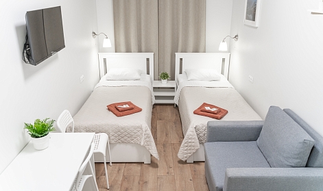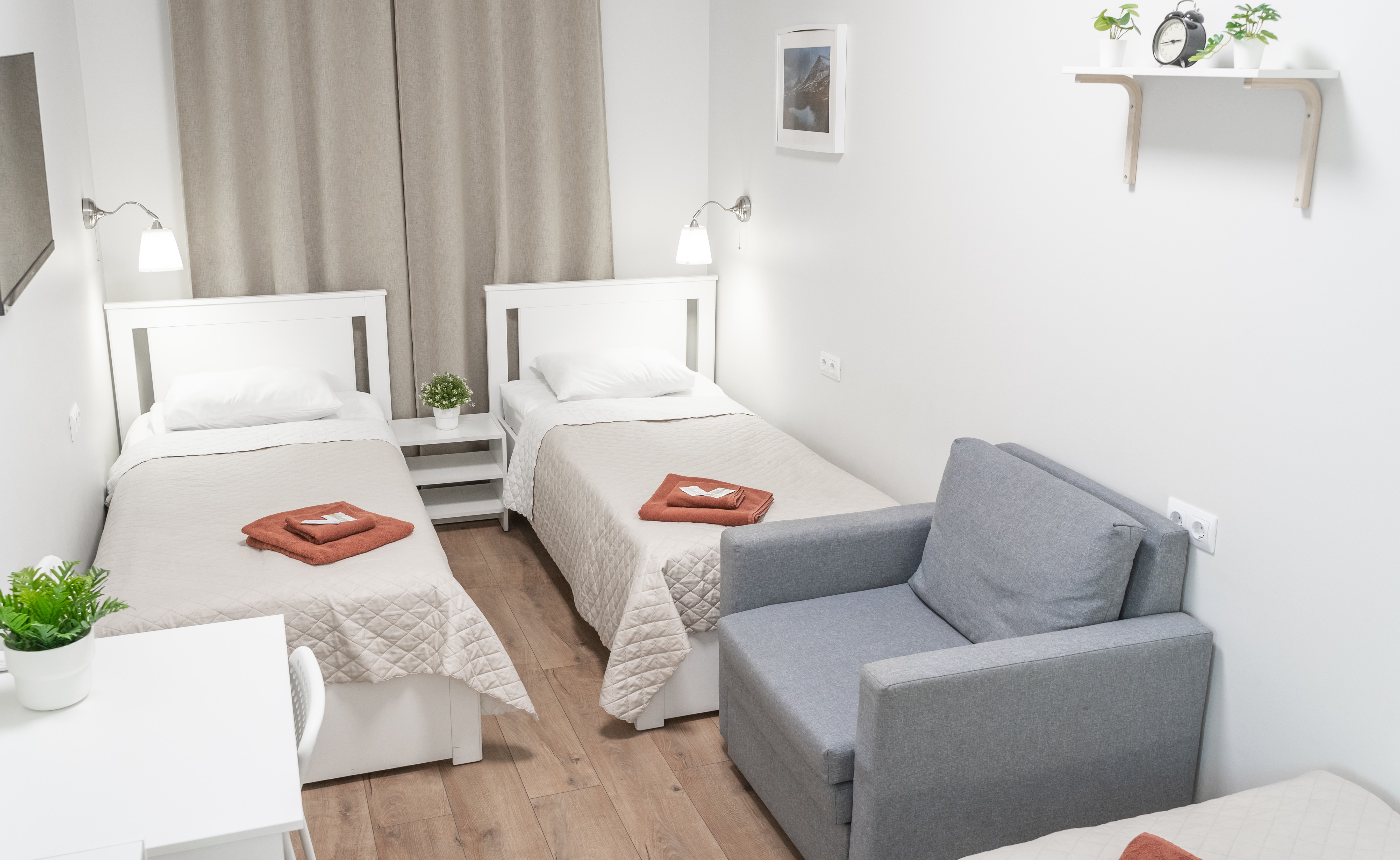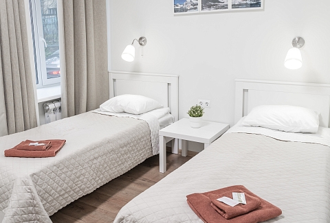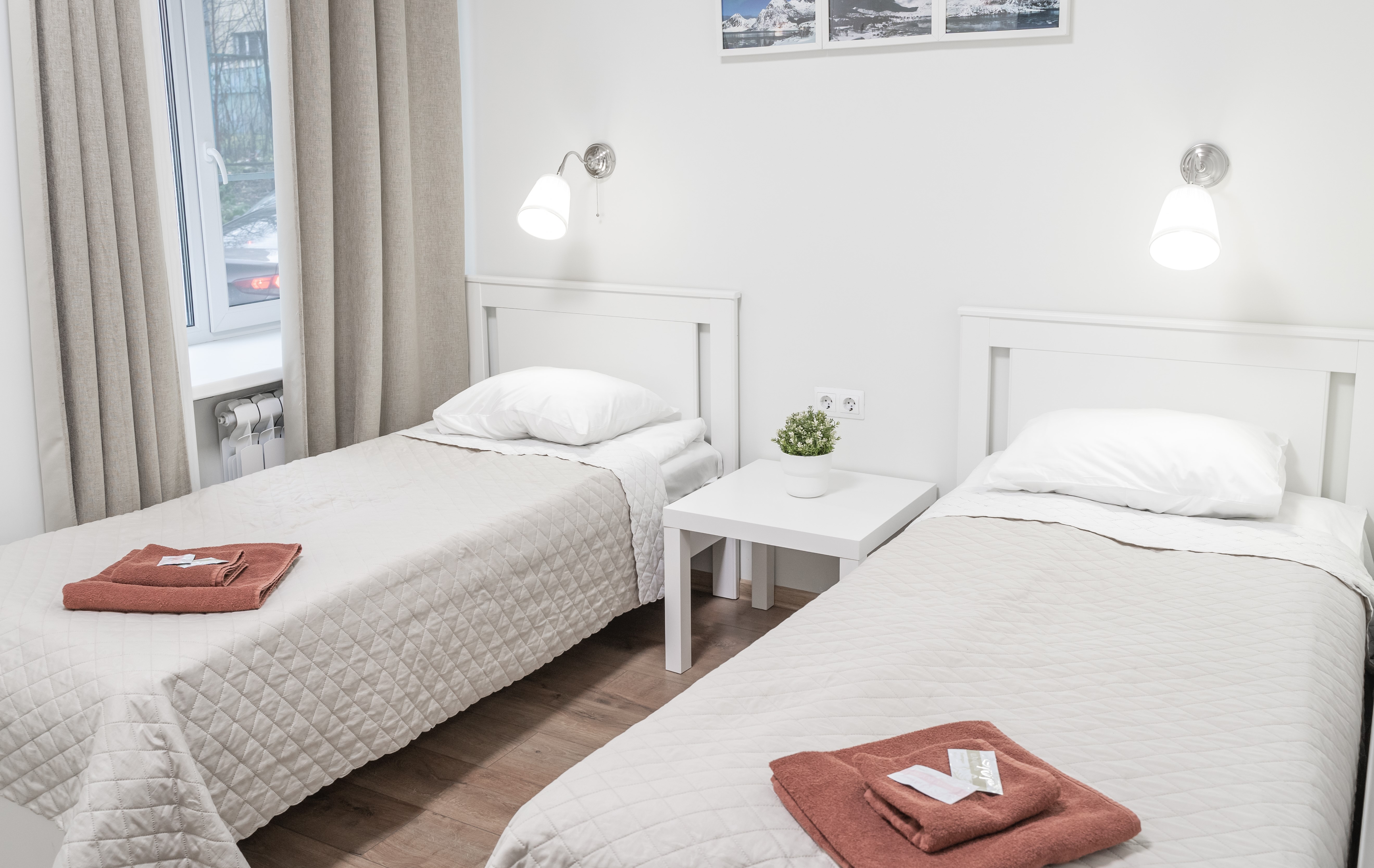 В распоряжении гостей стандартные номера разные по площади и вместимости. В некоторых номерах санузел общий и находится на этаже, в других есть собственная ванная комната. Также во всех номерах имеются плазменный телевизор и рабочий стол. Для удобства отдыхающих в отеле предусмотрена общая кухня, оснащенная посудой и необходимой техникой: есть холодильник, электрическая плита, микроволновая печь. Как в номерах, так и в общих зонах доступен беспроводной интернет.