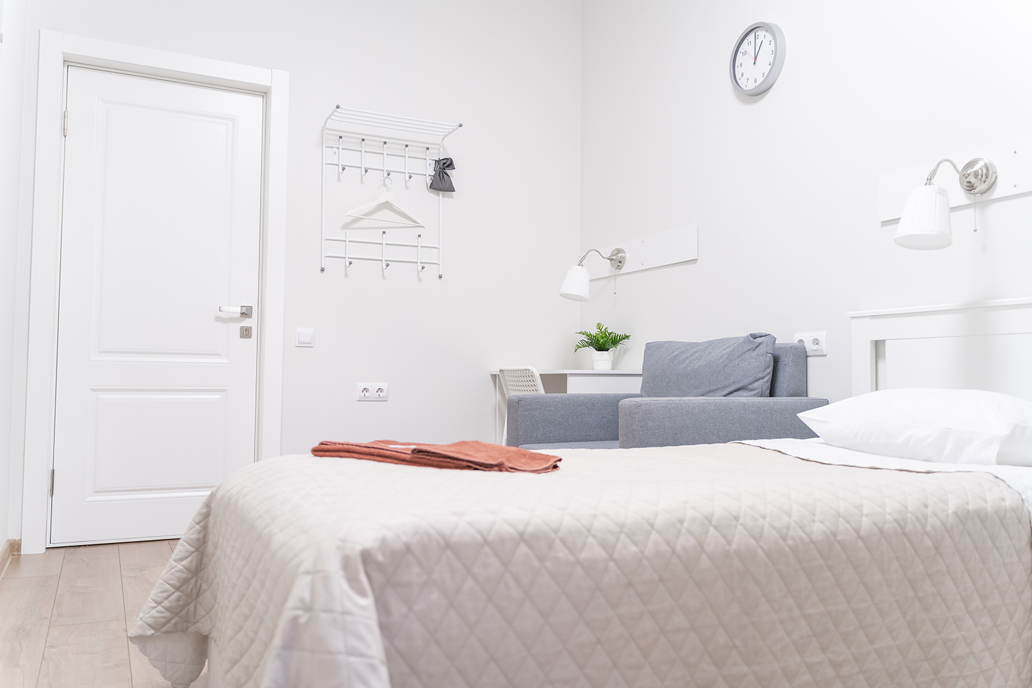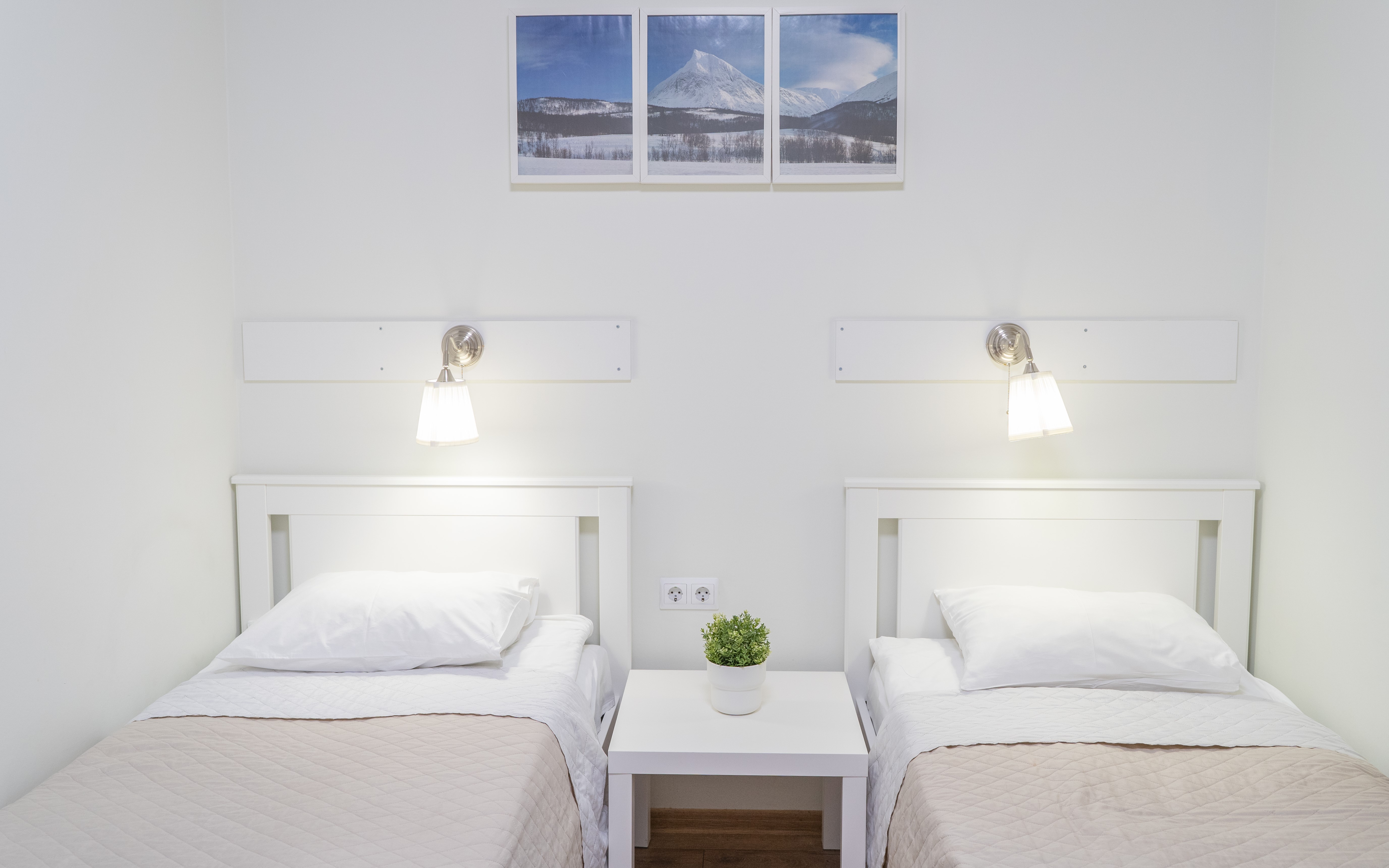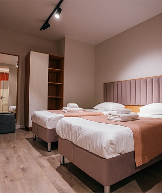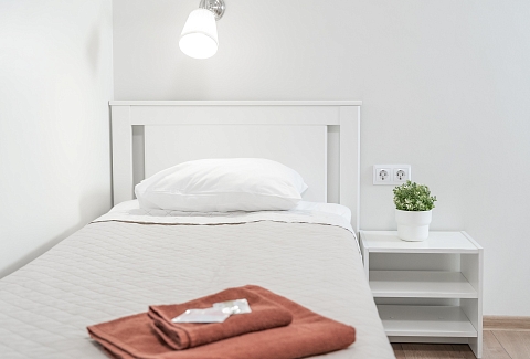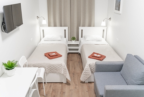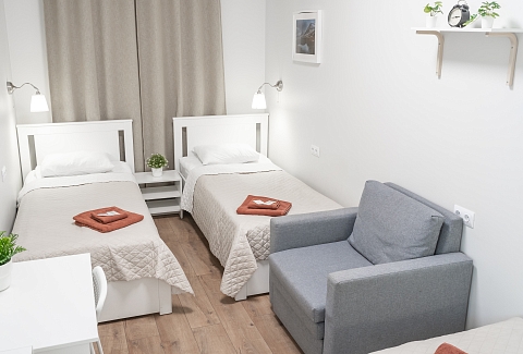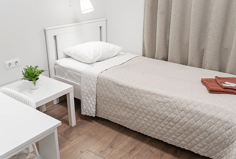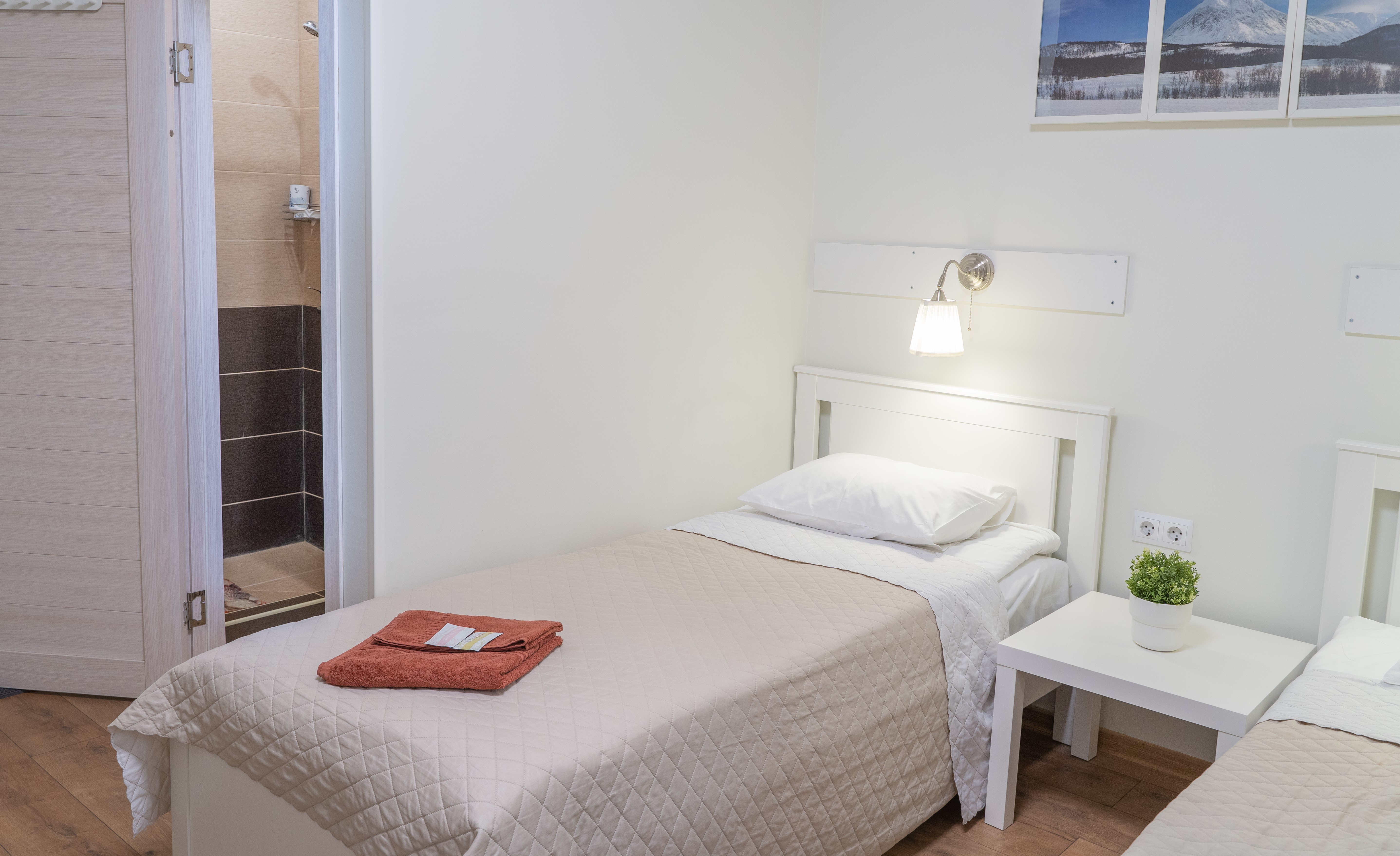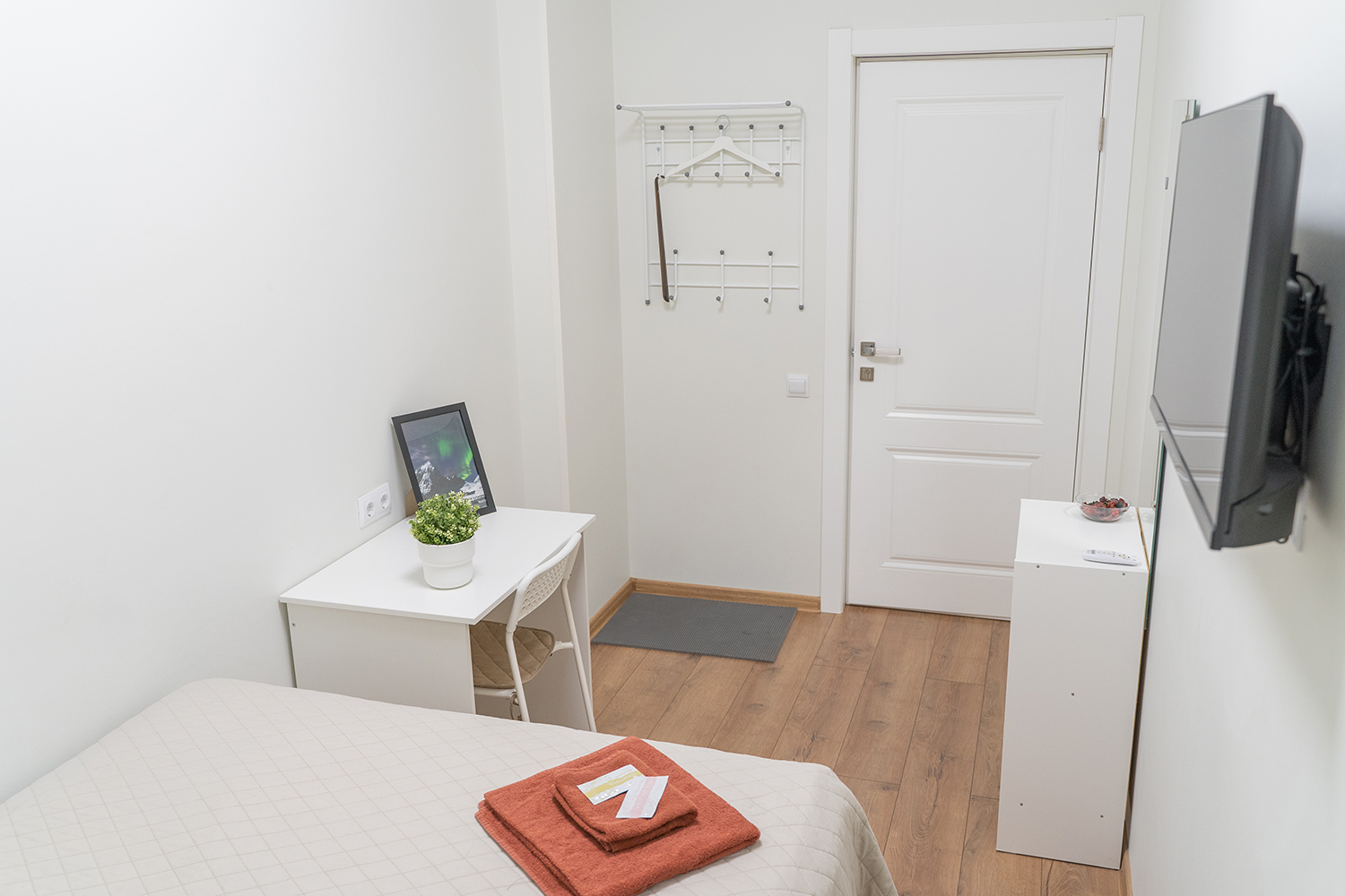 В распоряжении гостей стандартные номера разные по площади и вместимости. В некоторых номерах санузел общий и находится на этаже, в других есть собственная ванная комната. Также во всех номерах имеются плазменный телевизор и рабочий стол. Для удобства отдыхающих в отеле предусмотрена общая кухня, оснащенная посудой и необходимой техникой: есть холодильник, электрическая плита, микроволновая печь. Как в номерах, так и в общих зонах доступен беспроводной интернет.
