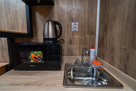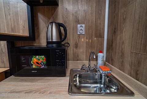 В номере: кровати односпальные, кухонная мебель, стол, тумба, микроволновая печь, набор посуды, телевизор ЖК, электрочайник