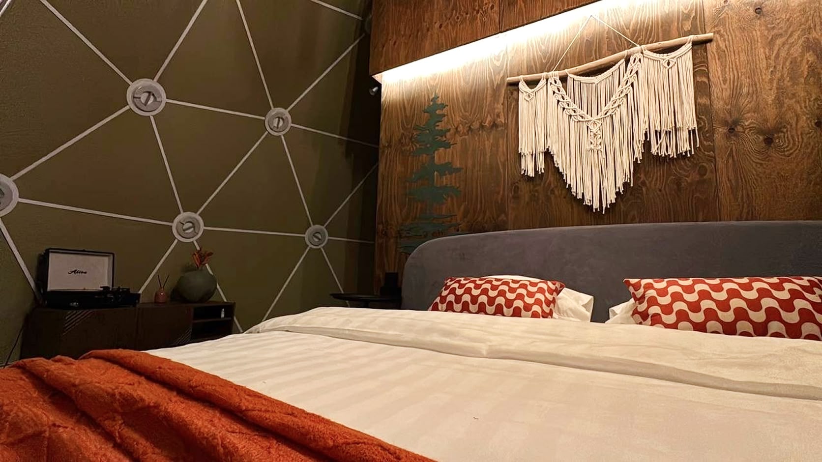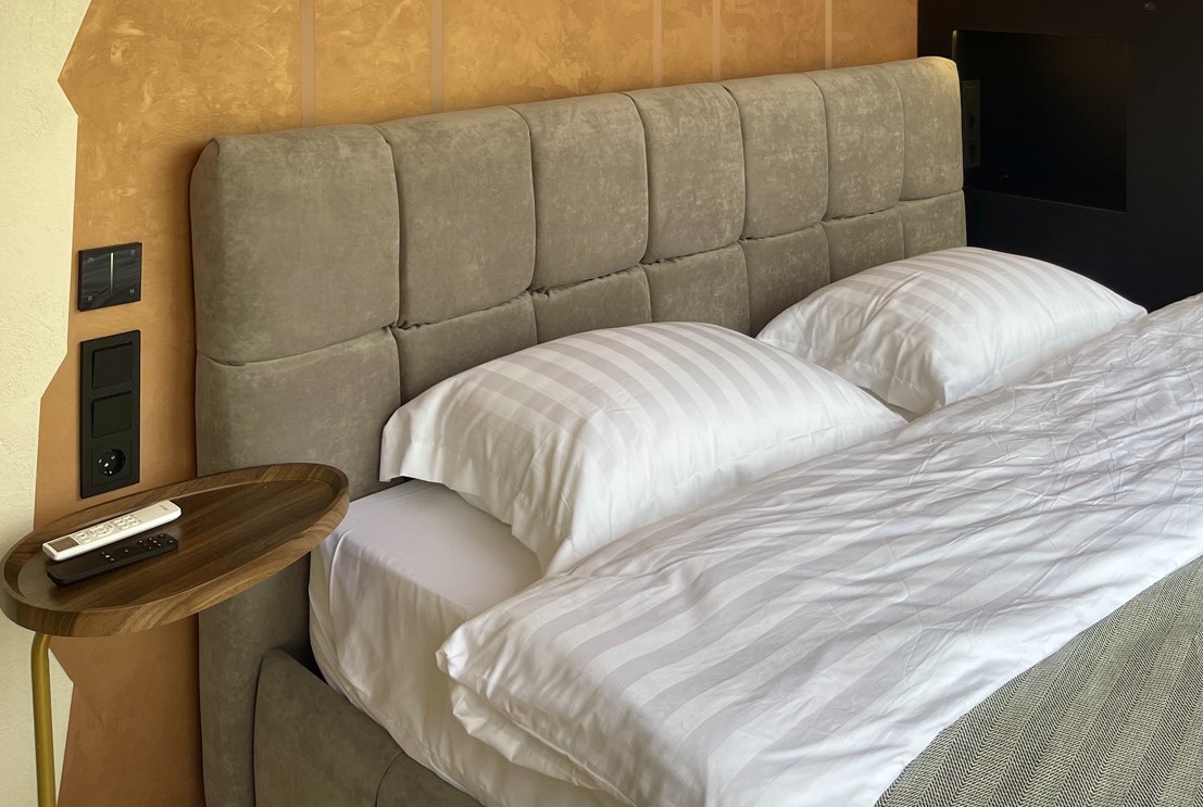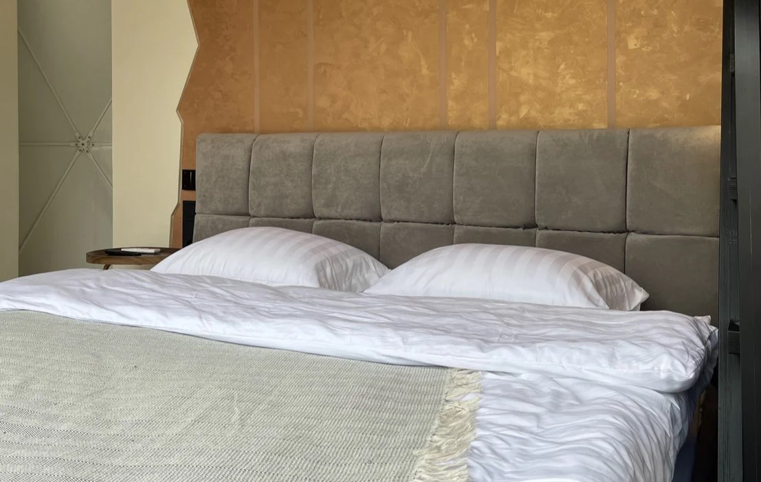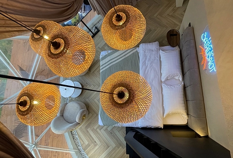 В номере: кресла, кровать двуспальная, матрас, прикроватный столик, стеллаж, стол, кондиционер, микроволновая печь, мини-холодильник, набор посуды, плита электрическая, телевизор, теплый пол, умная колонка, электрочайник