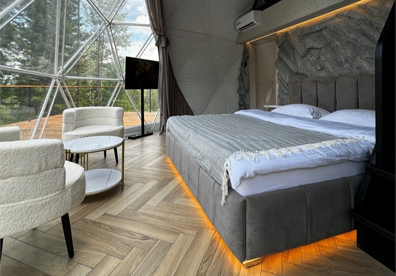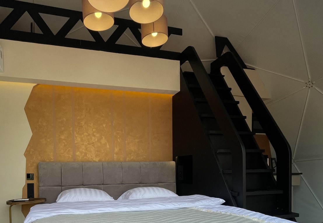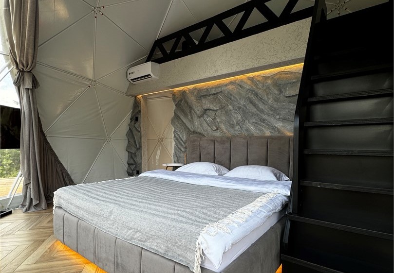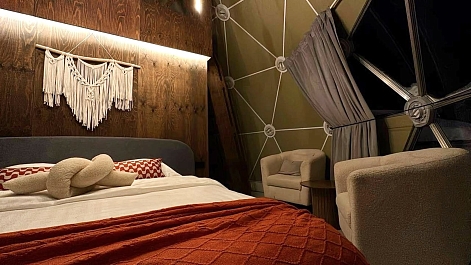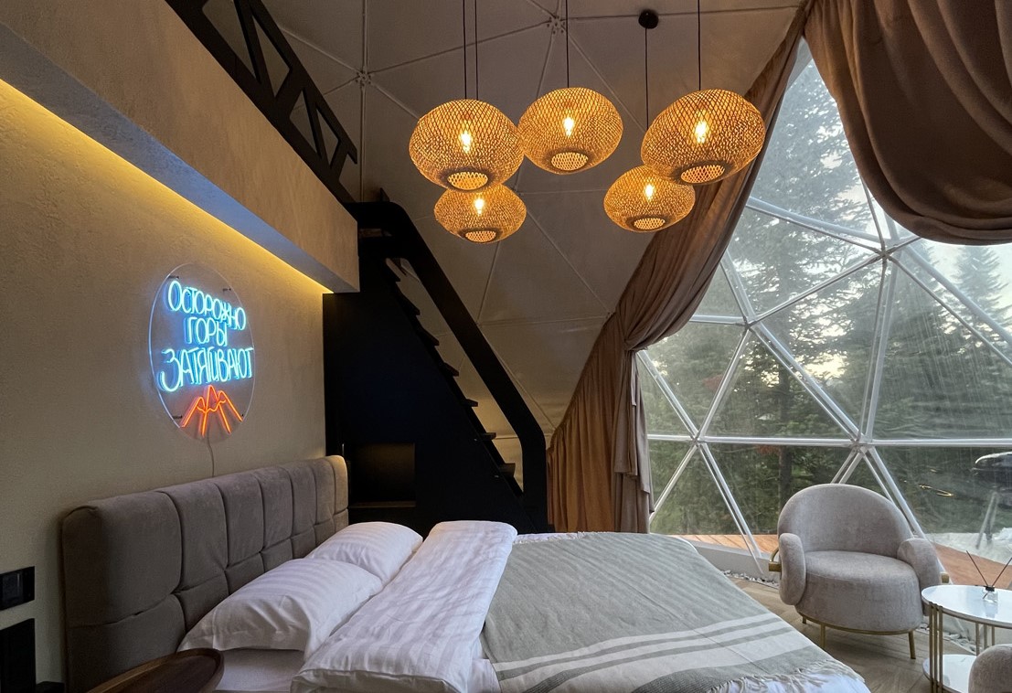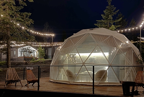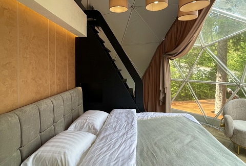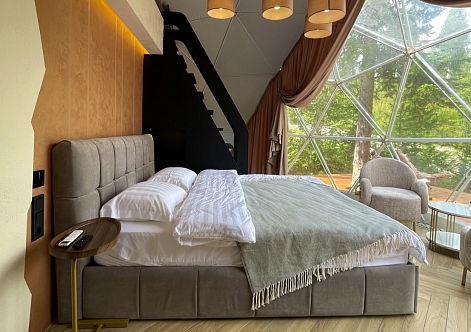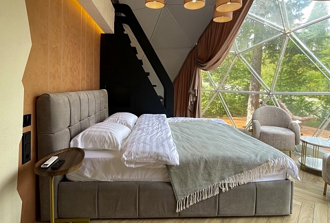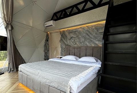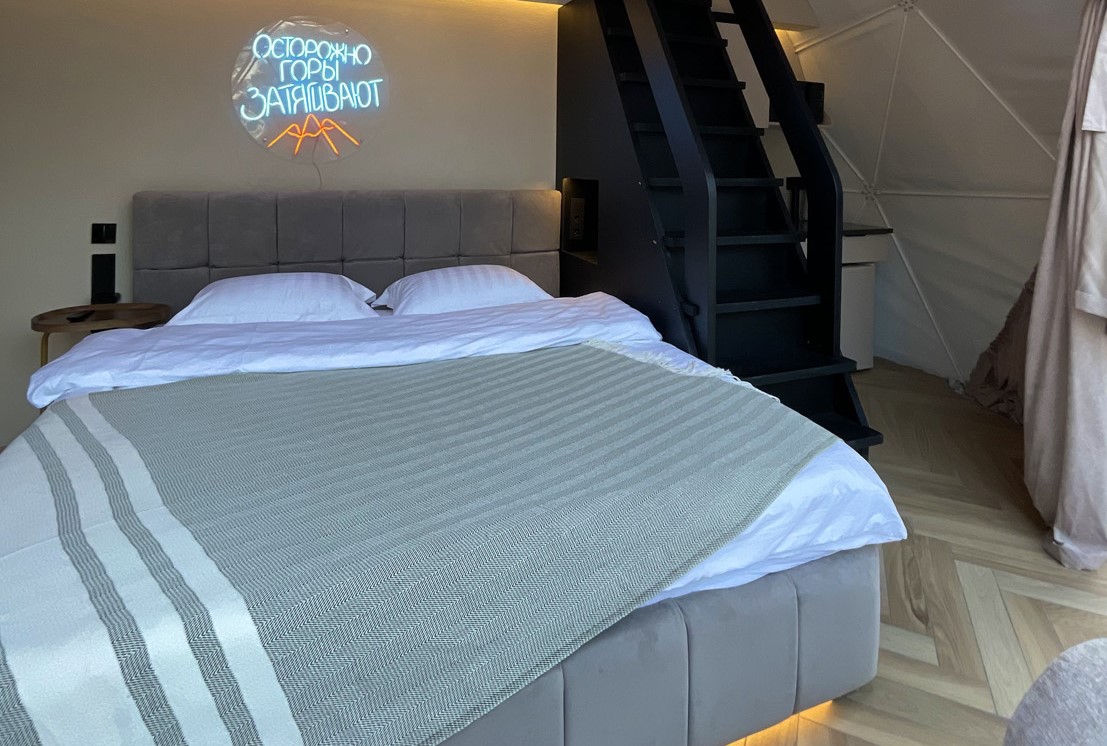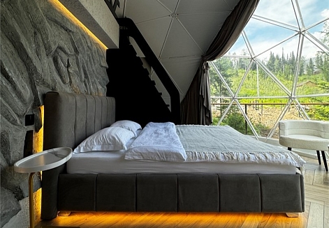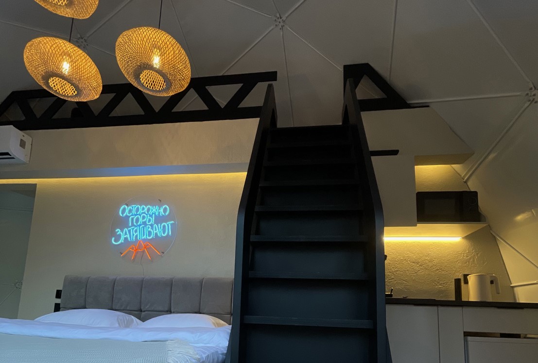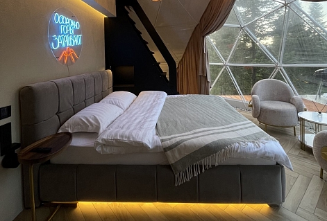 В самом поселке неплохо развита инфраструктура, работают продуктовые магазины, аптеки, кафе. Ближайший крупный город - Новокузнецк - в 2,5 часах пути, там же расположен железнодорожный вокзал и аэропорт. Отель представляет собой комплекс уютных купольных домов, расположенных в окружении природы. Каждая купольная сфера сочетает в себе современный стиль и природную эстетику, создавая гармоничное пространство для проживания. В домах предусмотрено все, что нужно для проживания – теплый пол, кондиционер, удобные двуспальные кровати на первом и втором ярусе, оборудованная мини-кухня с посудой, набором столовых принадлежностей, холодильником и плитой; персональные санузлы с душевыми кабинами, туалетными принадлежностями, фенами и пушистыми полотенцами. Для дополнительного удобства установлена Яндекс Станция и доступ к безлимитному wi-fi. Во всех домах - терраса с креслами и гриль-зоной. На территории работает открытый бассейн с подогревом. Для личного транспорта гостей предусмотрена парковка. Для отдыхающих с детьми до года по запросу в номер можно установить кроватку-манеж. Также в отеле будут рады гостям с воспитанными домашними питомцами мелких пород, их пребывание согласовывается заранее.