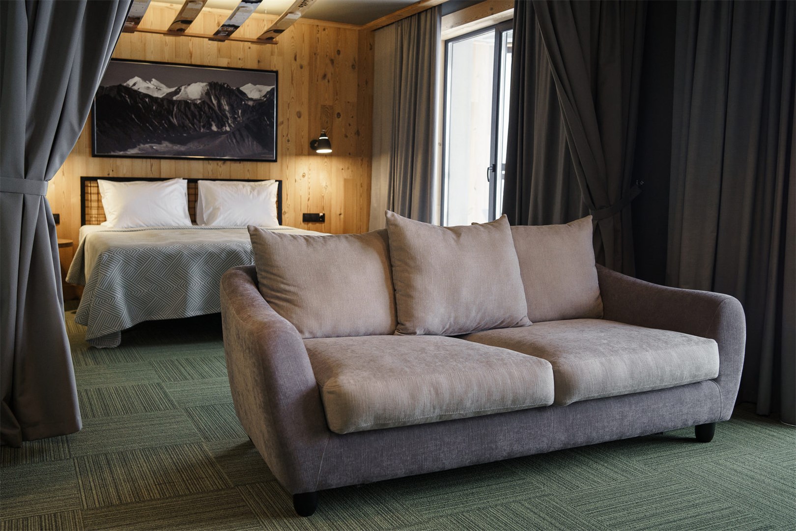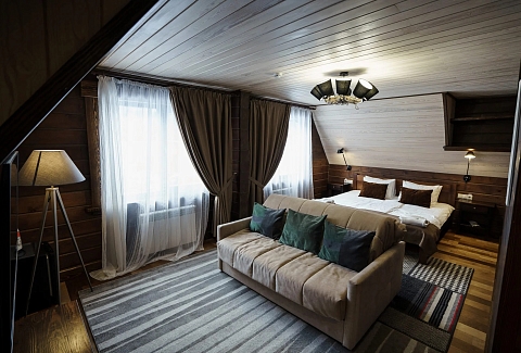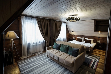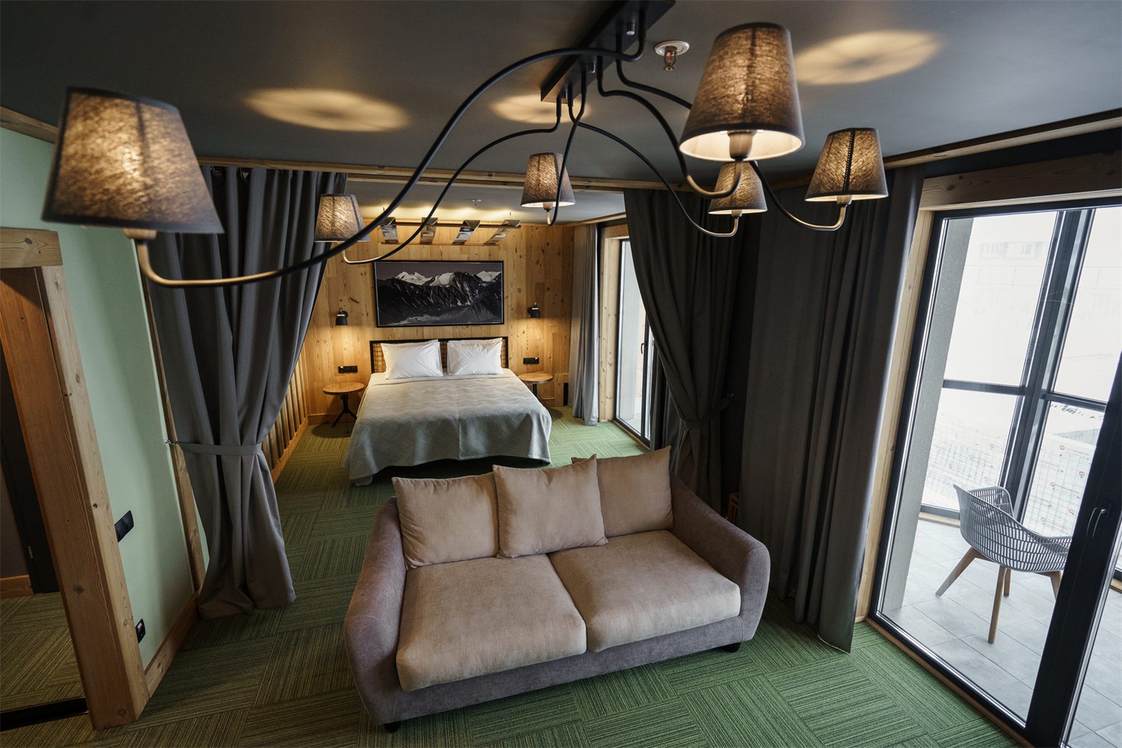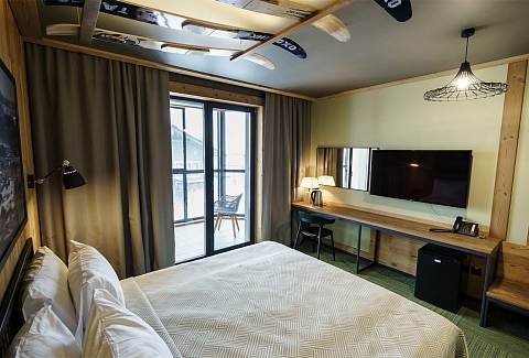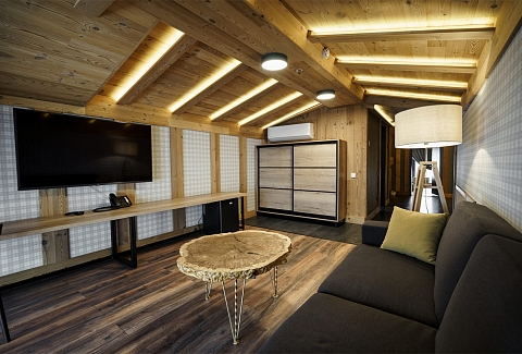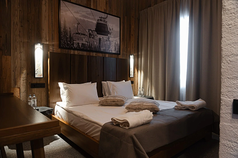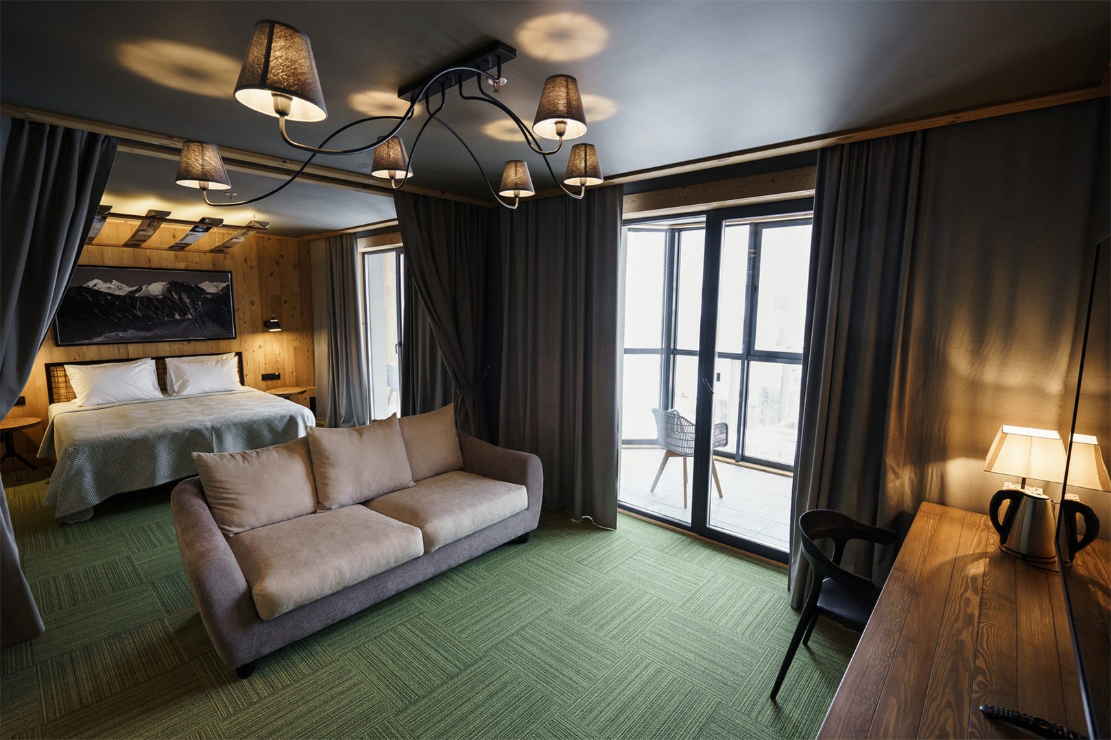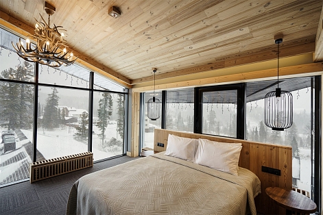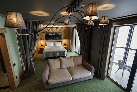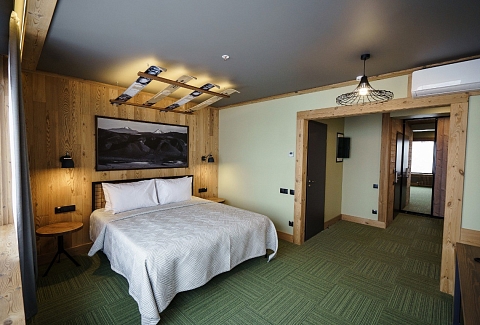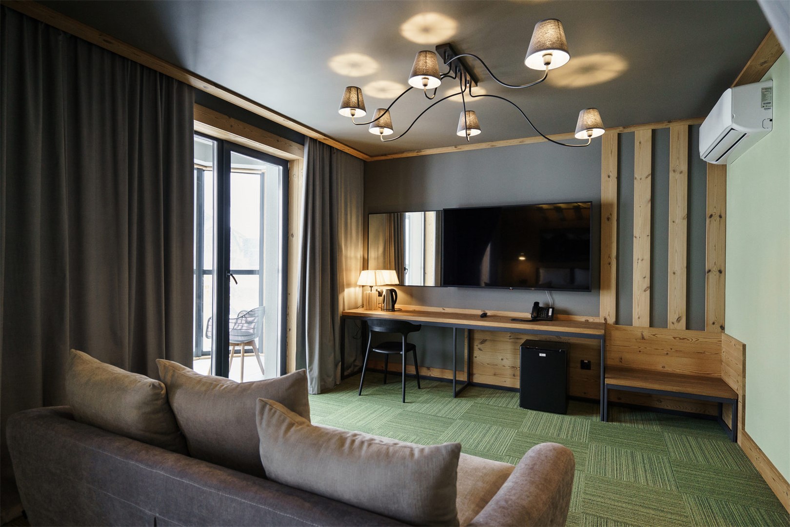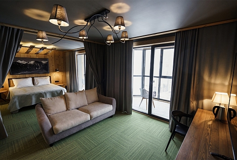 В номере: диван раскладной, кресла, кровать двуспальная, прикроватные тумбочки, стол, стулья, шкаф, кофемашина, лыжехранилище, микроволновая печь, набор посуды, плита электрическая, сейф, телевизор, холодильник, электрочайник