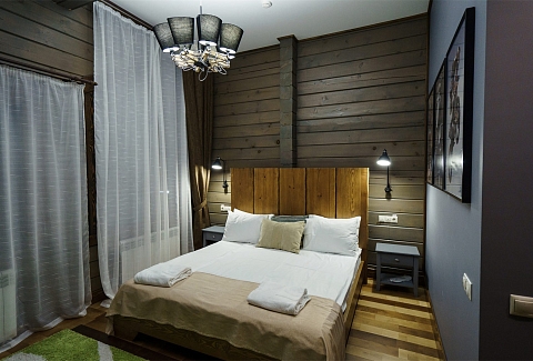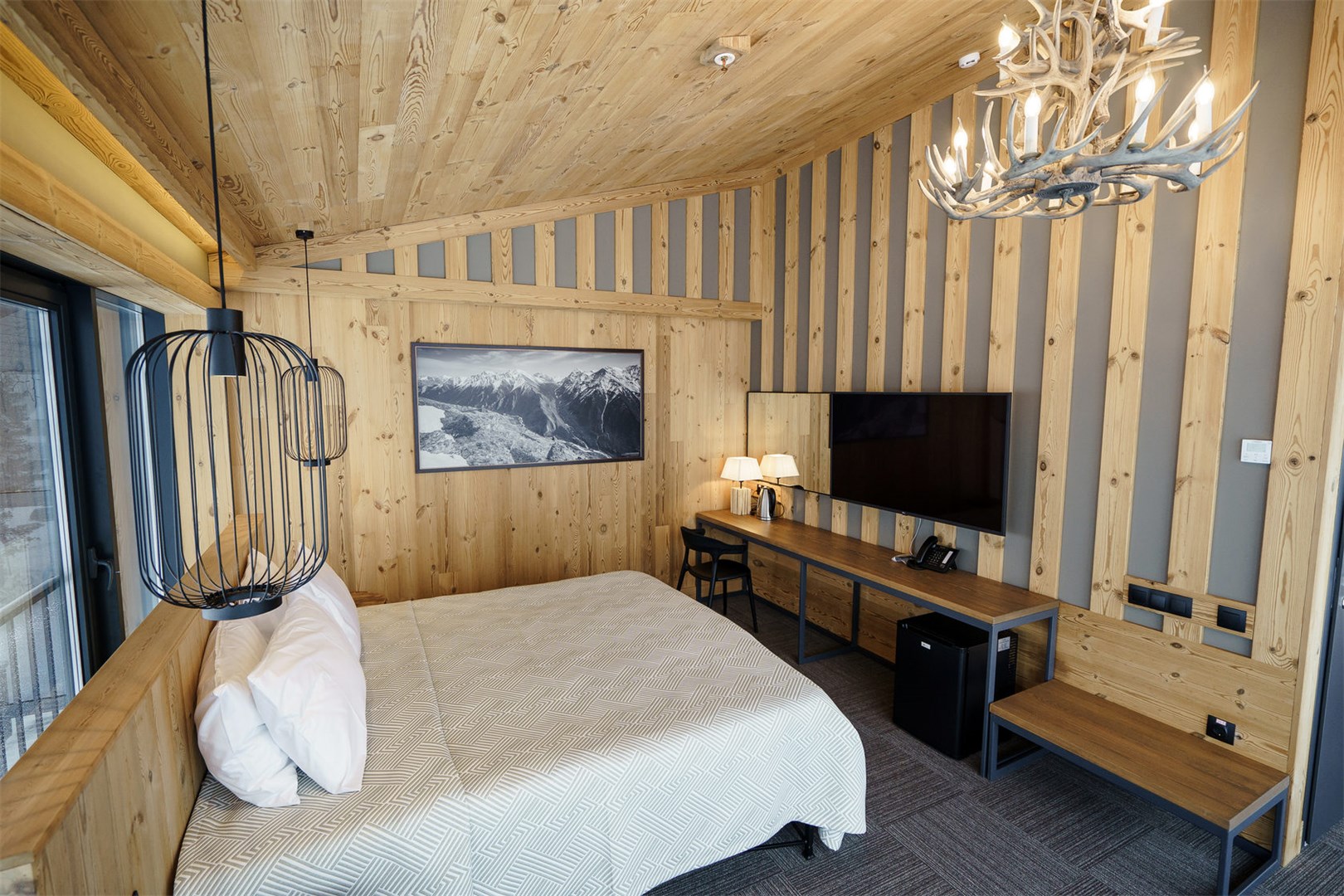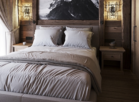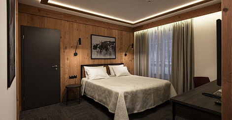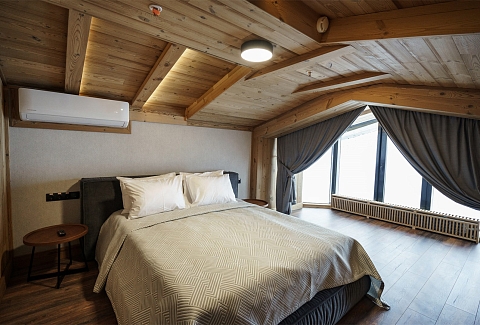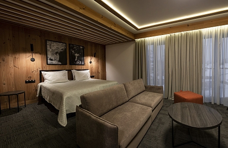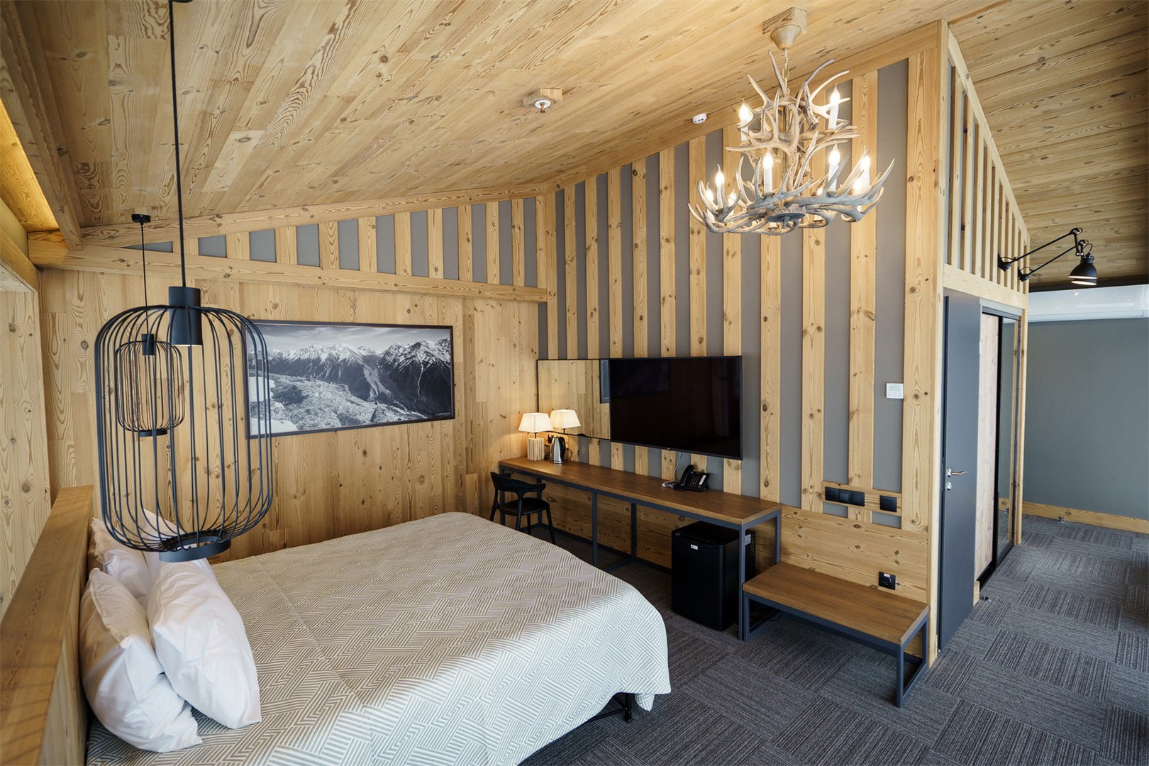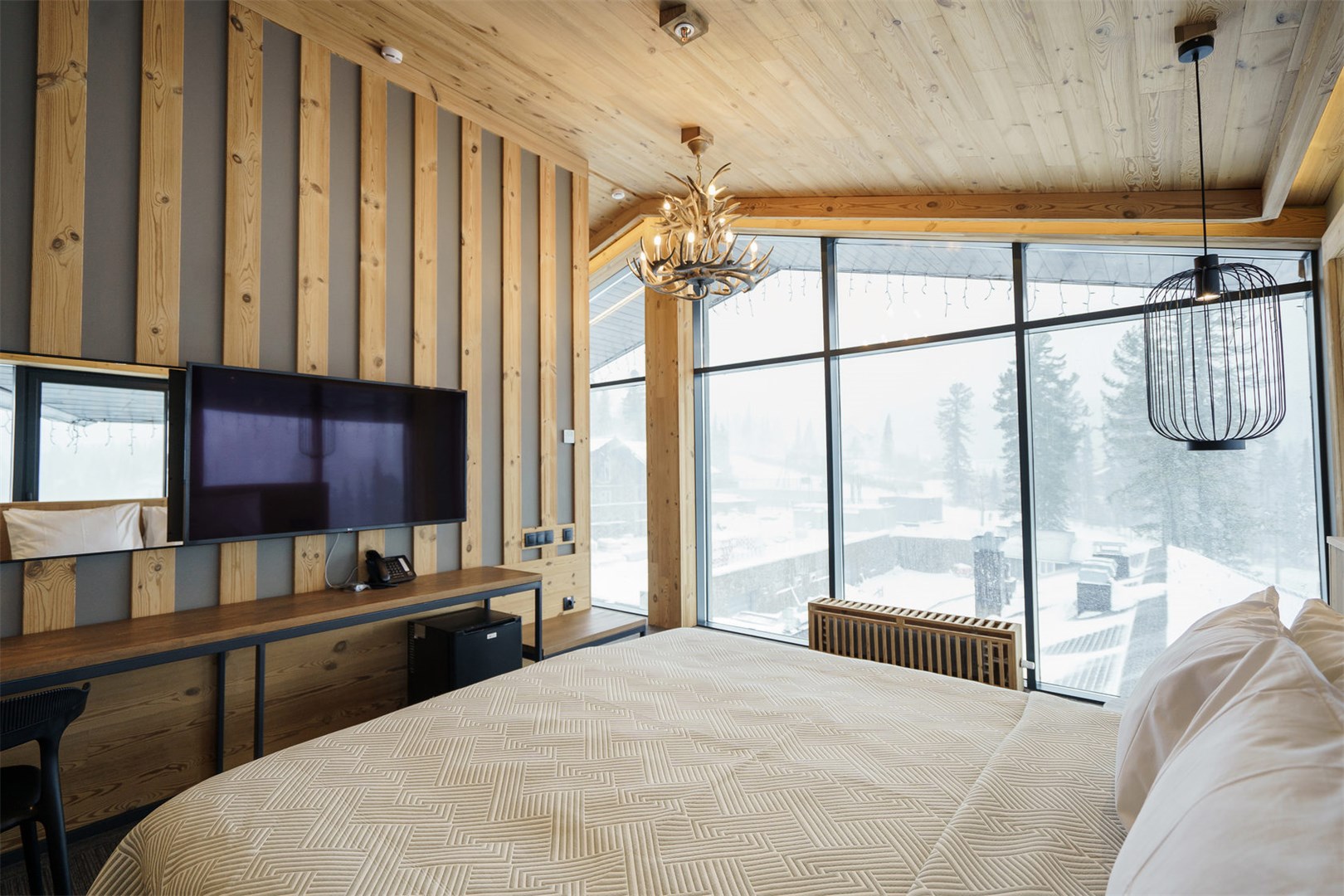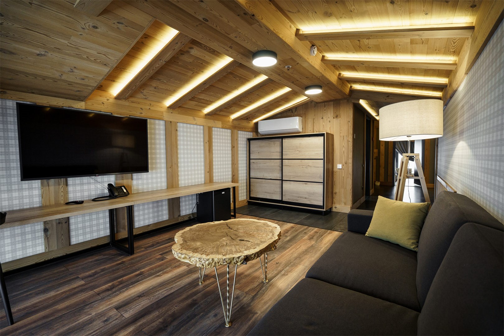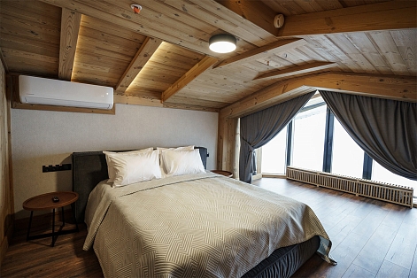 В номере: диван раскладной, кресла, кровать двуспальная, прикроватные тумбочки, стол, стулья, шкаф, кофемашина, лыжехранилище, микроволновая печь, набор посуды, плита электрическая, сейф, телевизор, холодильник, электрочайник