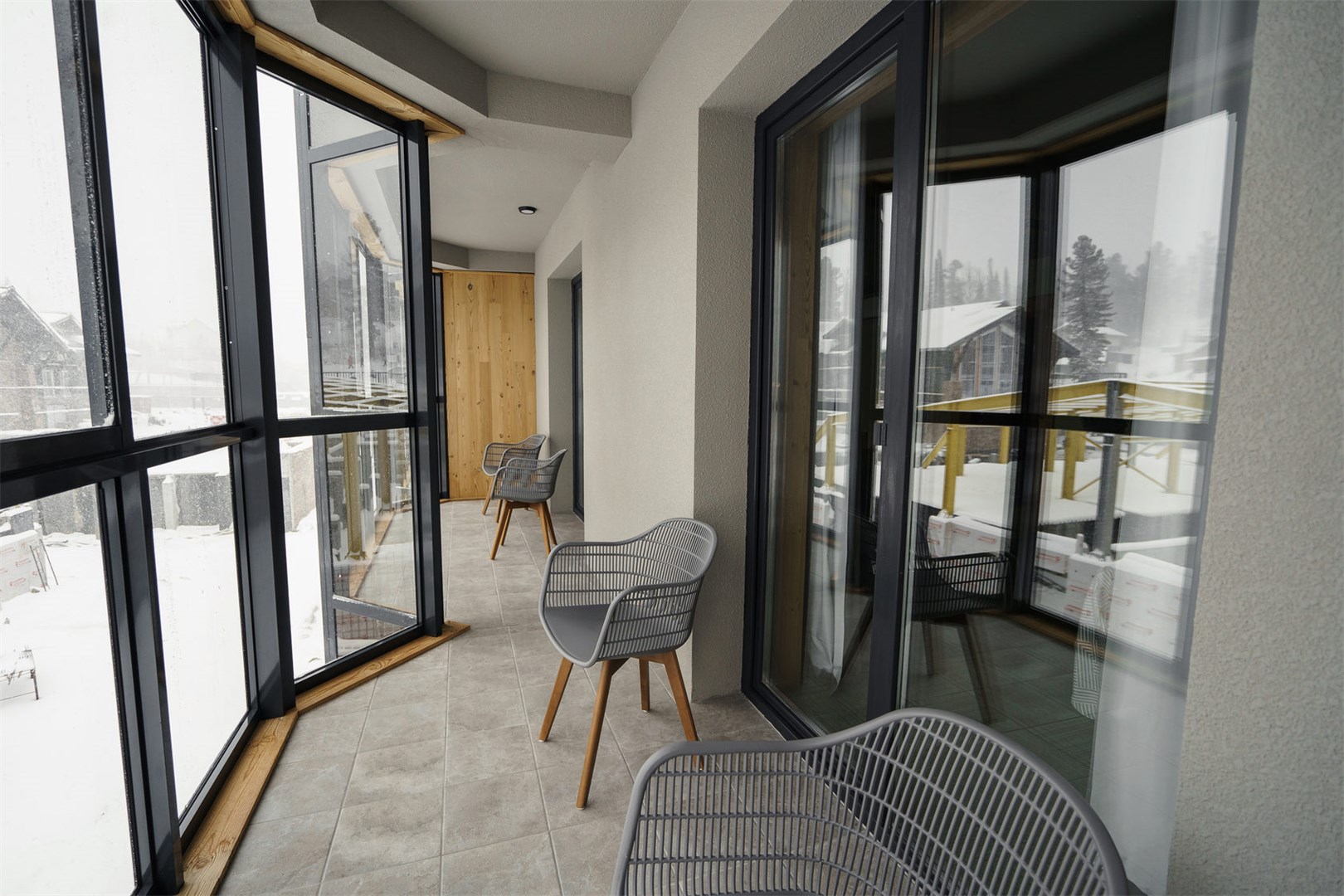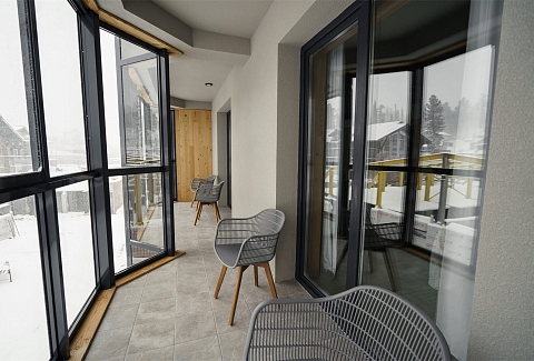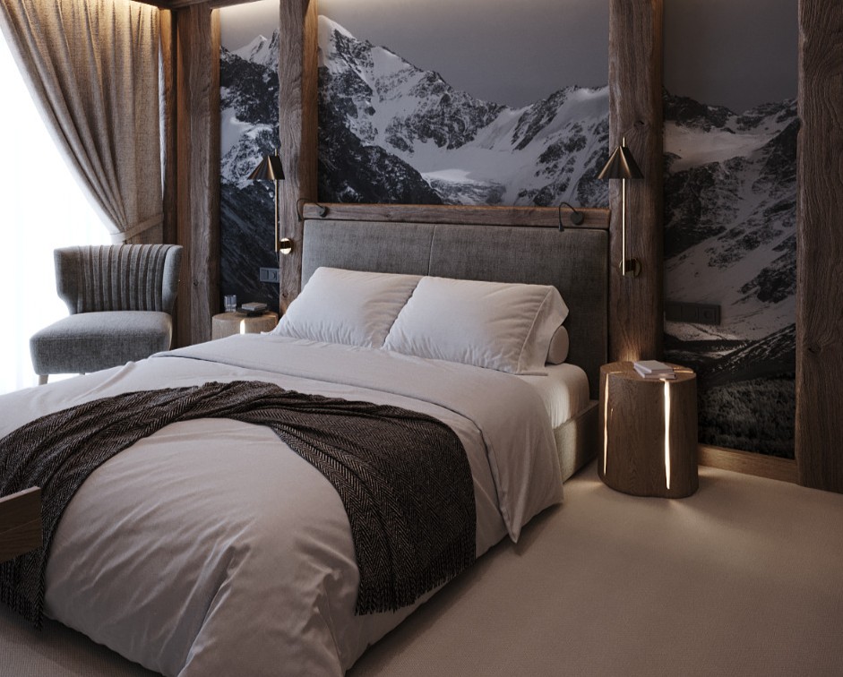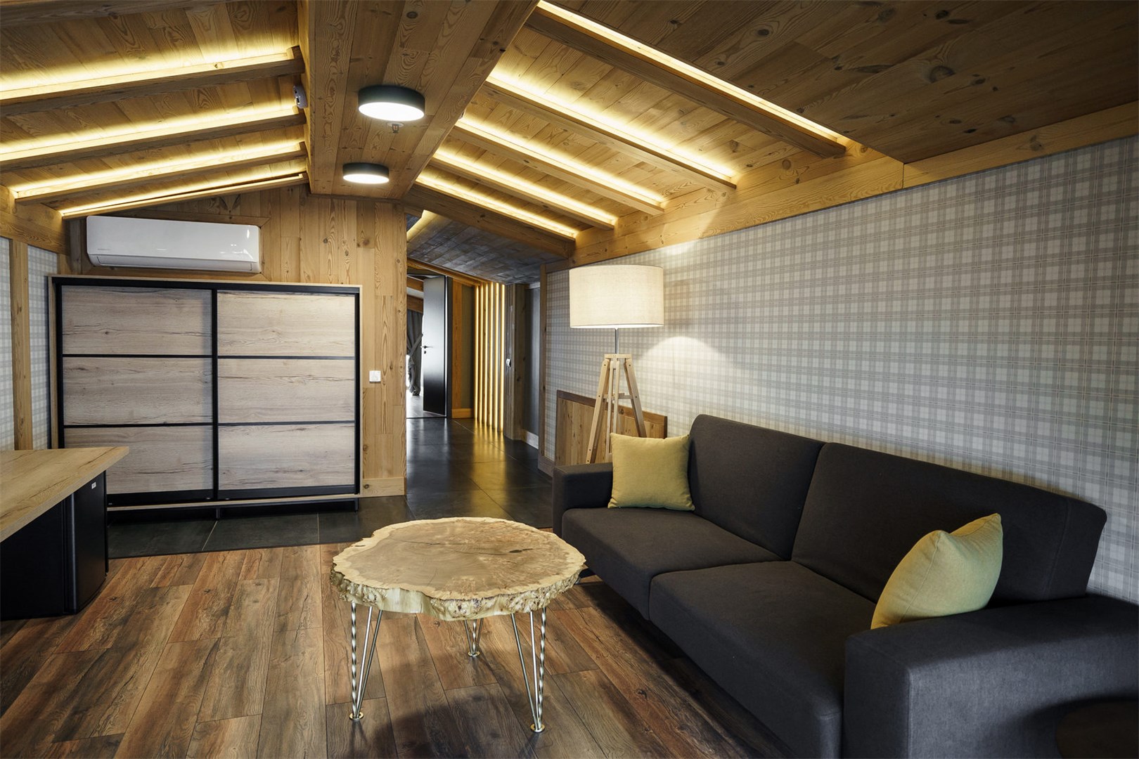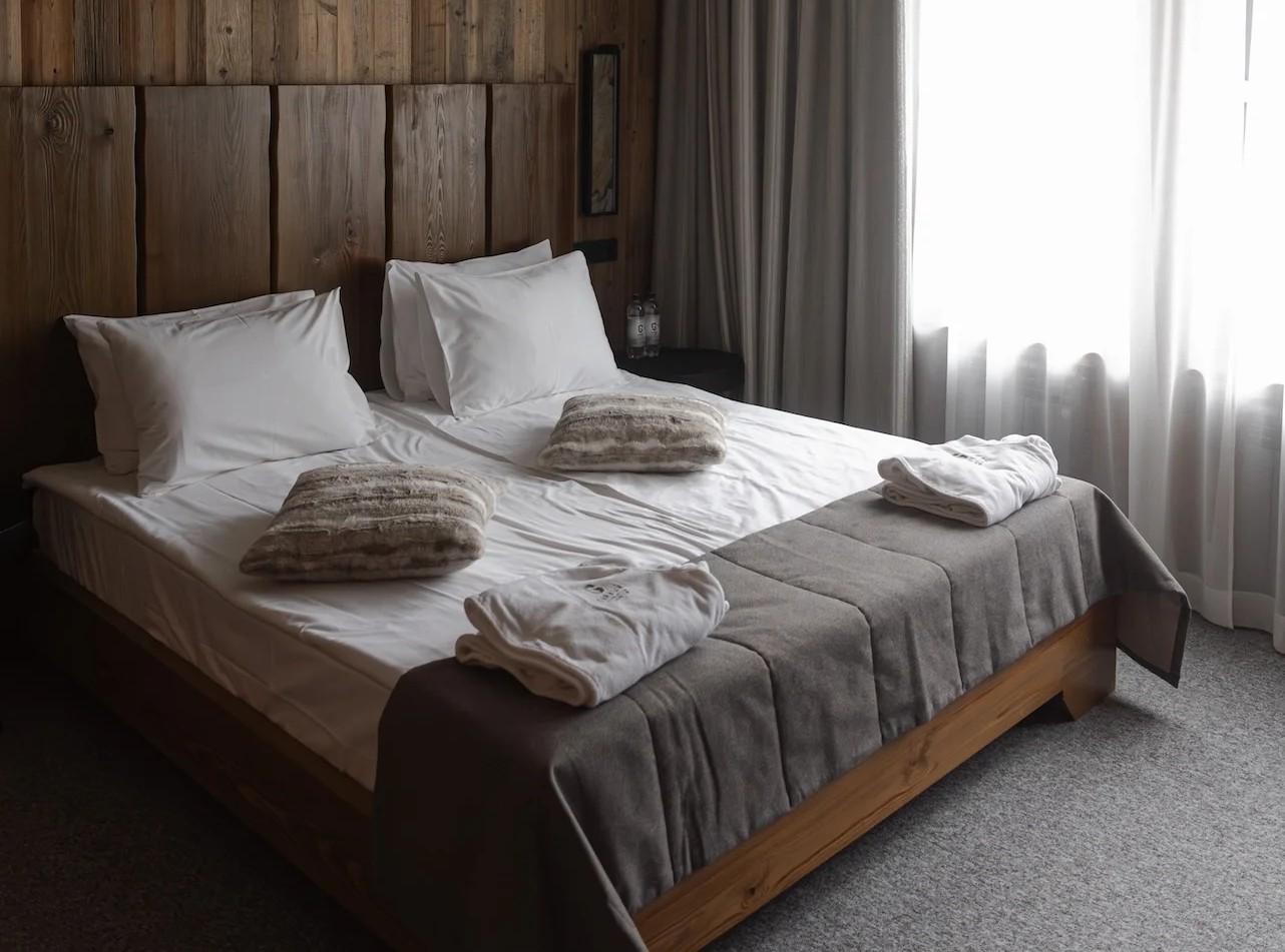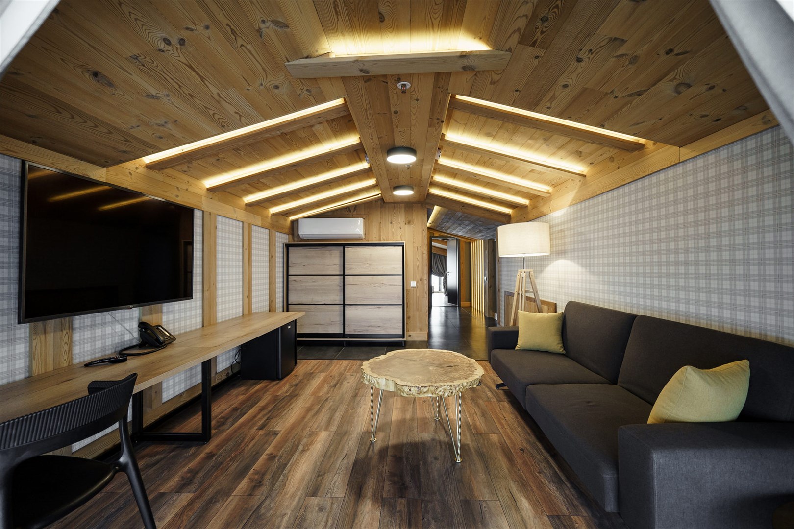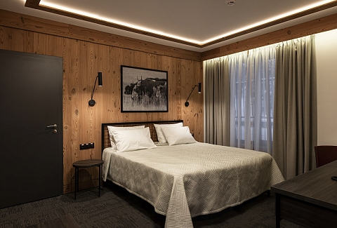 В номере: диван раскладной, кресла, кровать двуспальная, прикроватные тумбочки, стол, стулья, шкаф, кофемашина, лыжехранилище, микроволновая печь, набор посуды, плита электрическая, сейф, телевизор, холодильник, электрочайник