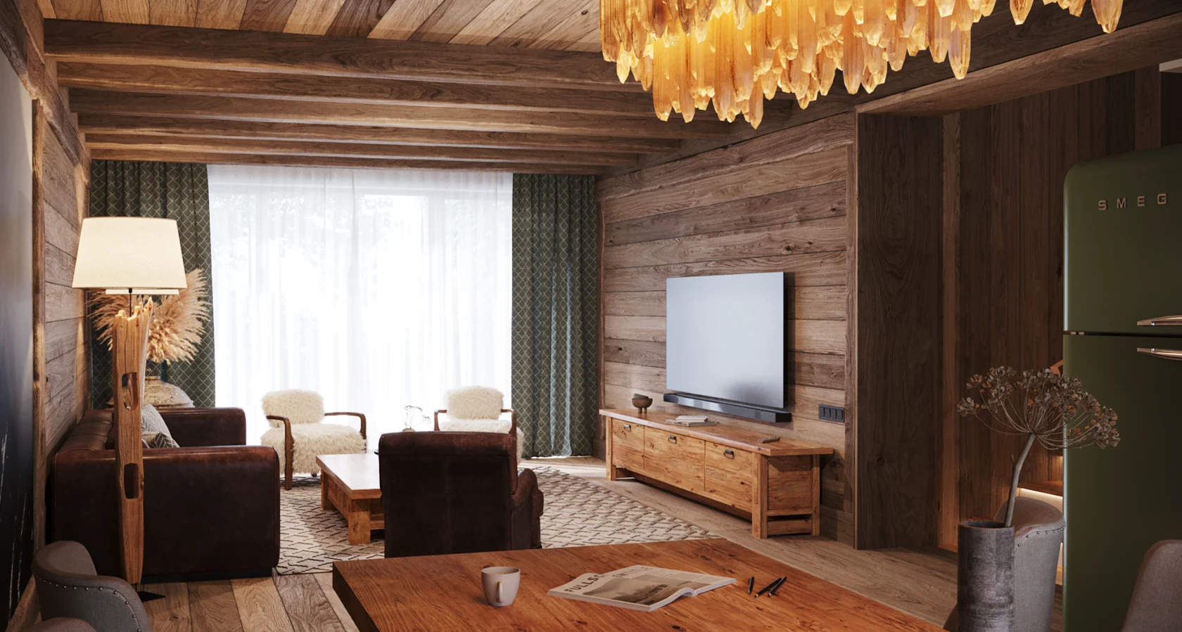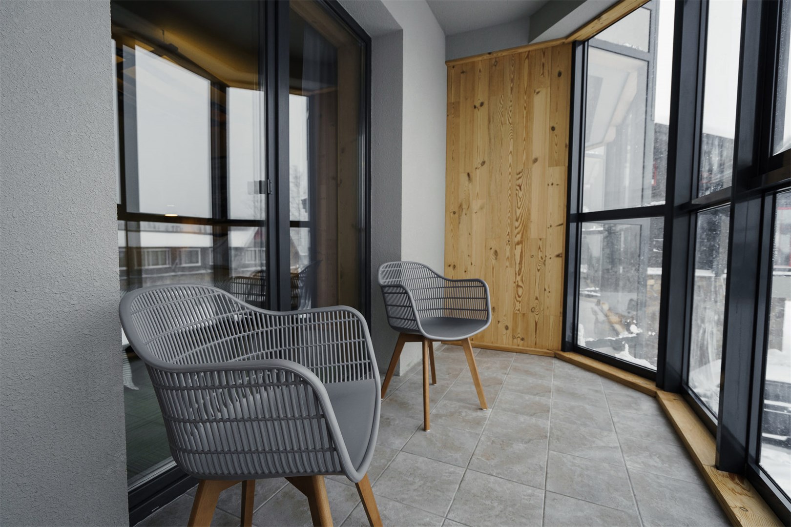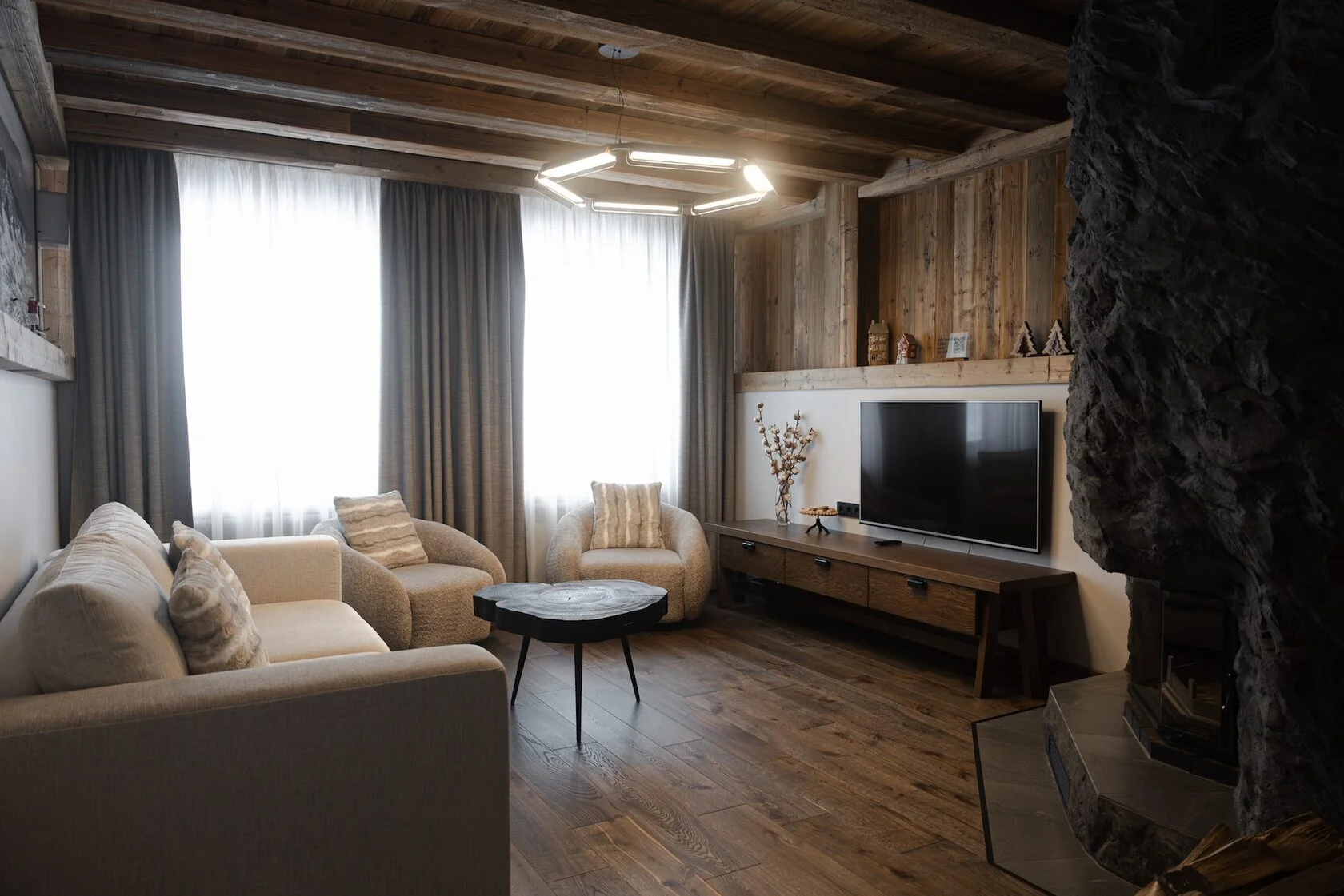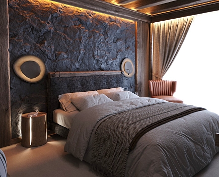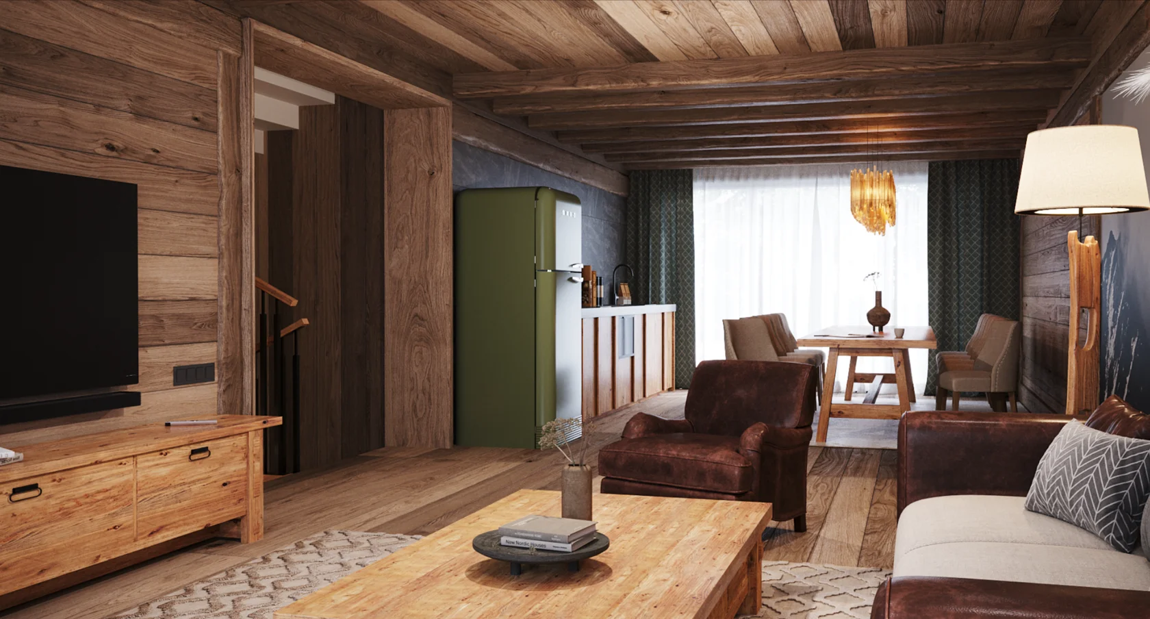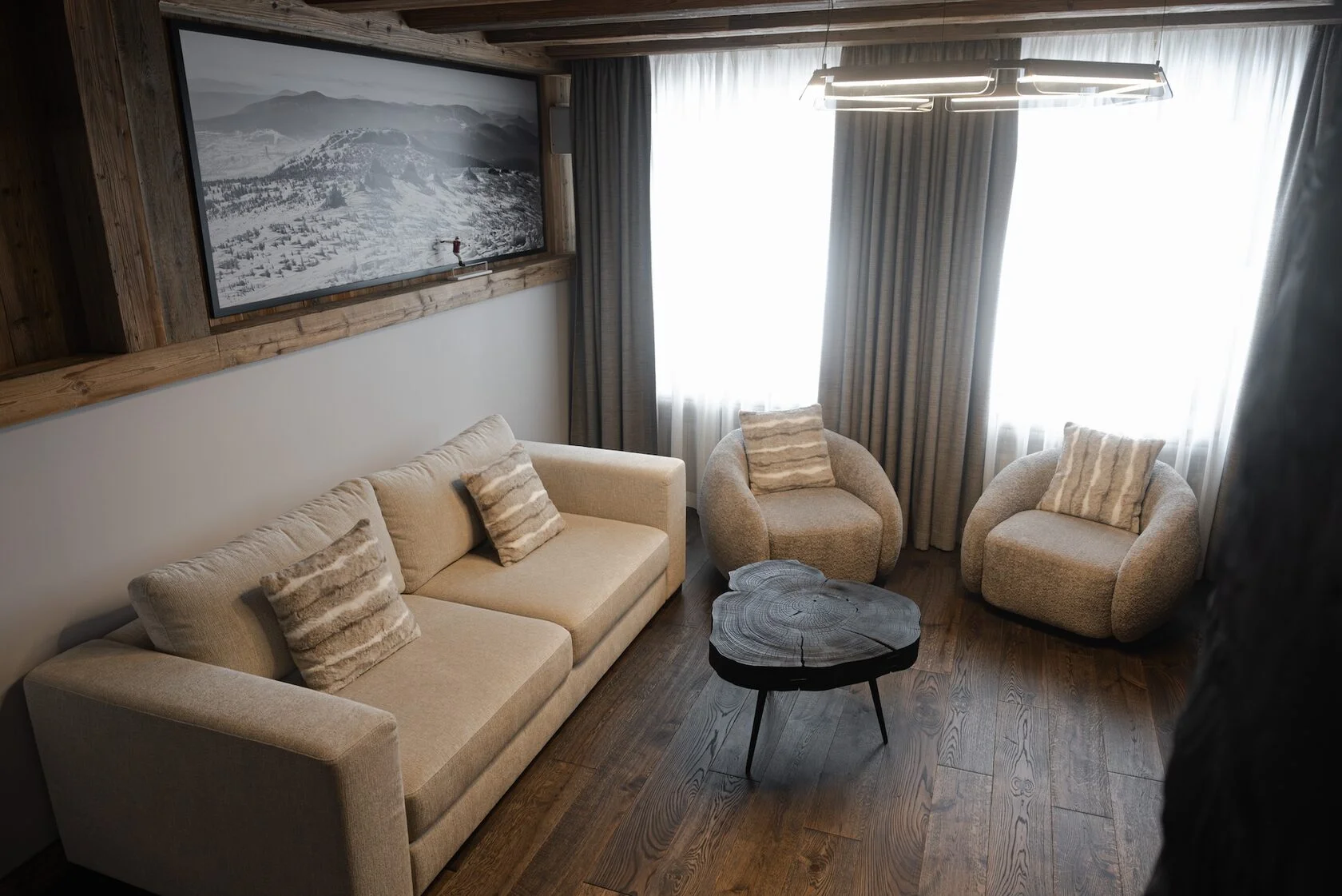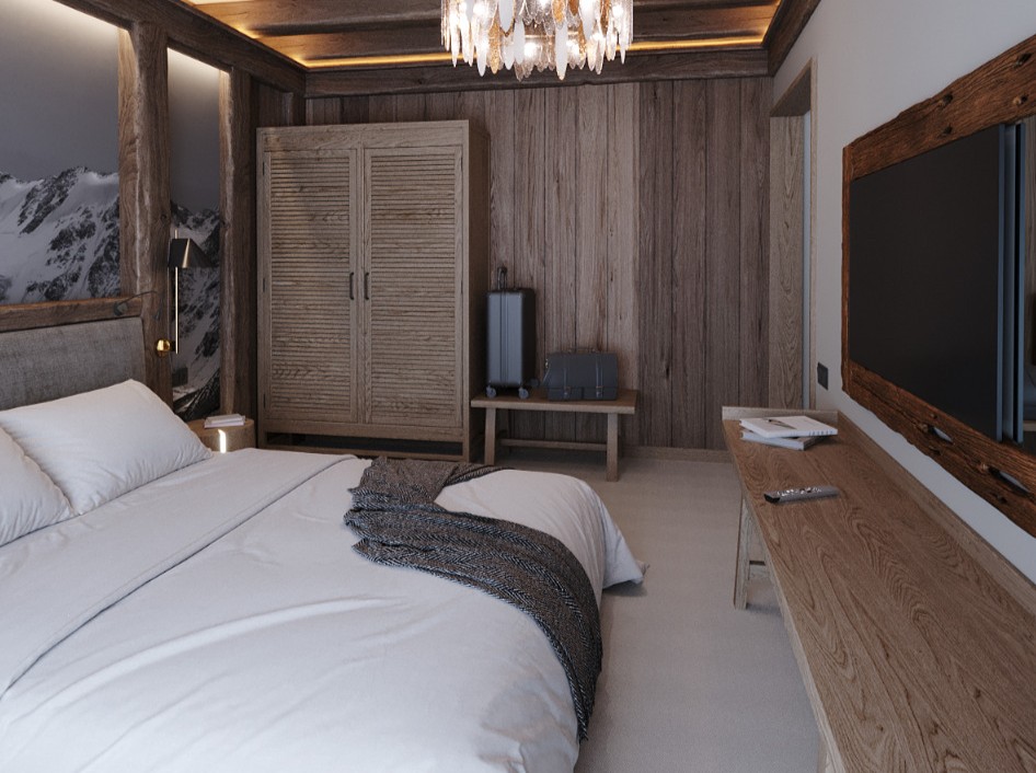 В номере: диван раскладной, кресла, кровать двуспальная, прикроватные тумбочки, стол, стулья, шкаф, кофемашина, лыжехранилище, микроволновая печь, набор посуды, плита электрическая, сейф, телевизор, холодильник, электрочайник