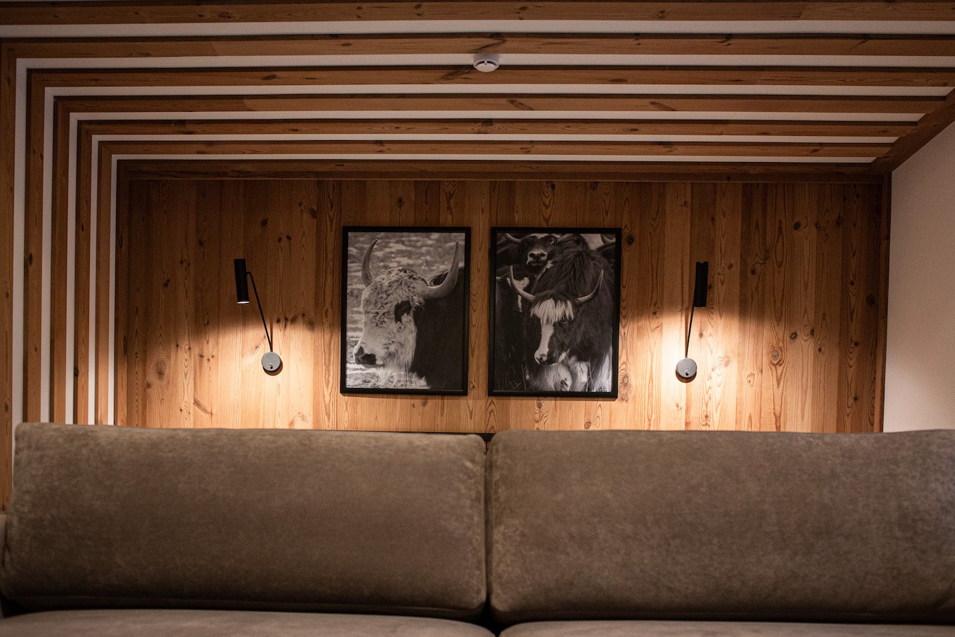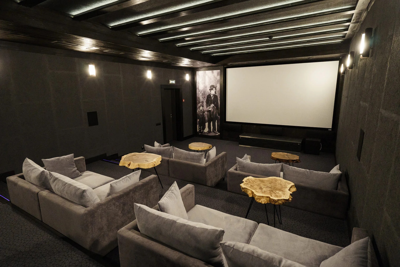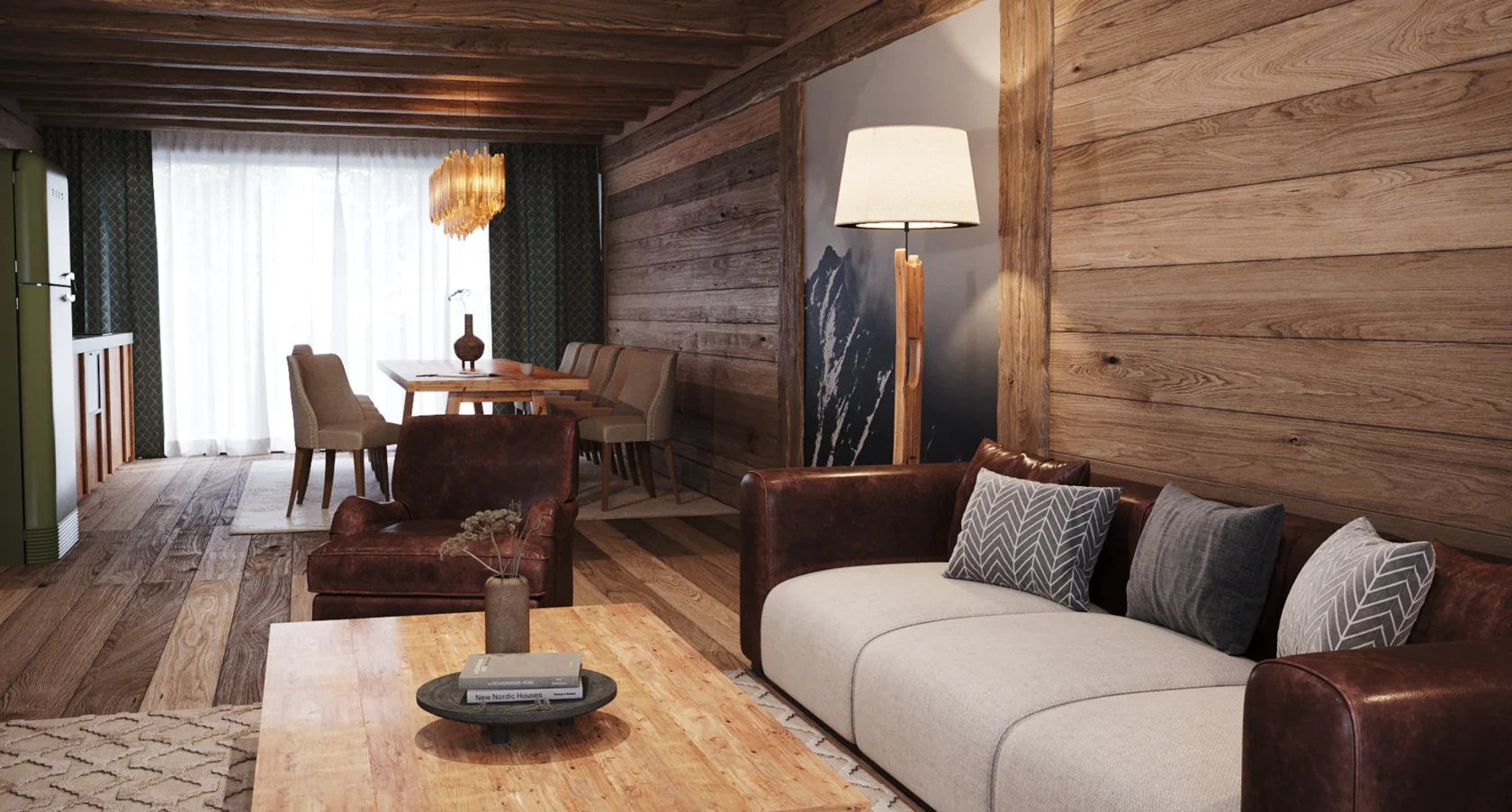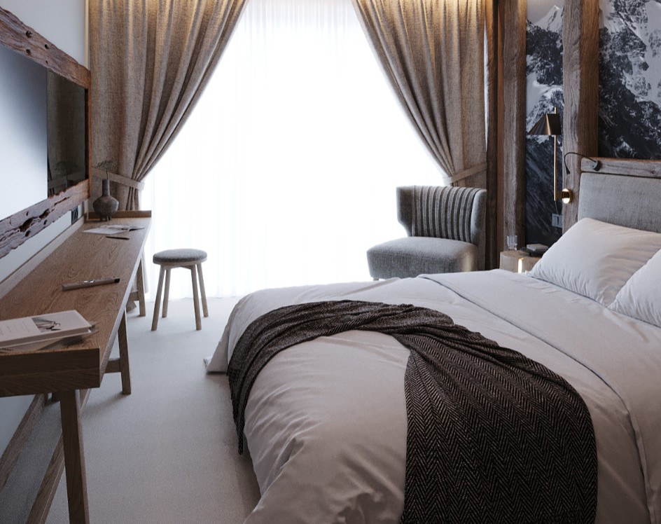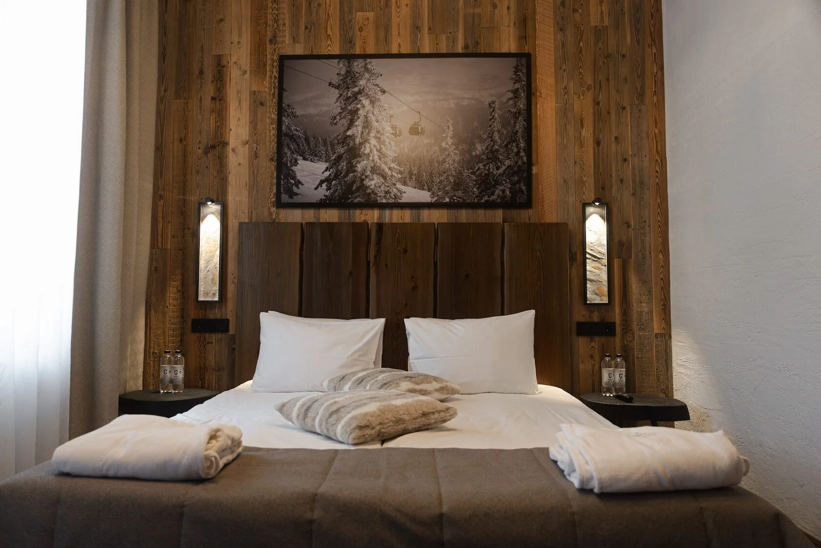 В номере: диван раскладной, кресла, кровать двуспальная, прикроватные тумбочки, стол, стулья, шкаф, кофемашина, лыжехранилище, микроволновая печь, набор посуды, плита электрическая, сейф, телевизор, холодильник, электрочайник