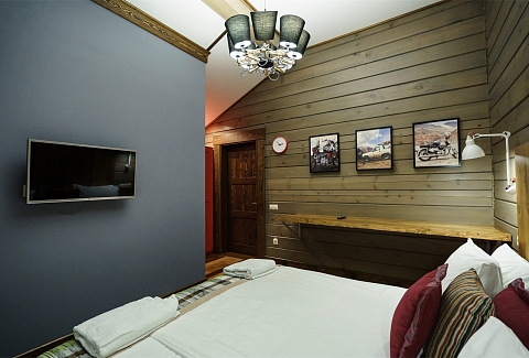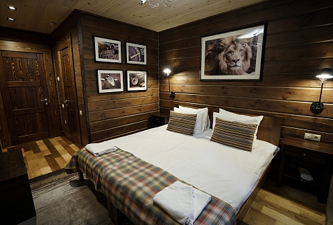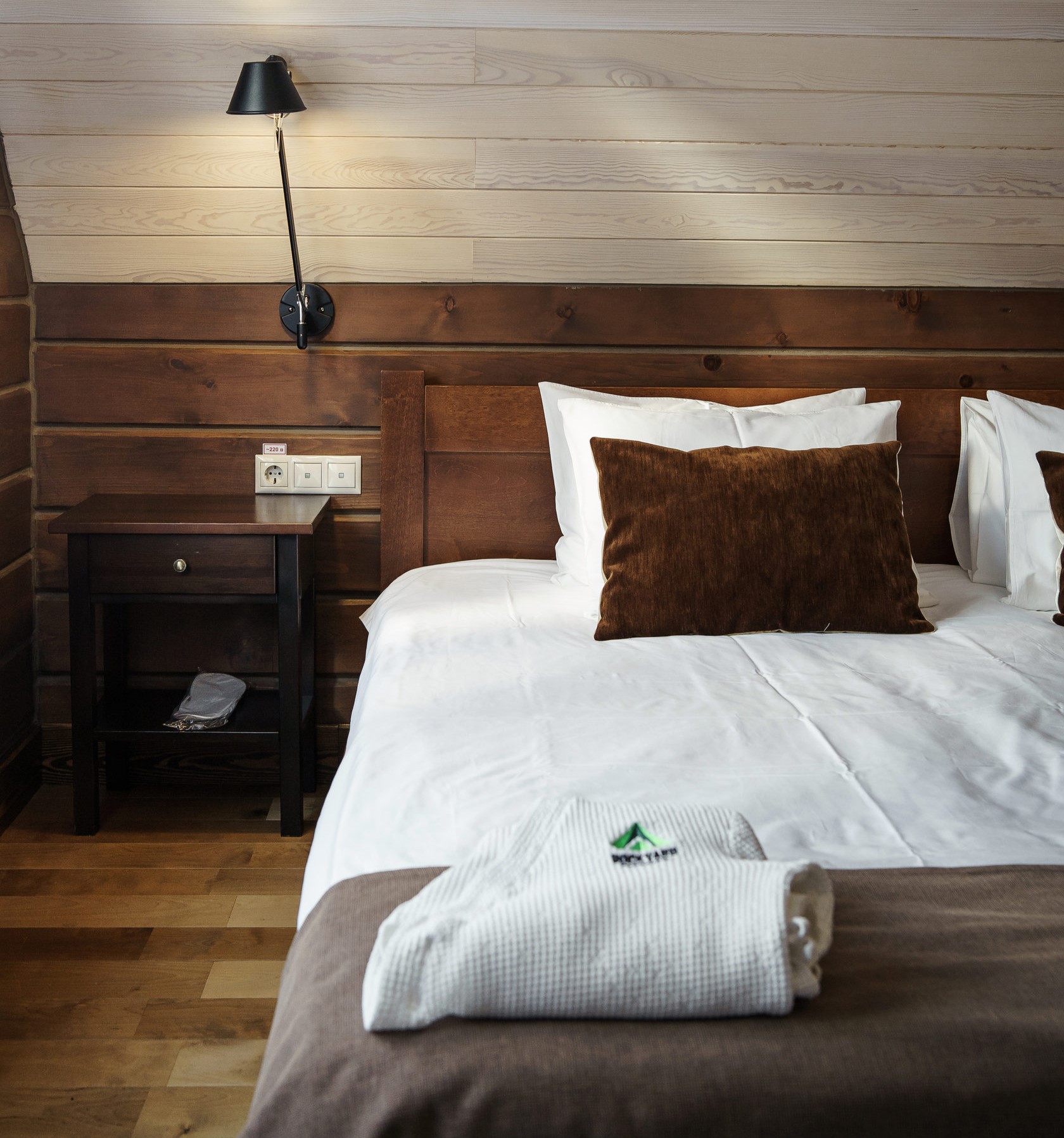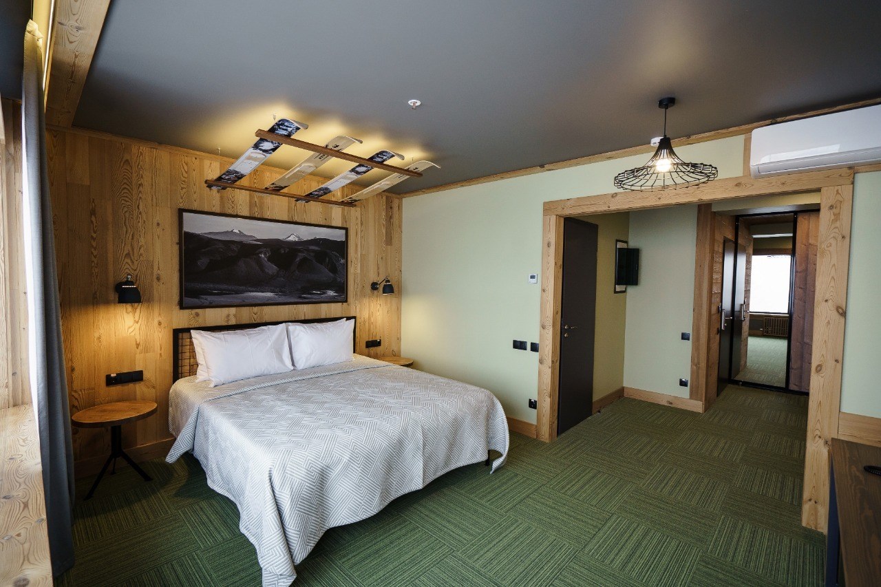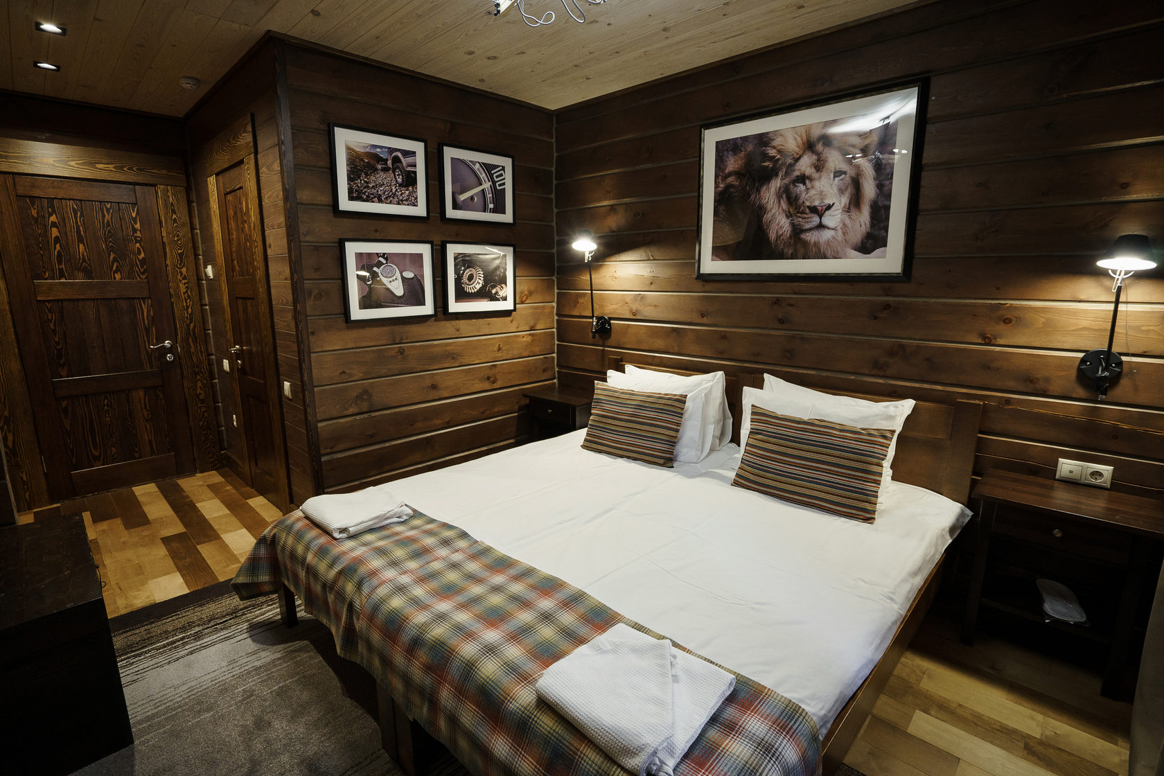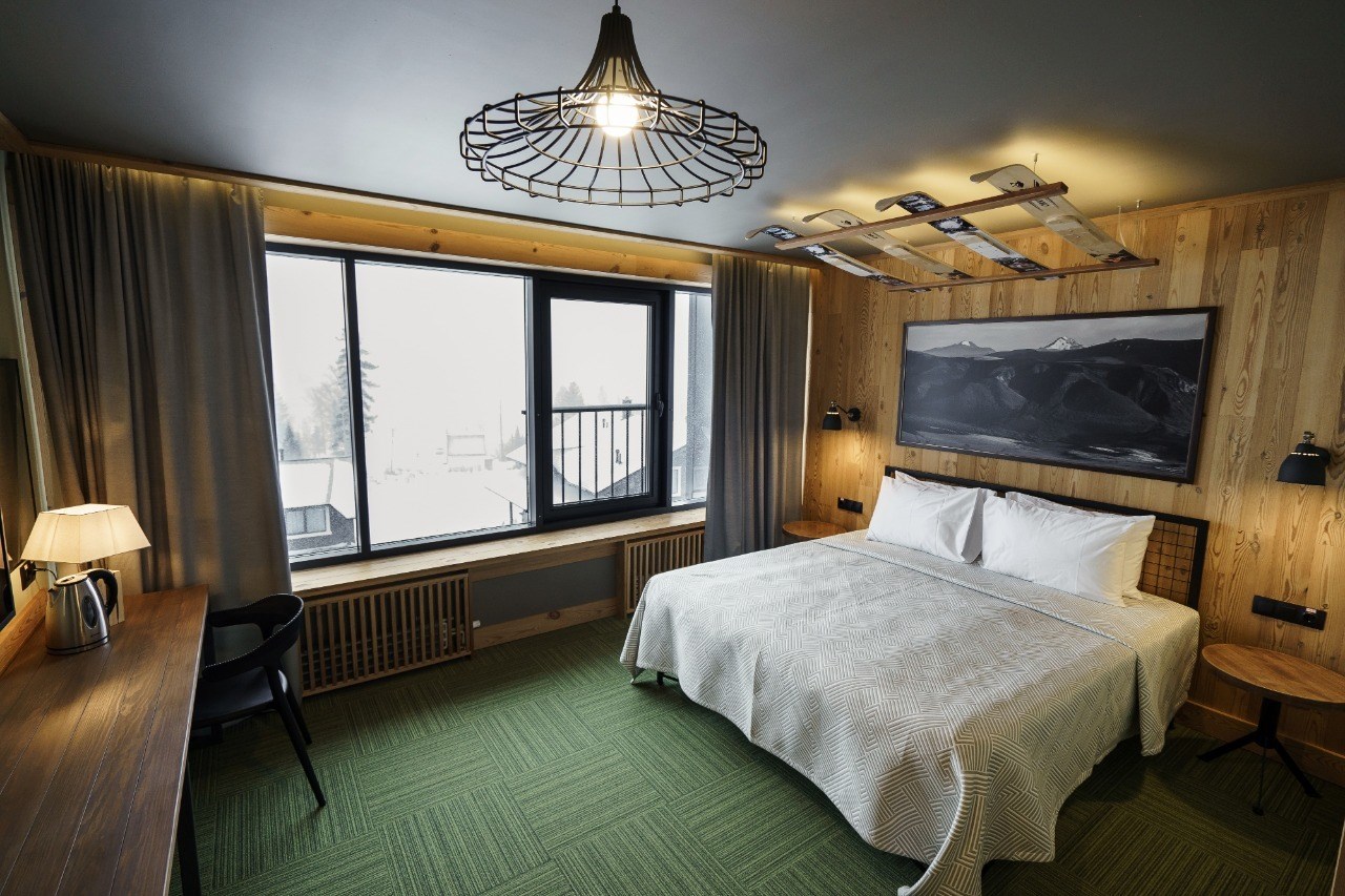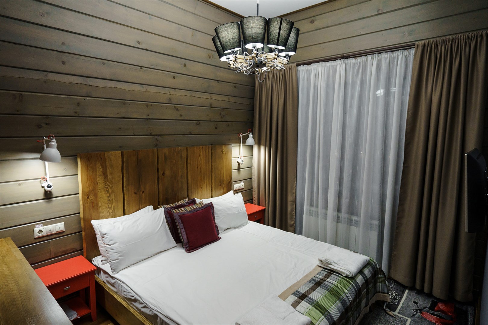 В поселке работают несколько кафе, баров и магазинов. Отельный комплекс состоит из 3 корпусов – 5, 3 и 2 этажа соответственно. В первом основном корпусе находится ресепшен, ресторан и пивоварня, караоке-бар, детская комната кинотеатр и скалодром. В 3 минутах ходьбы от основного корпуса расположен корпус №2. Здесь находится парковка для снегоходов и теплый переход в отель из парковки. Также рядом с первым корпусом стоит корпус №3 из деревянного бруса – более экономичный вариант размещения. Номерной фонд отеля представлен несколькими категориями комфортности, в дизайне которых использованы современные интерьерные решения. Каждый номер оборудован ванной комнатой, удобной мебелью, ТВ, холодильником. Также на территории есть два коттеджа шале, оснащенные кухонными зонами и удобные для размещения компаниями. В числе услуг на территории отеля – баня на дровах, работает круглосуточно. Также круглосуточно работает прачечная самообслуживания. На всей территории отеля и в номерах доступен беспроводной интернет Wi-Fi.