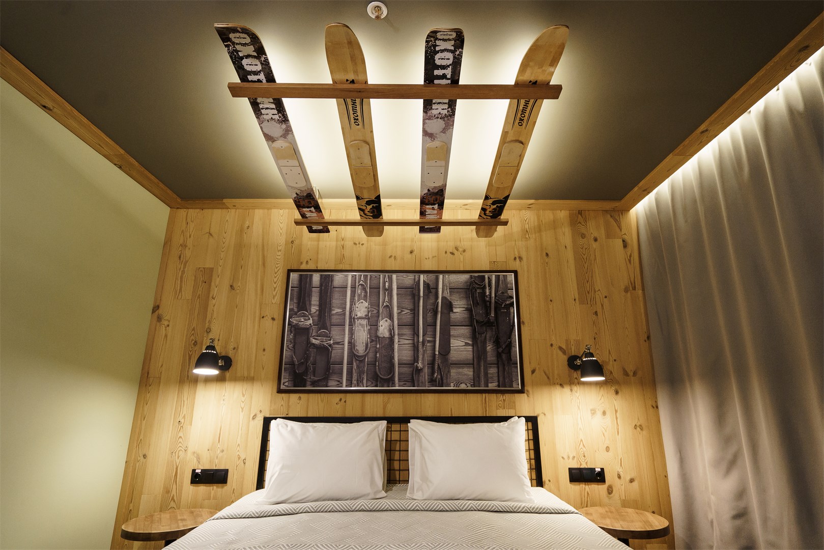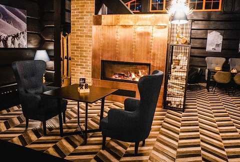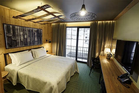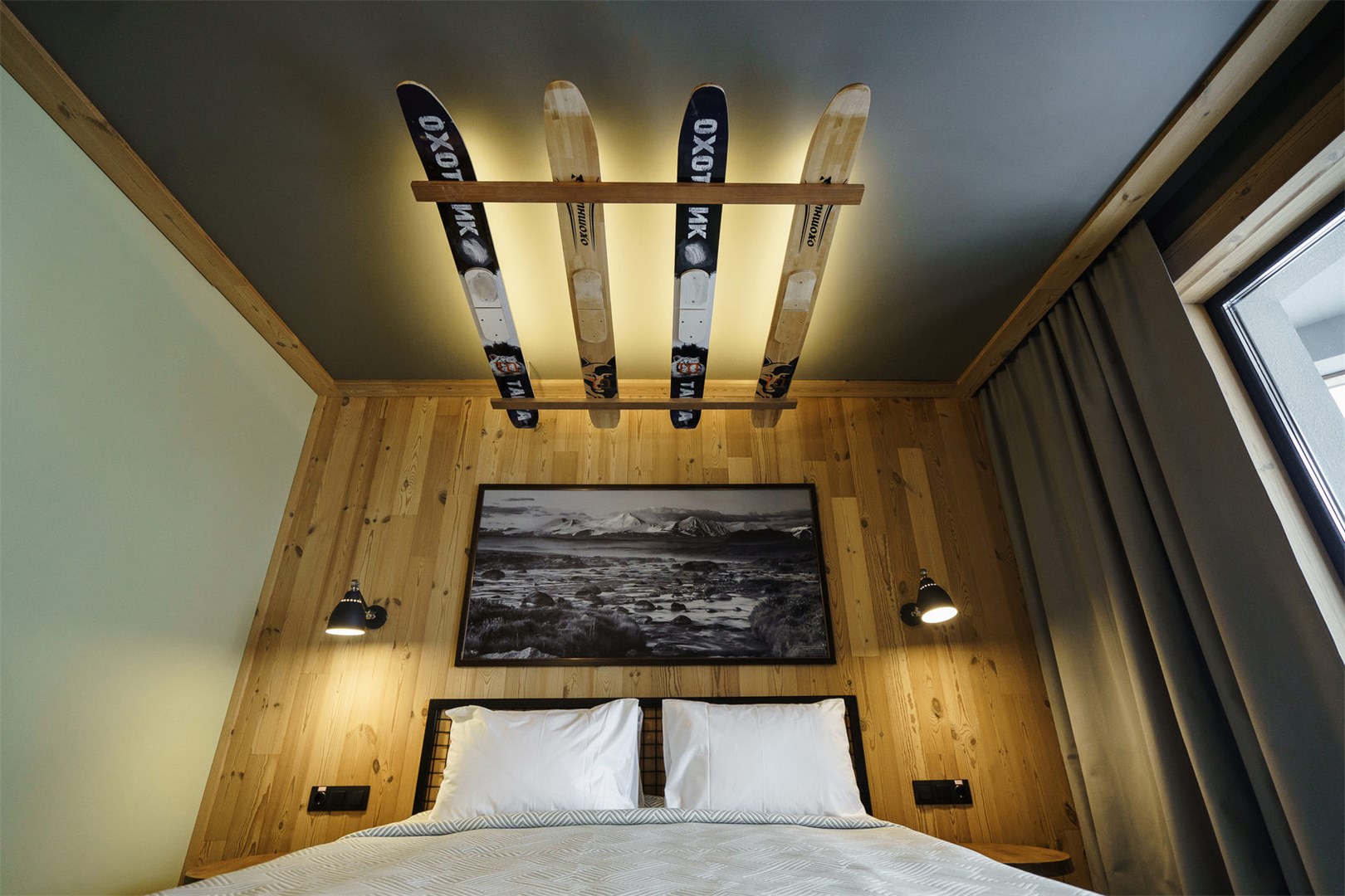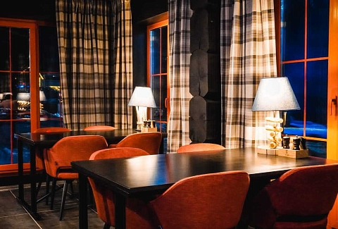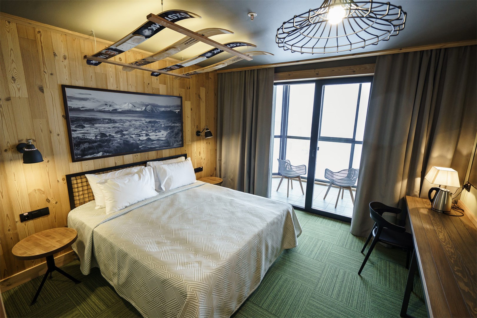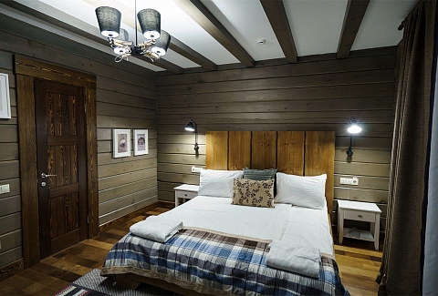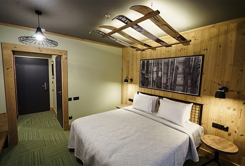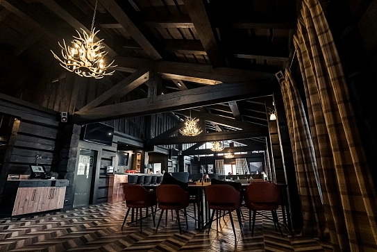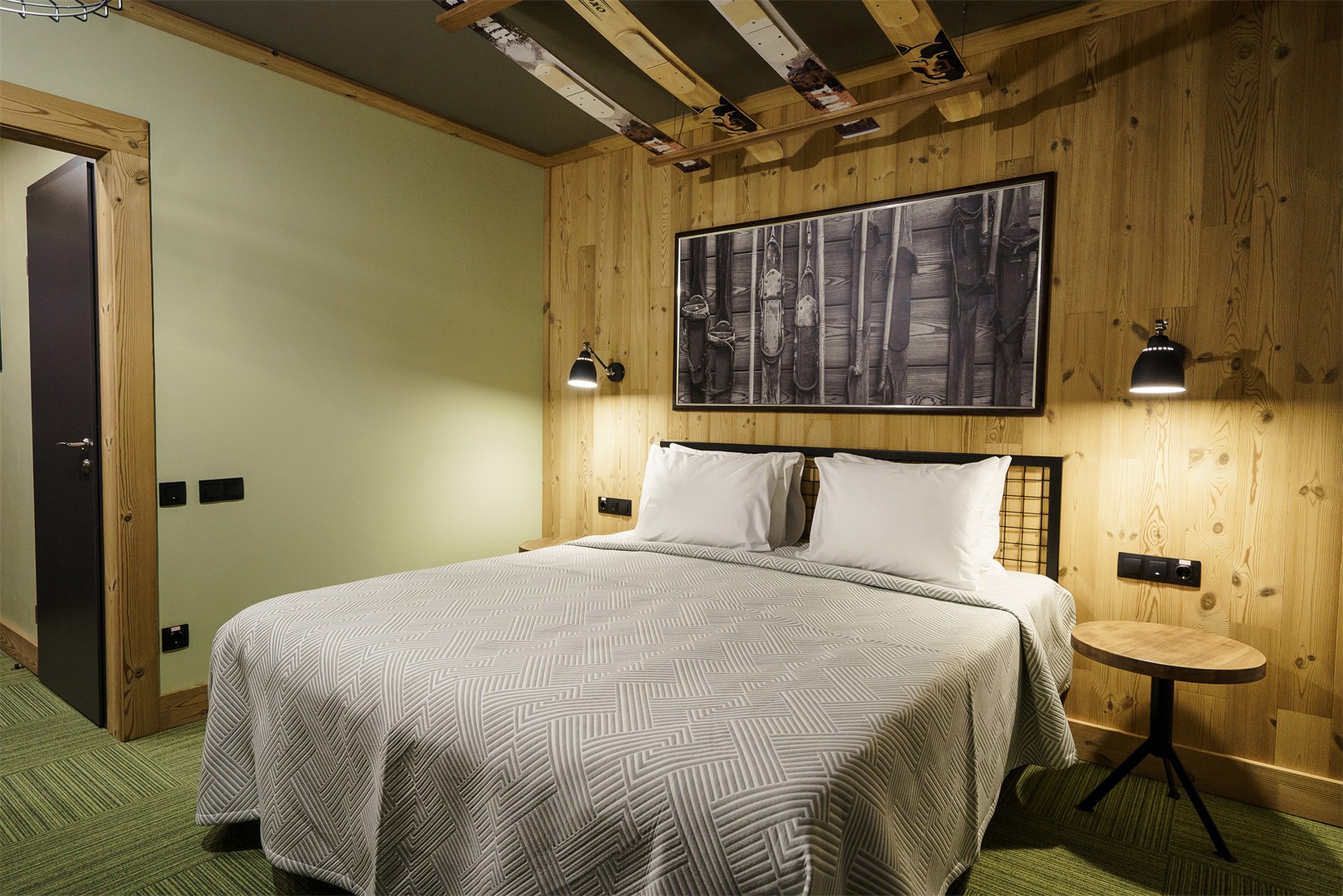 В поселке работают несколько кафе, баров и магазинов. Отельный комплекс состоит из 3 корпусов – 5, 3 и 2 этажа соответственно. В первом основном корпусе находится ресепшен, ресторан и пивоварня, караоке-бар, детская комната кинотеатр и скалодром. В 3 минутах ходьбы от основного корпуса расположен корпус №2. Здесь находится парковка для снегоходов и теплый переход в отель из парковки. Также рядом с первым корпусом стоит корпус №3 из деревянного бруса – более экономичный вариант размещения. Номерной фонд отеля представлен несколькими категориями комфортности, в дизайне которых использованы современные интерьерные решения. Каждый номер оборудован ванной комнатой, удобной мебелью, ТВ, холодильником. Также на территории есть два коттеджа шале, оснащенные кухонными зонами и удобные для размещения компаниями. В числе услуг на территории отеля – баня на дровах, работает круглосуточно. Также круглосуточно работает прачечная самообслуживания. На всей территории отеля и в номерах доступен беспроводной интернет Wi-Fi.