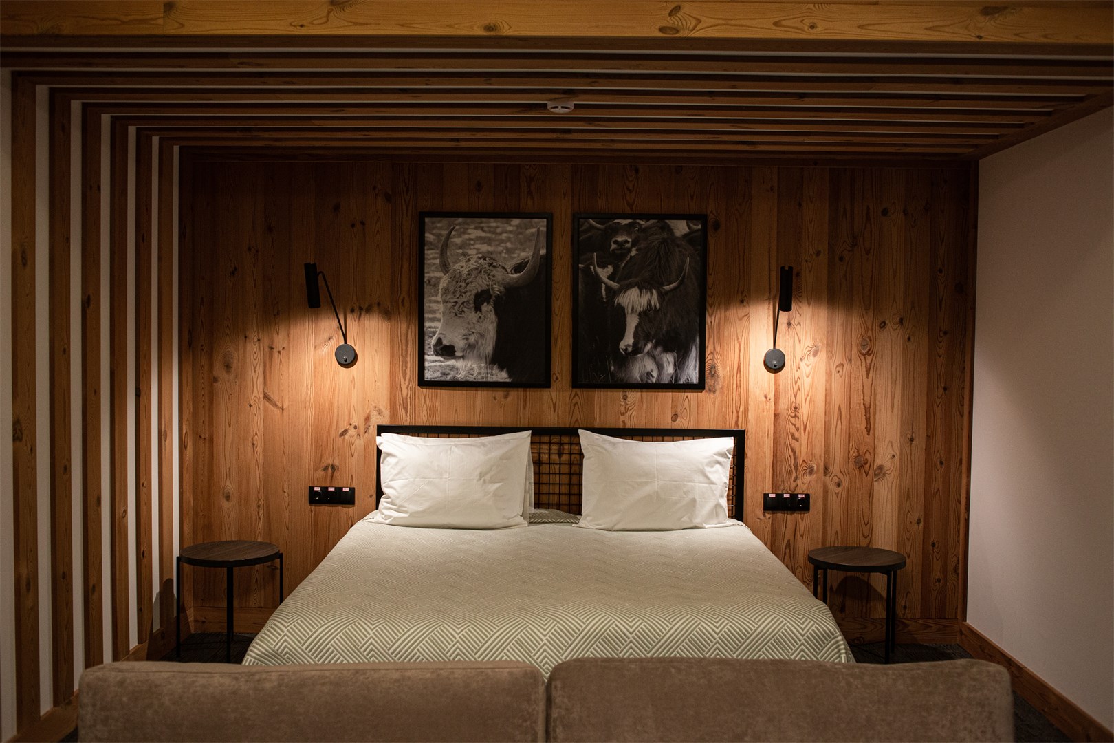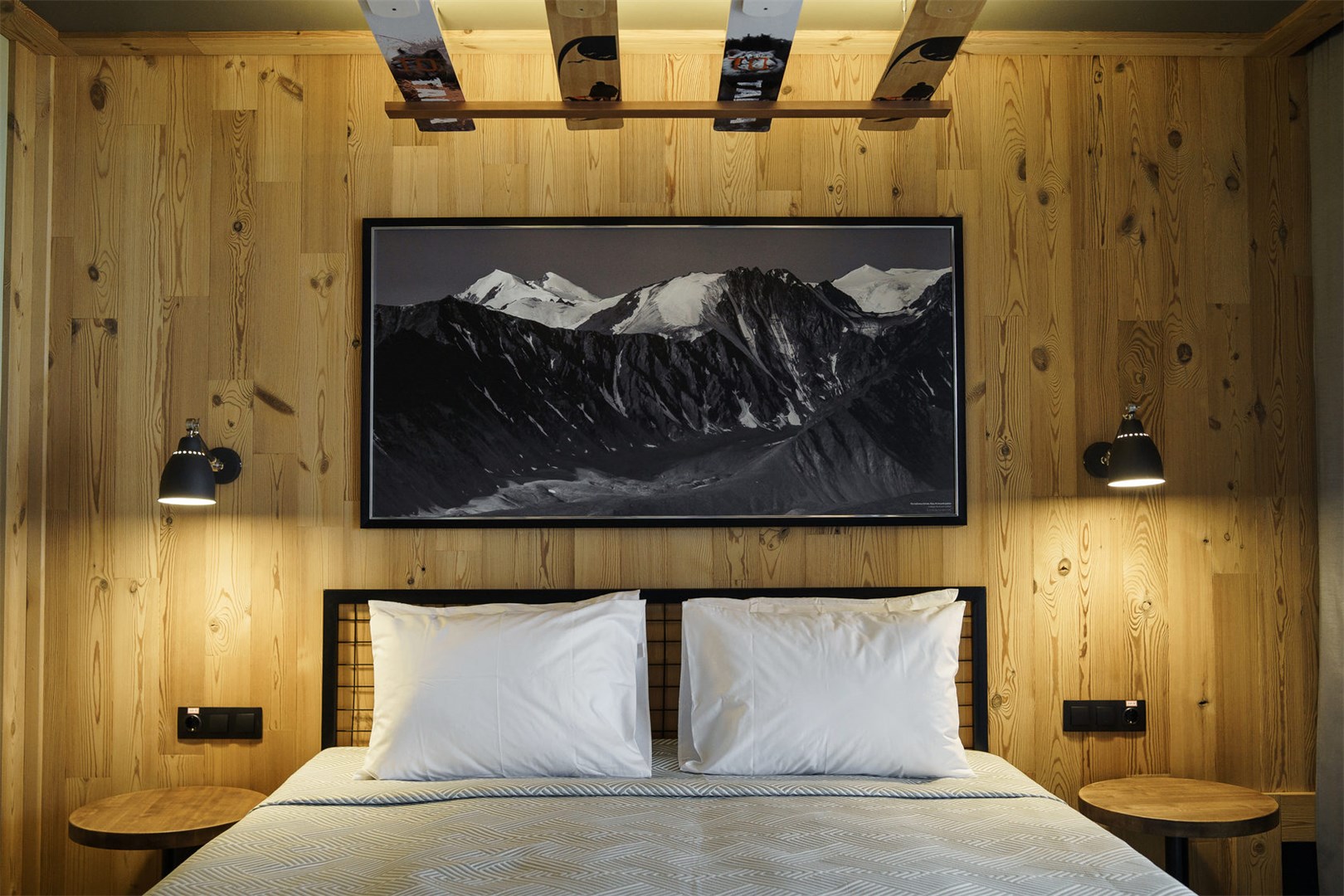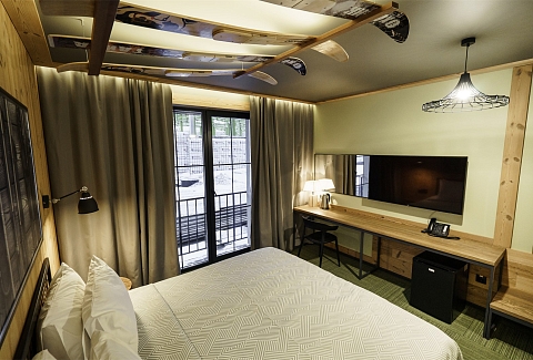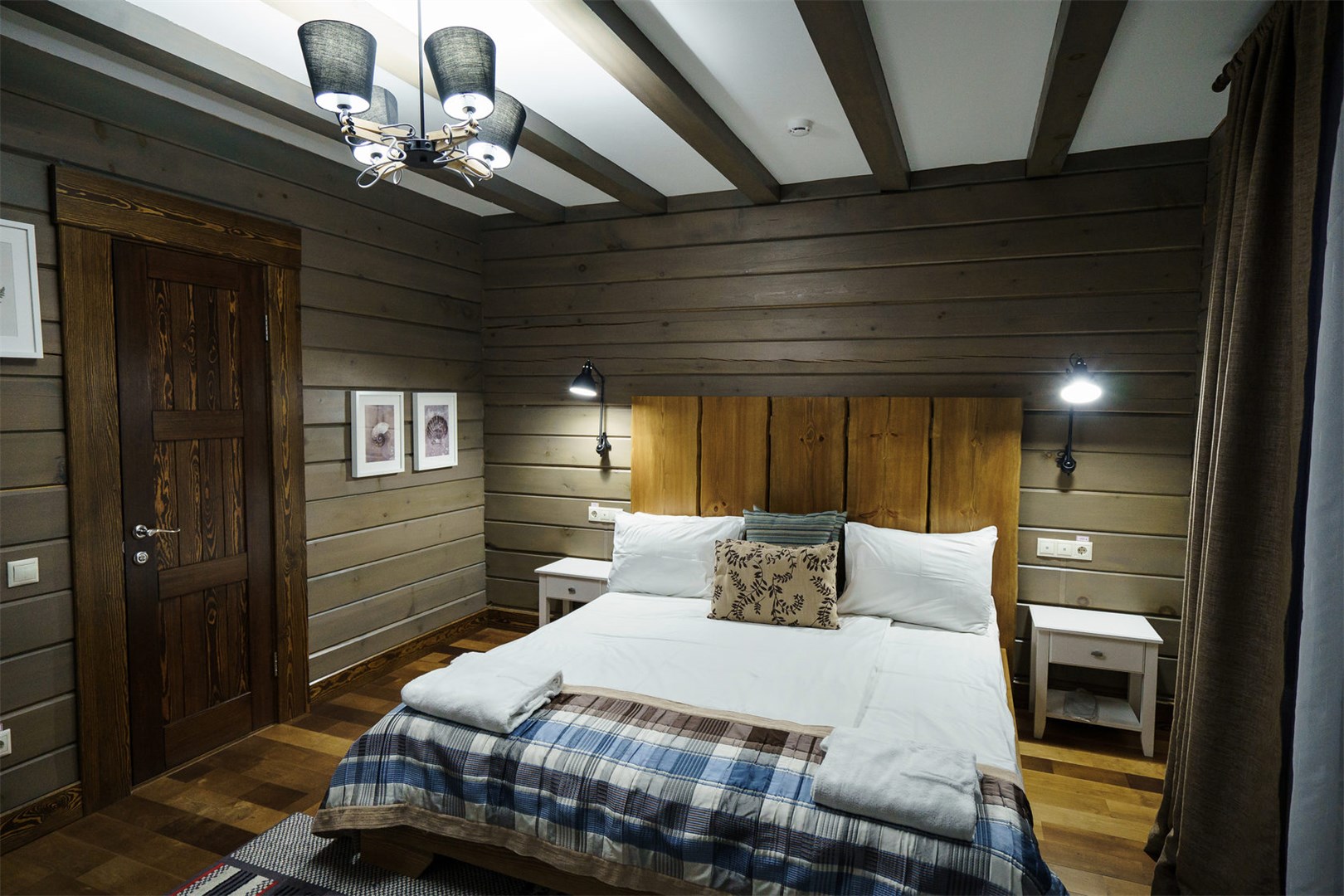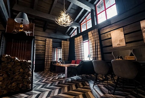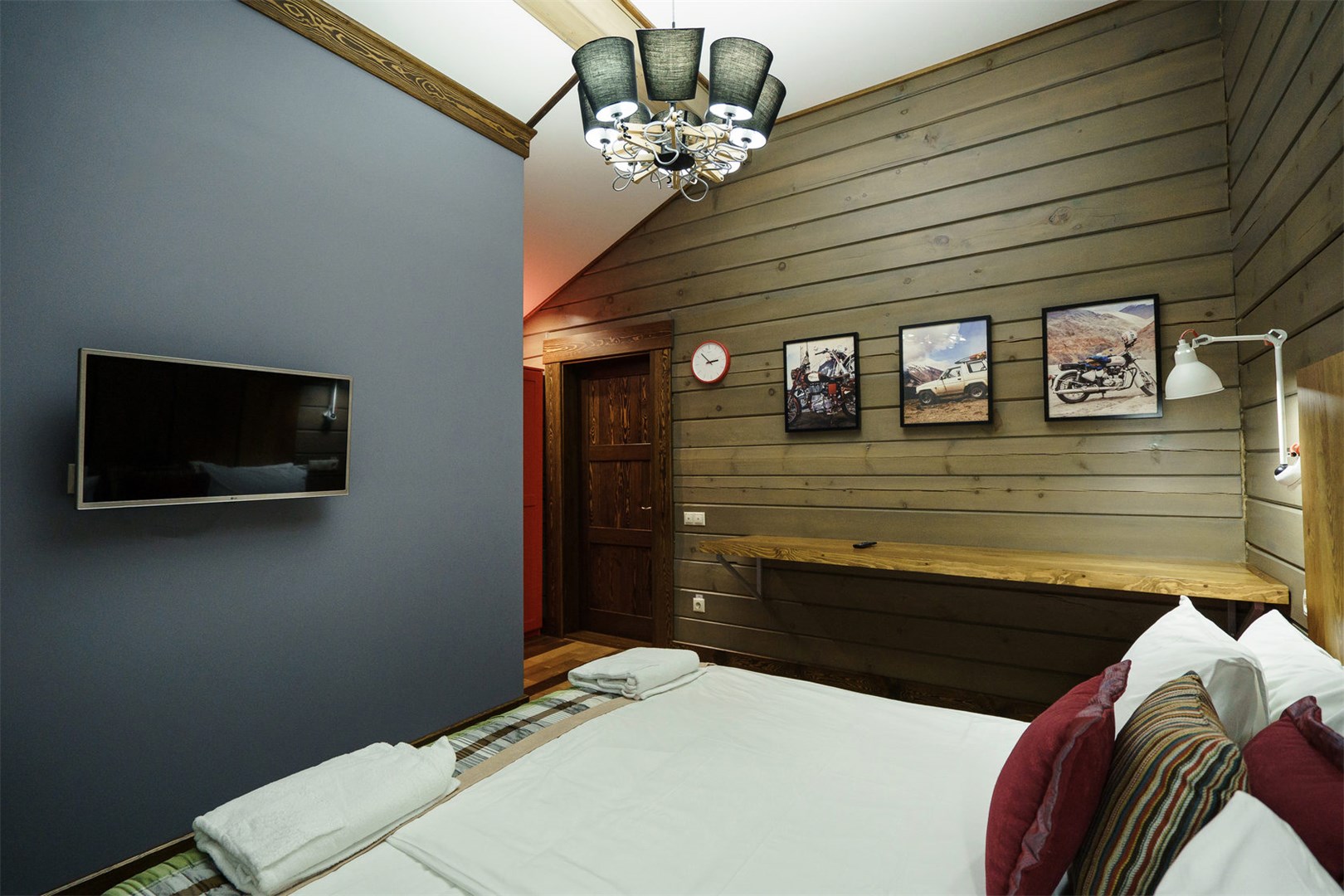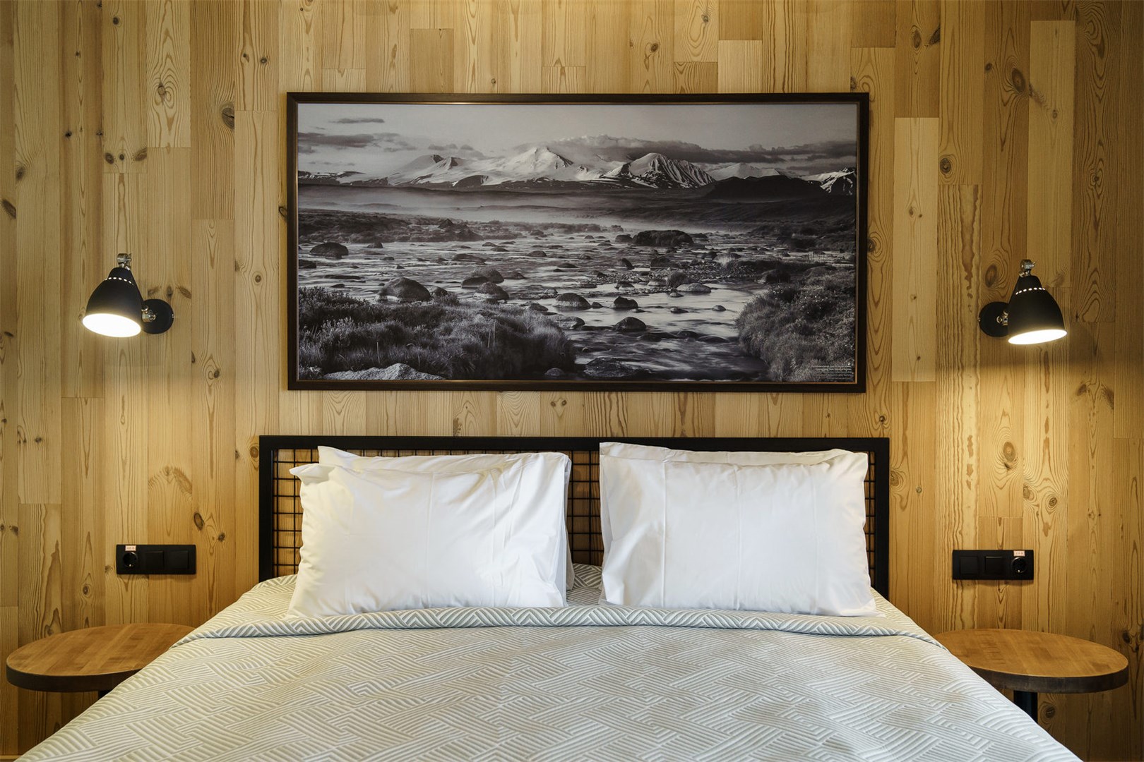 В поселке работают несколько кафе, баров и магазинов. Отельный комплекс состоит из 3 корпусов – 5, 3 и 2 этажа соответственно. В первом основном корпусе находится ресепшен, ресторан и пивоварня, караоке-бар, детская комната кинотеатр и скалодром. В 3 минутах ходьбы от основного корпуса расположен корпус №2. Здесь находится парковка для снегоходов и теплый переход в отель из парковки. Также рядом с первым корпусом стоит корпус №3 из деревянного бруса – более экономичный вариант размещения. Номерной фонд отеля представлен несколькими категориями комфортности, в дизайне которых использованы современные интерьерные решения. Каждый номер оборудован ванной комнатой, удобной мебелью, ТВ, холодильником. Также на территории есть два коттеджа шале, оснащенные кухонными зонами и удобные для размещения компаниями. В числе услуг на территории отеля – баня на дровах, работает круглосуточно. Также круглосуточно работает прачечная самообслуживания. На всей территории отеля и в номерах доступен беспроводной интернет Wi-Fi.