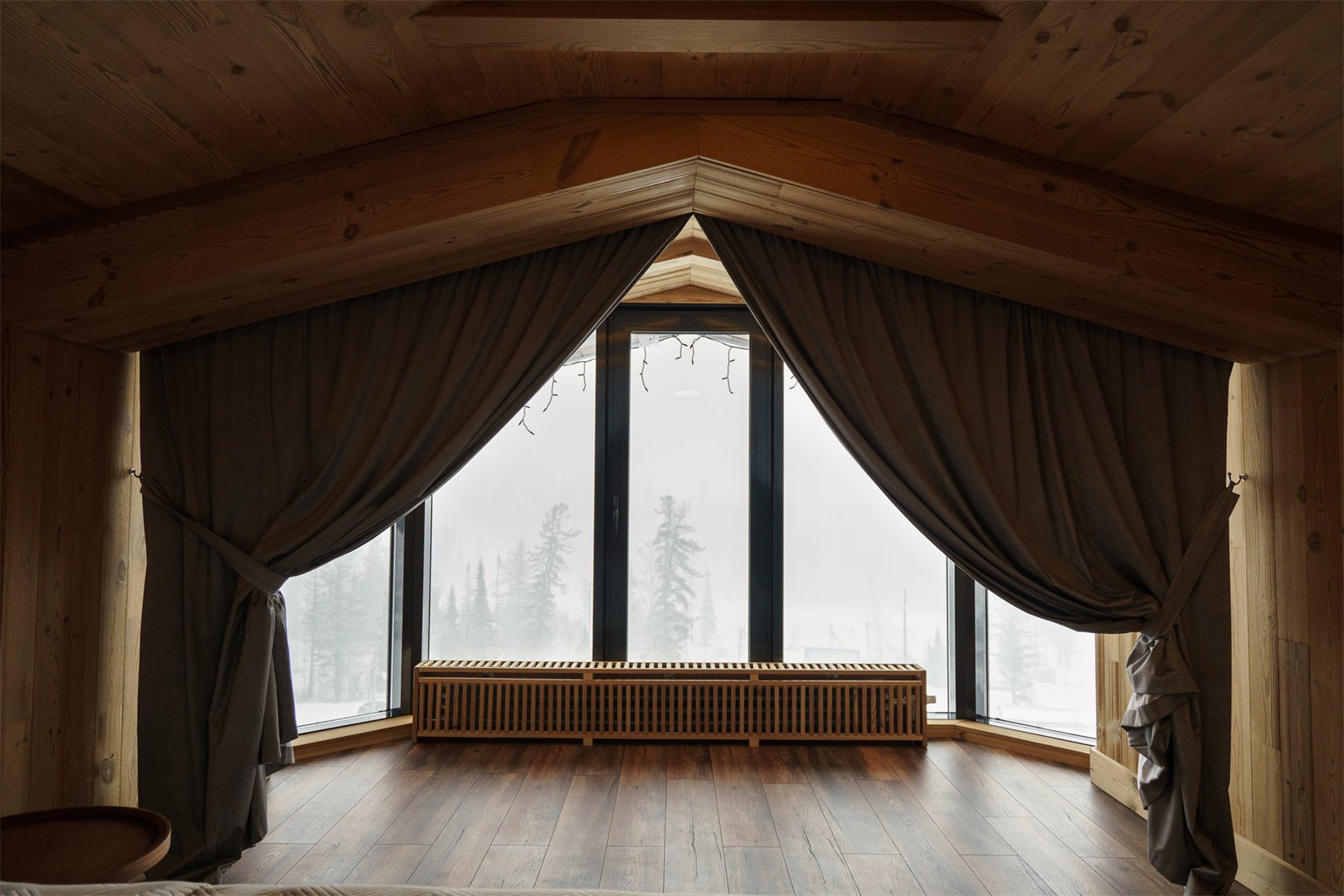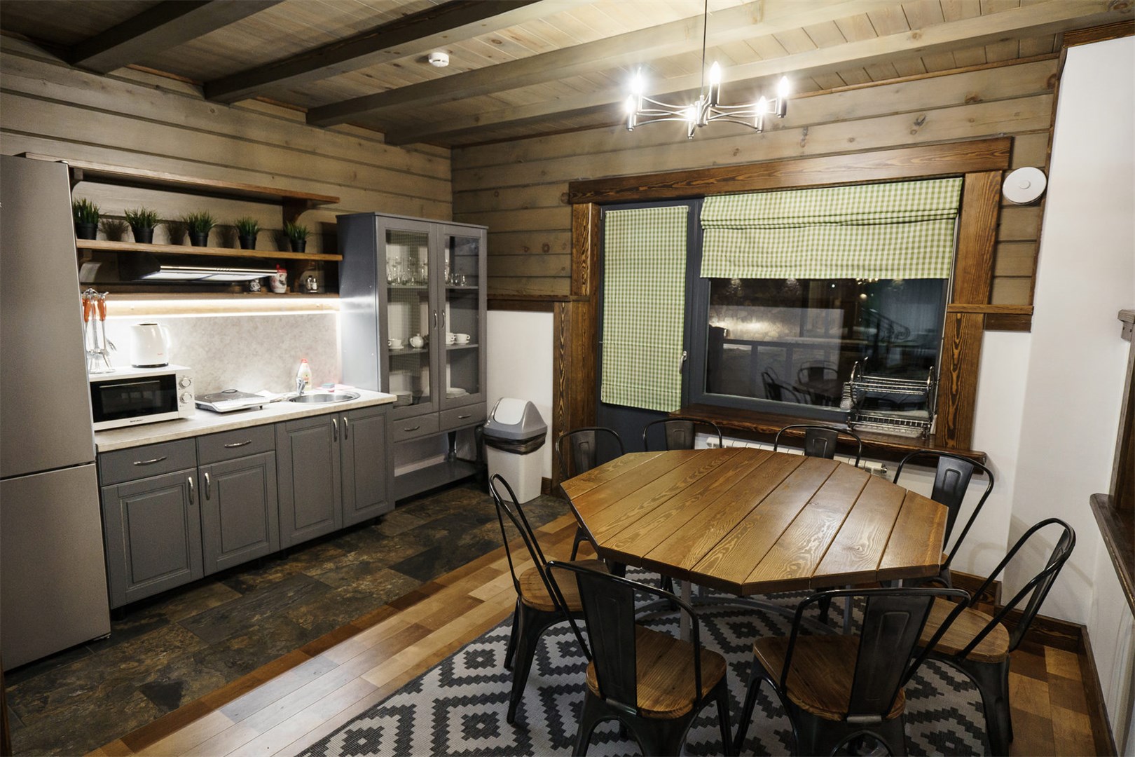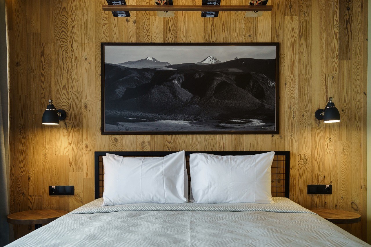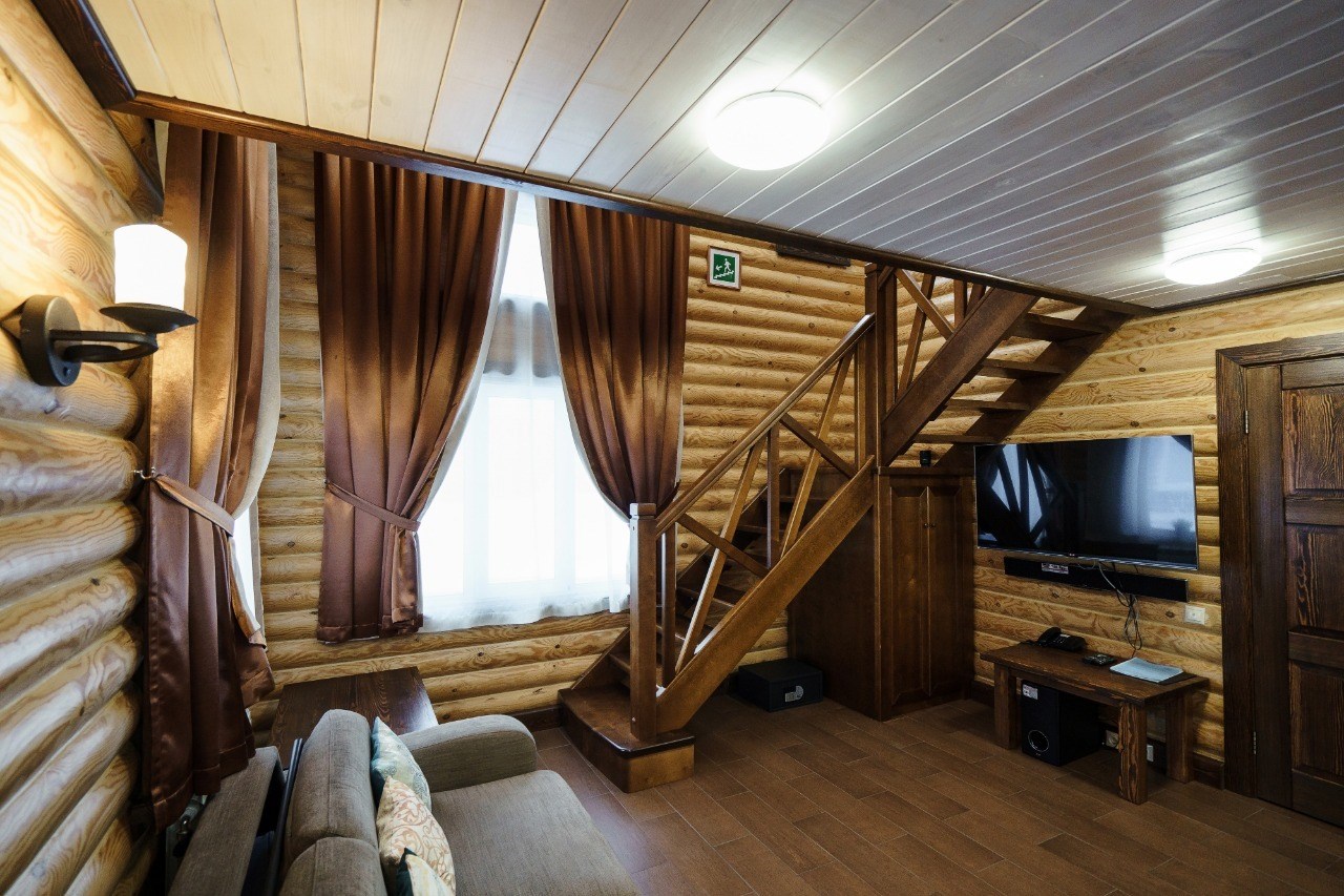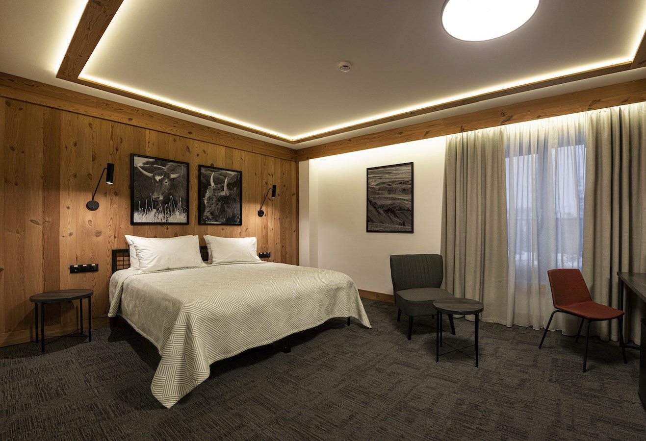 В поселке работают несколько кафе, баров и магазинов. Отельный комплекс состоит из 3 корпусов – 5, 3 и 2 этажа соответственно. В первом основном корпусе находится ресепшен, ресторан и пивоварня, караоке-бар, детская комната кинотеатр и скалодром. В 3 минутах ходьбы от основного корпуса расположен корпус №2. Здесь находится парковка для снегоходов и теплый переход в отель из парковки. Также рядом с первым корпусом стоит корпус №3 из деревянного бруса – более экономичный вариант размещения. Номерной фонд отеля представлен несколькими категориями комфортности, в дизайне которых использованы современные интерьерные решения. Каждый номер оборудован ванной комнатой, удобной мебелью, ТВ, холодильником. Также на территории есть два коттеджа шале, оснащенные кухонными зонами и удобные для размещения компаниями. В числе услуг на территории отеля – баня на дровах, работает круглосуточно. Также круглосуточно работает прачечная самообслуживания. На всей территории отеля и в номерах доступен беспроводной интернет Wi-Fi.
