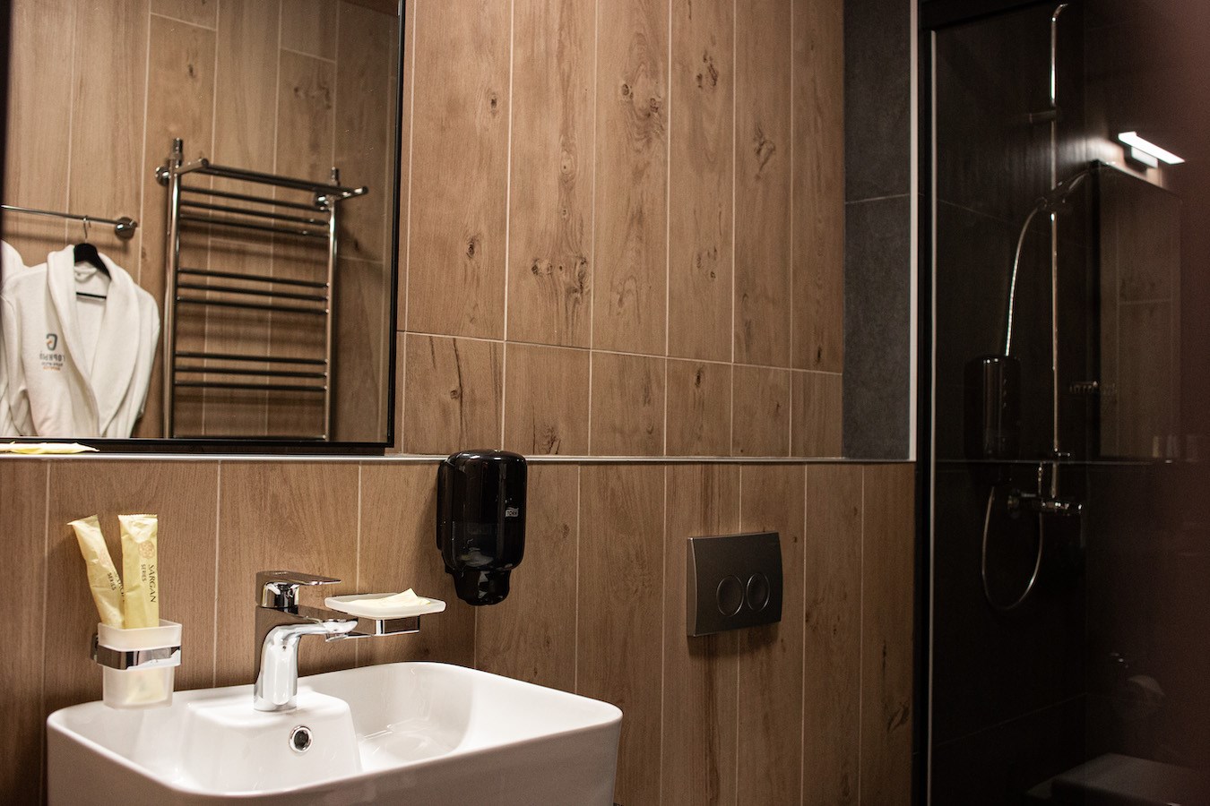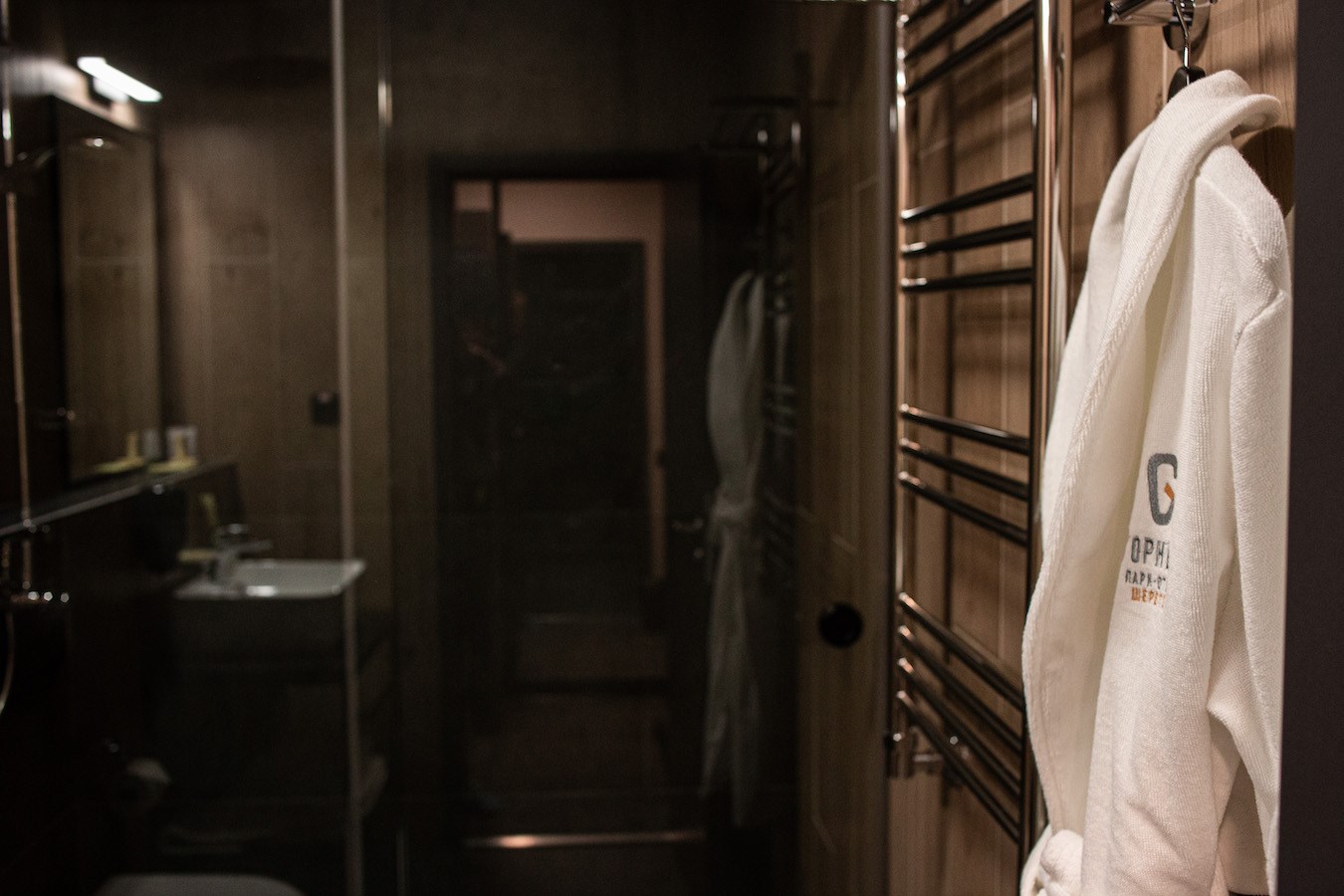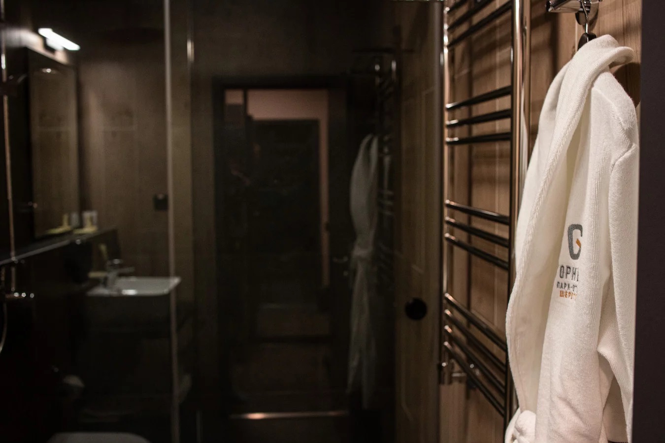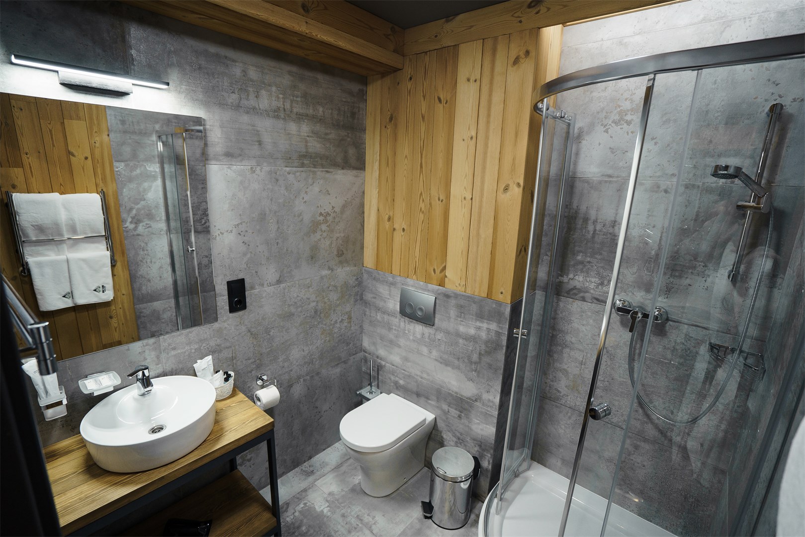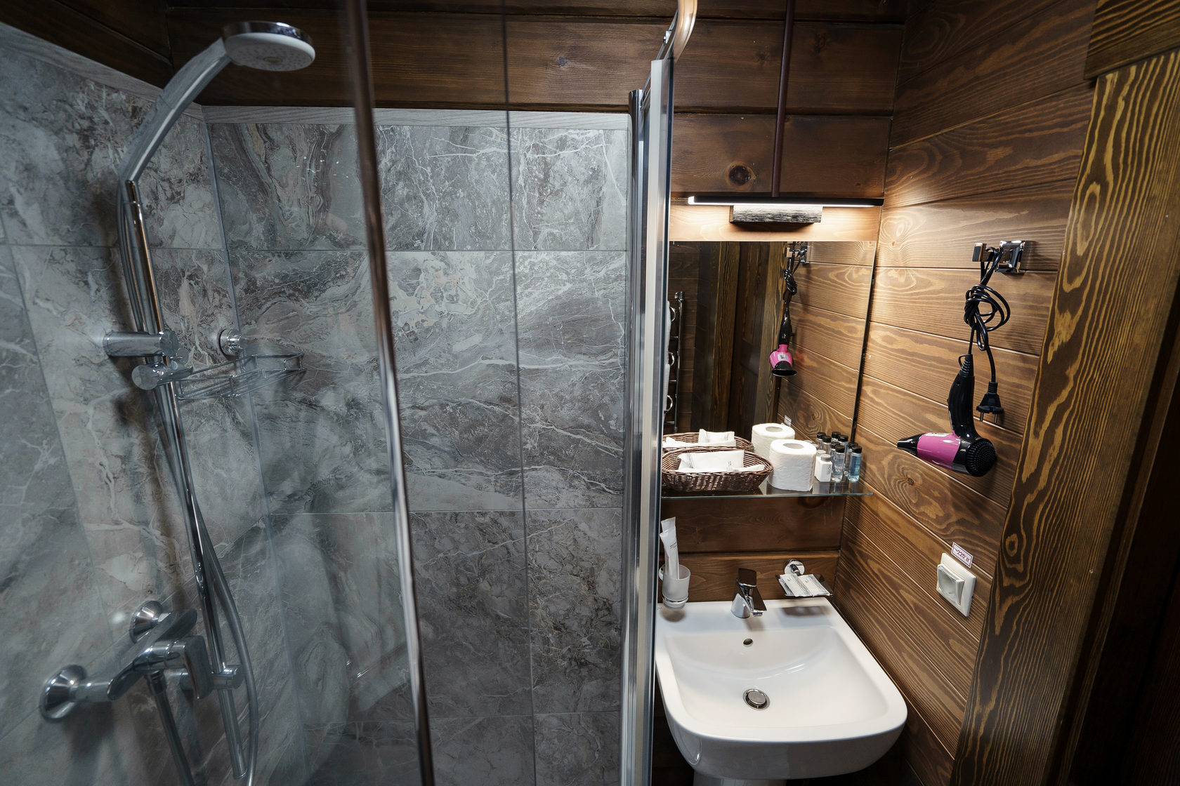 Санузел: с душевой кабиной, тапочки, туалетные принадлежности, фен, халат