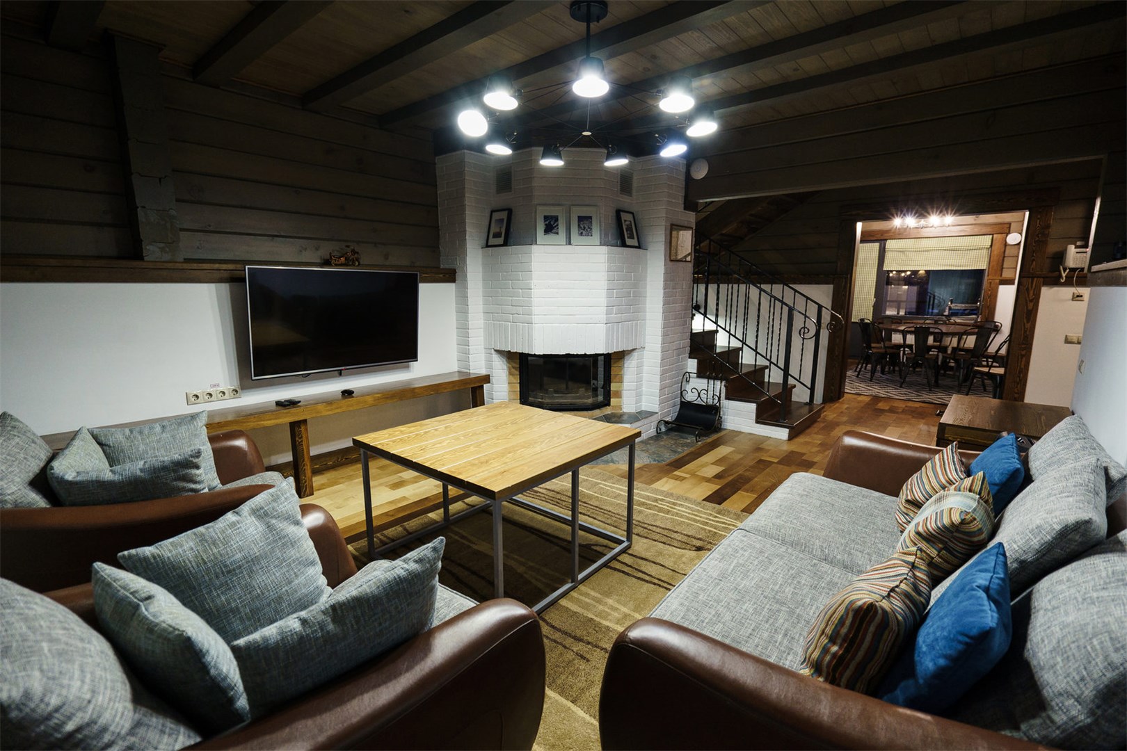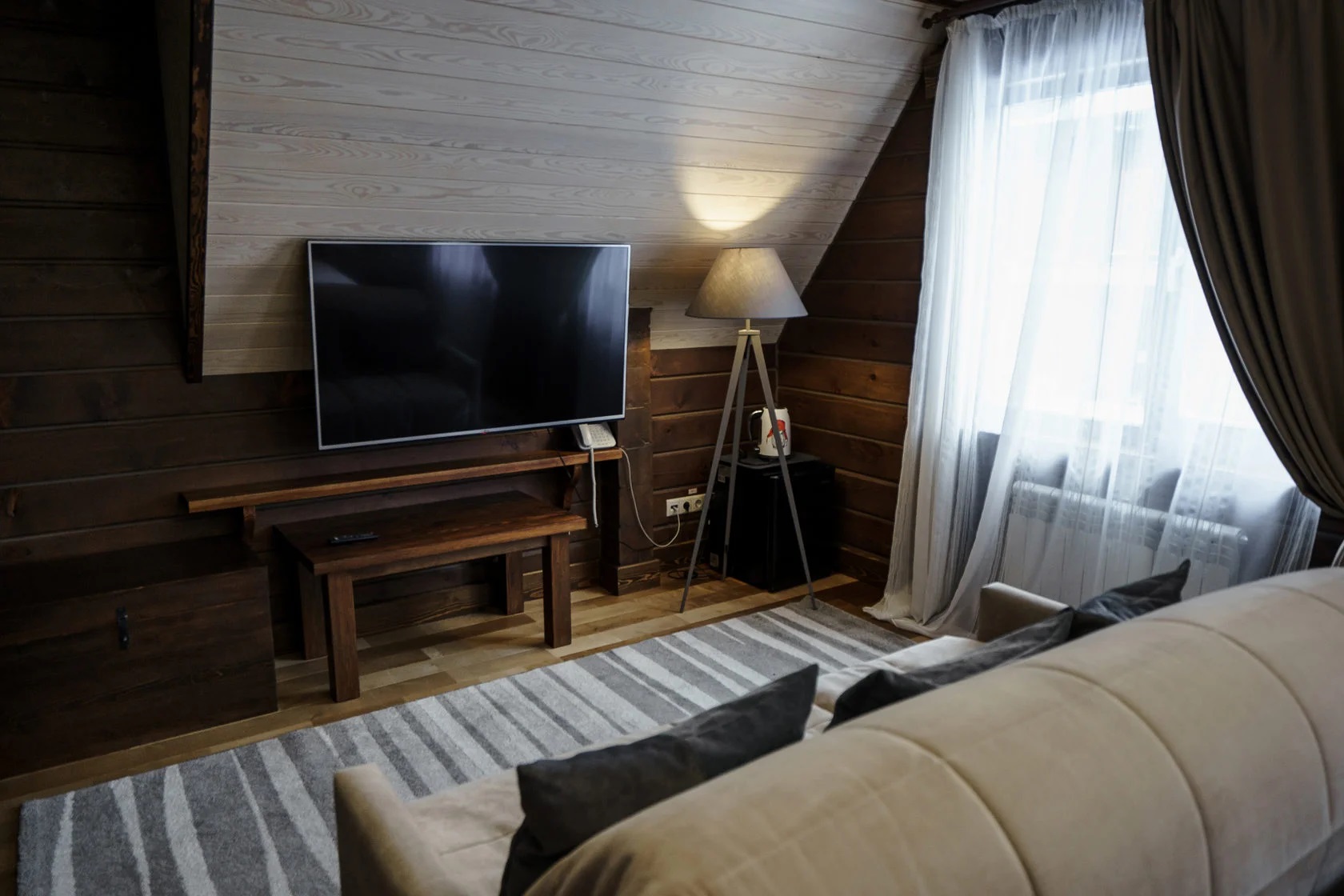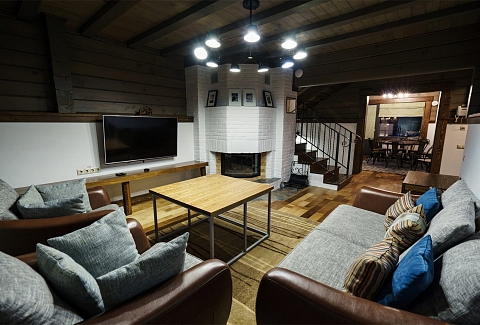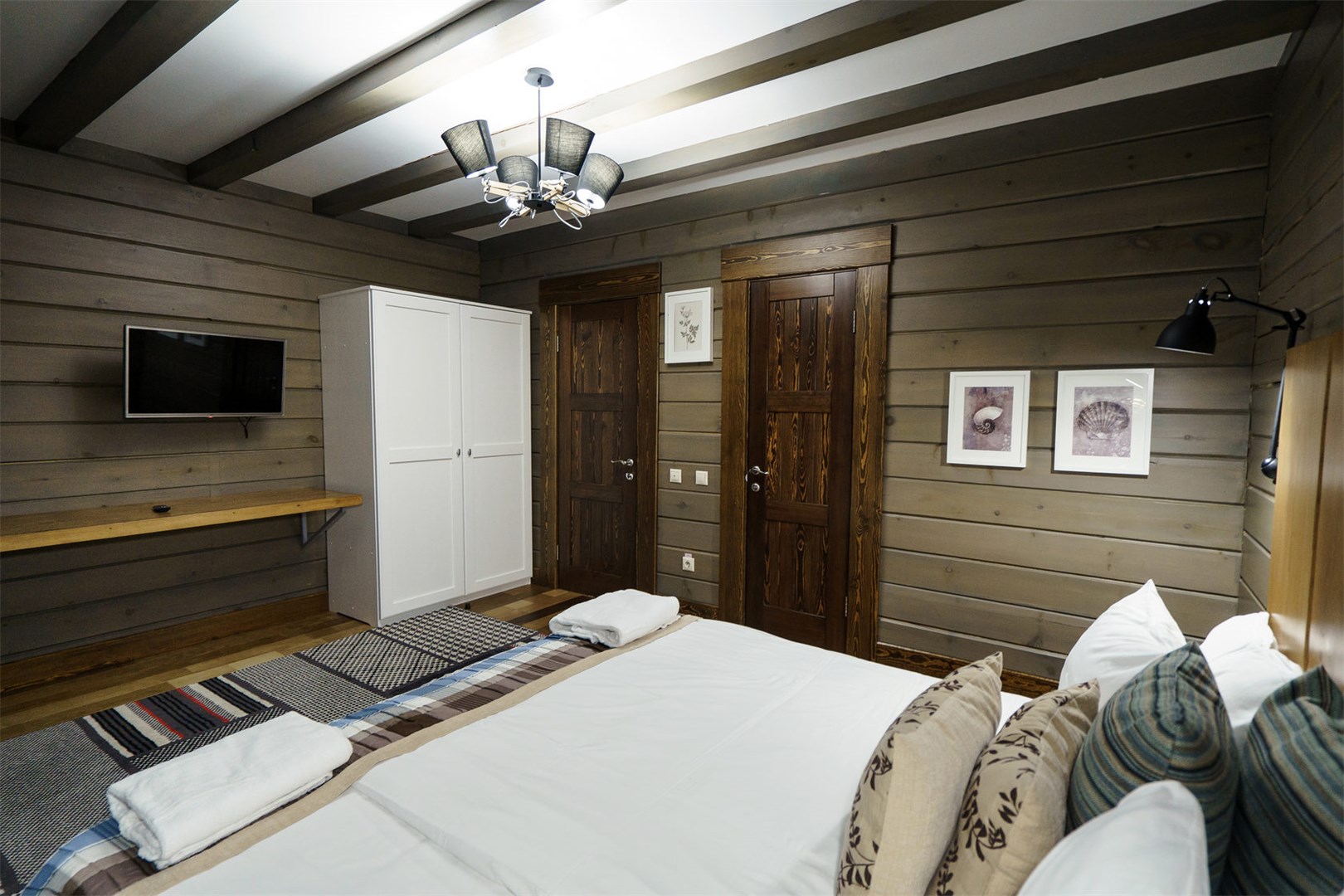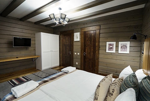 В номере: диван раскладной, кресла, кровать двуспальная, прикроватные столики, стол, стулья, шкаф, кофемашина, лыжехранилище, микроволновая печь, набор посуды, плита электрическая, сейф, телевизор, холодильник, электрочайник
