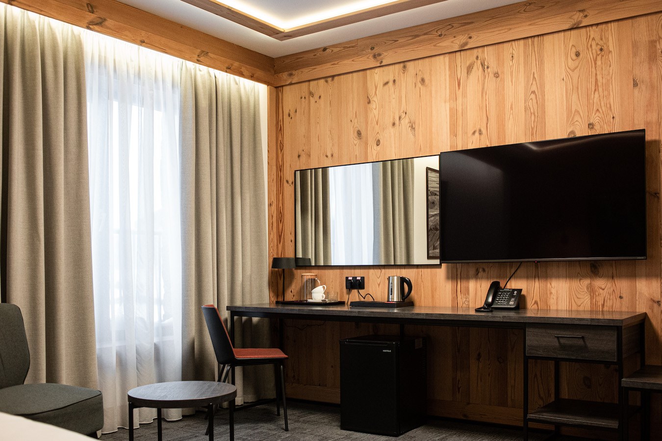 В номере: кровать двуспальная, прикроватные тумбочки, стол, стулья, шкаф, сейф, телевизор, холодильник, электрочайник