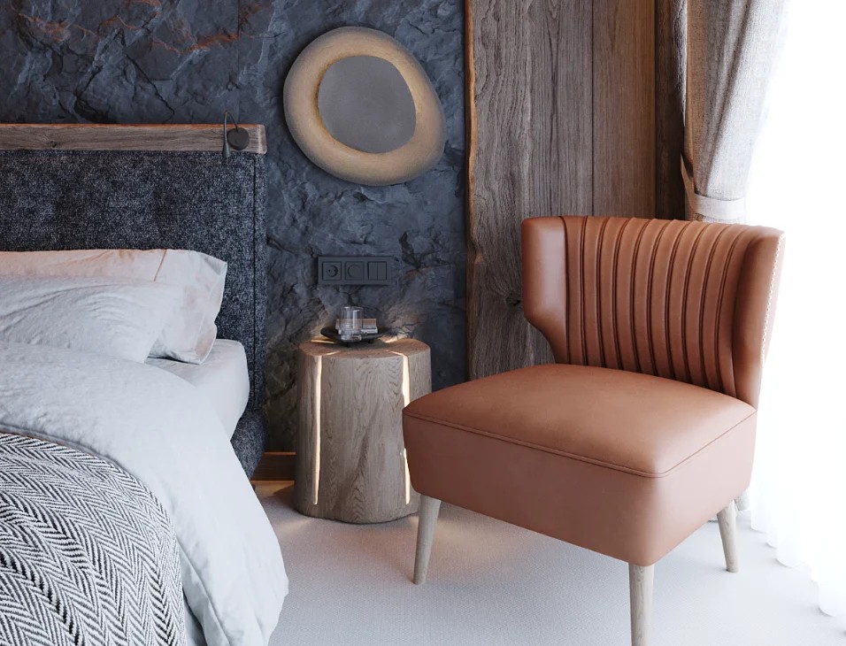 В номере: диван раскладной, кресла, кровать двуспальная, прикроватные тумбочки, стол, стулья, шкаф, камин, микроволновая печь, набор посуды, плита электрическая, сейф, телевизор, холодильник, электрочайник