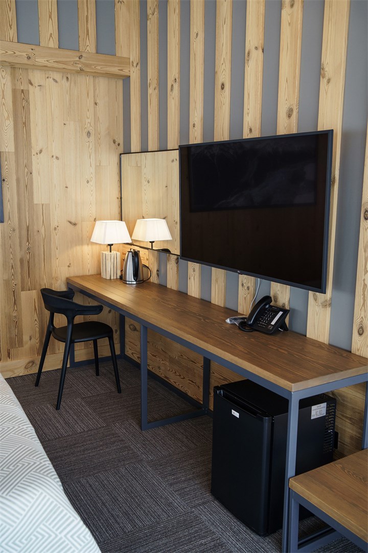 В номере: кровать двуспальная, прикроватные тумбочки, стол, стул, шкаф, телевизор, холодильник, электрочайник