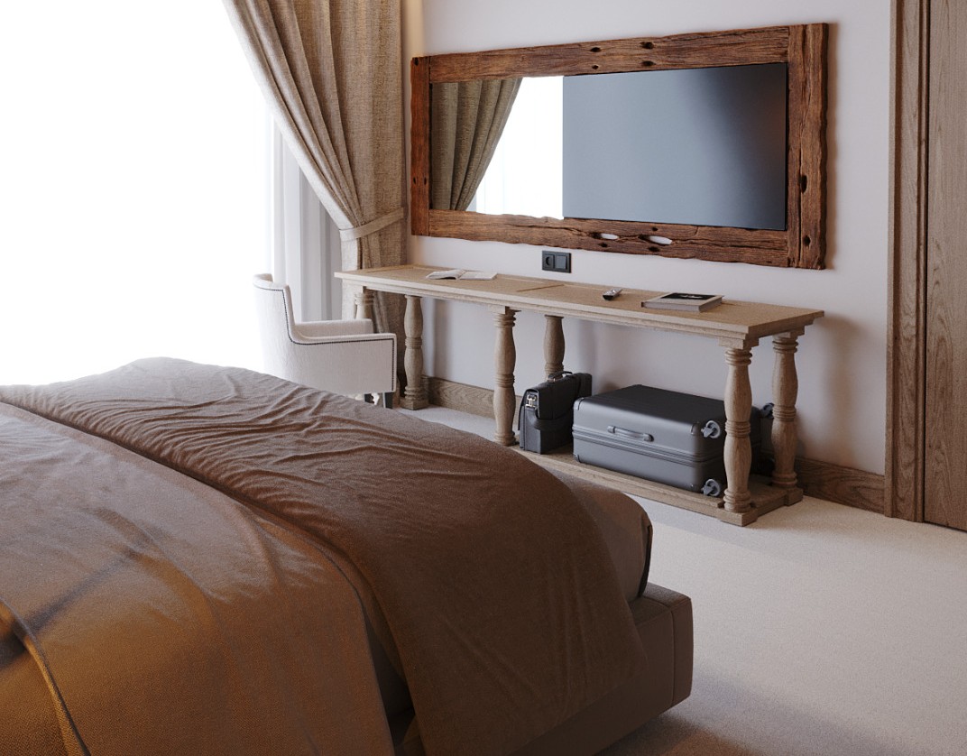 В номере: кровать двуспальная, прикроватные тумбочки, стол, стул, шкаф, сейф, телевизор, холодильник, электрочайник