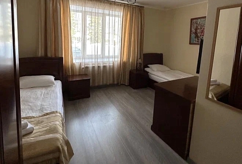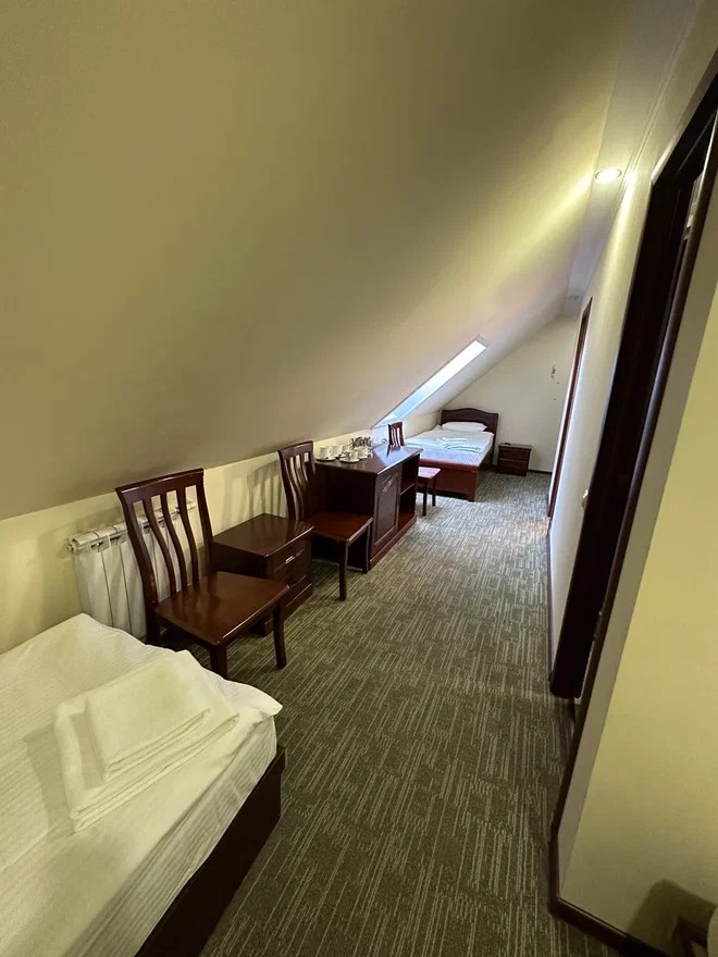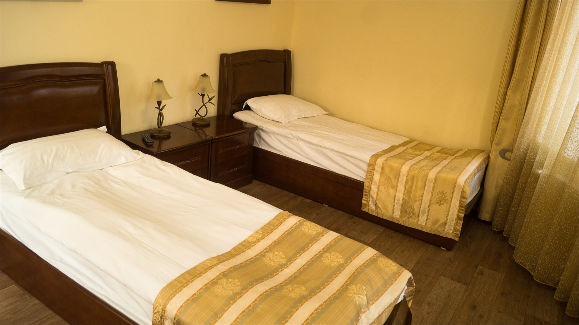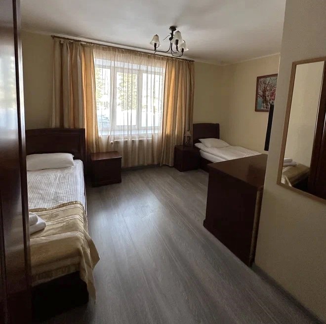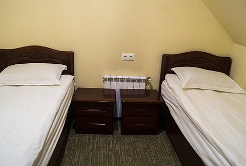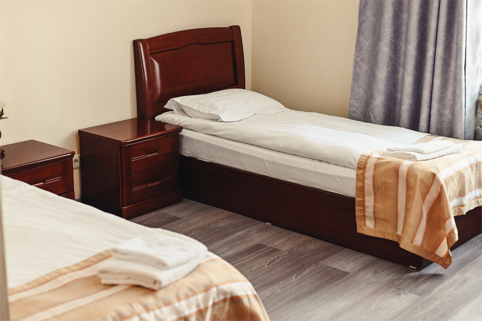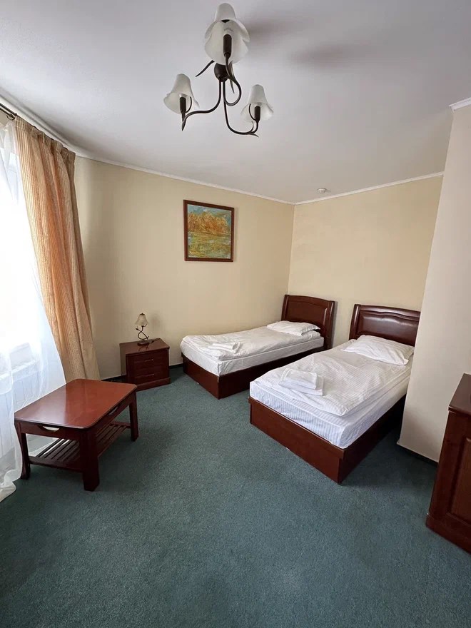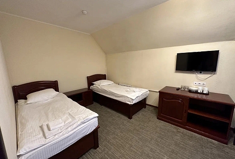 В номере: кровати односпальные, прикроватные тумбочки, стол, стулья, шкаф, набор посуды, телевизор
