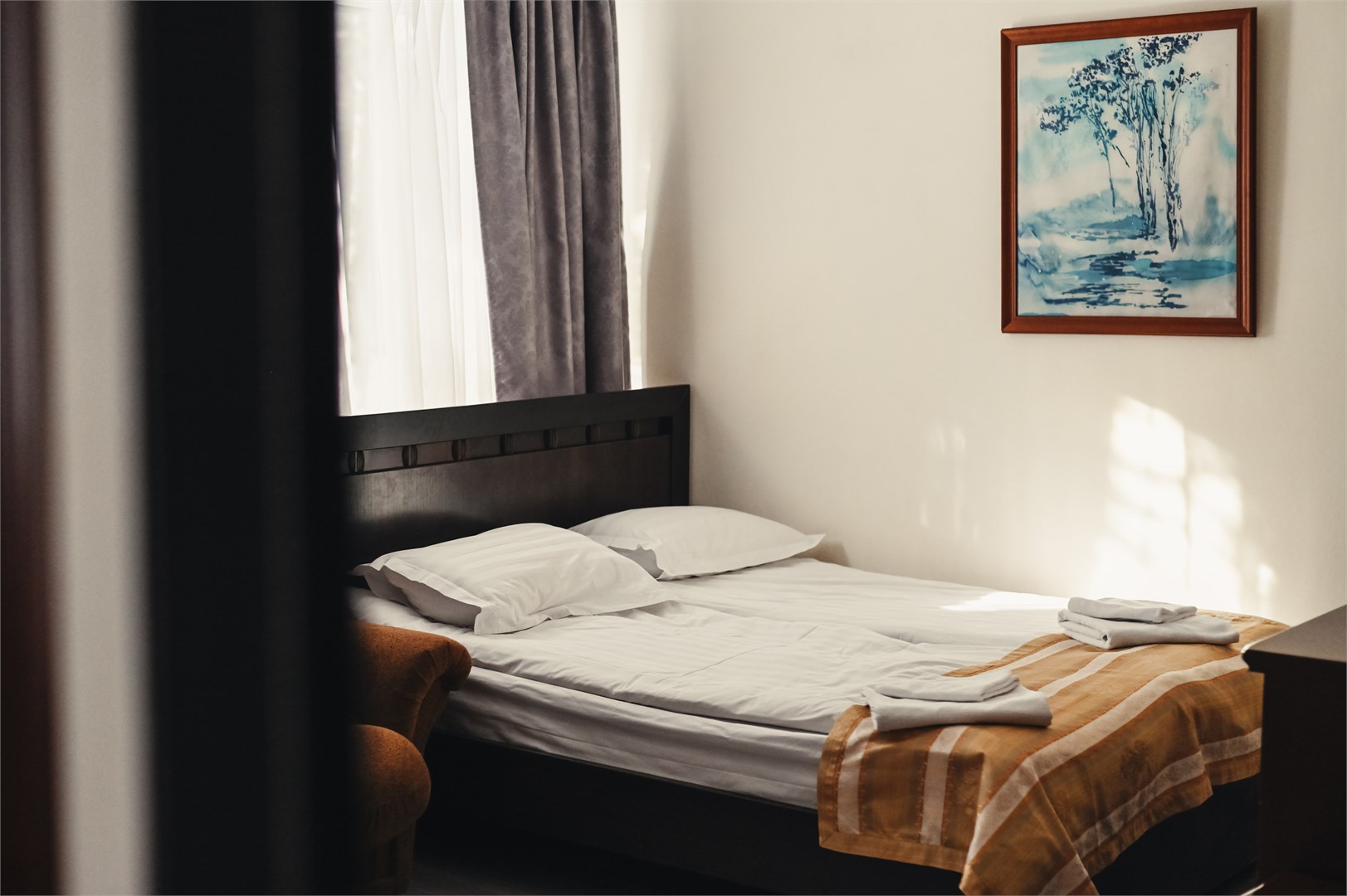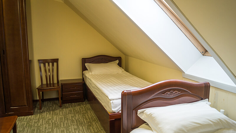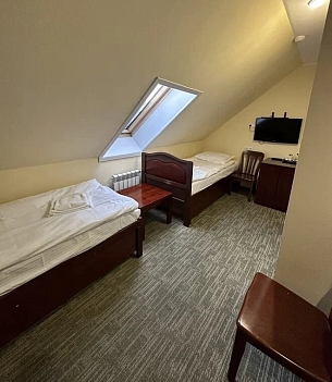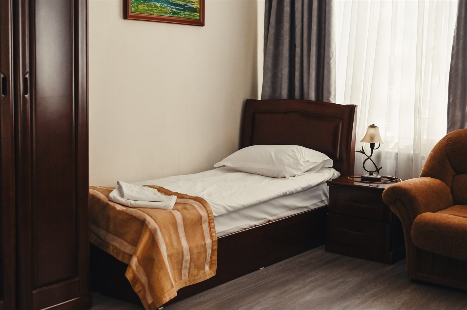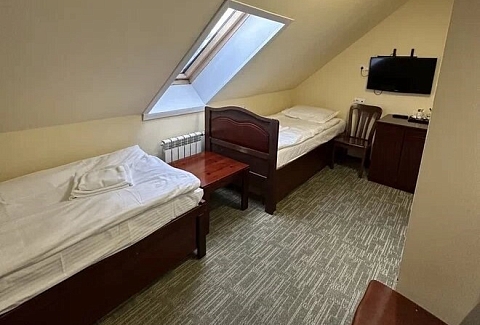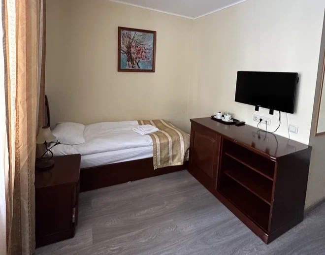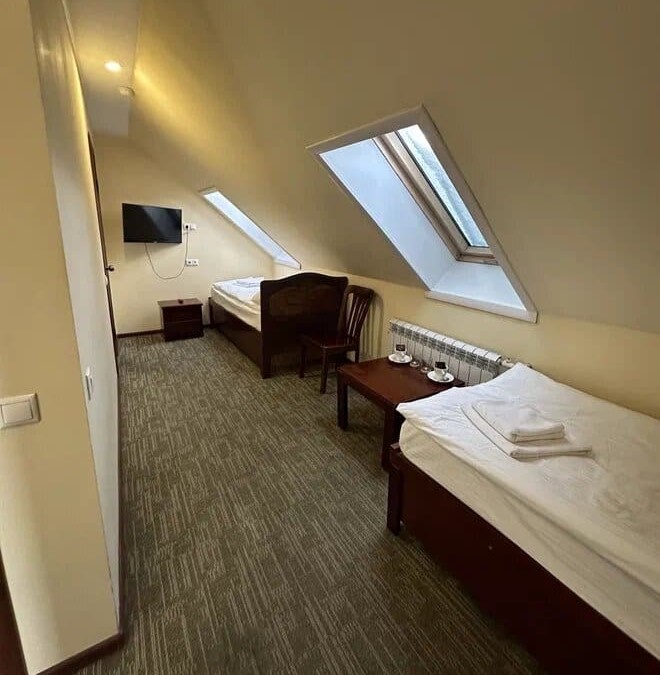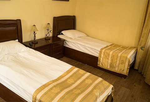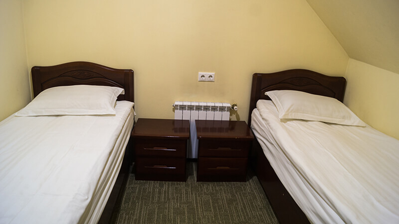 В номере: кровати односпальные, прикроватные тумбочки, стол, стулья, шкаф, набор посуды, телевизор
