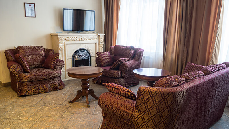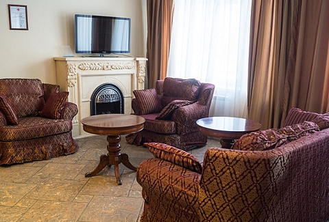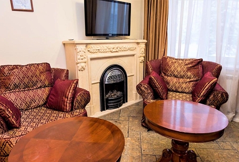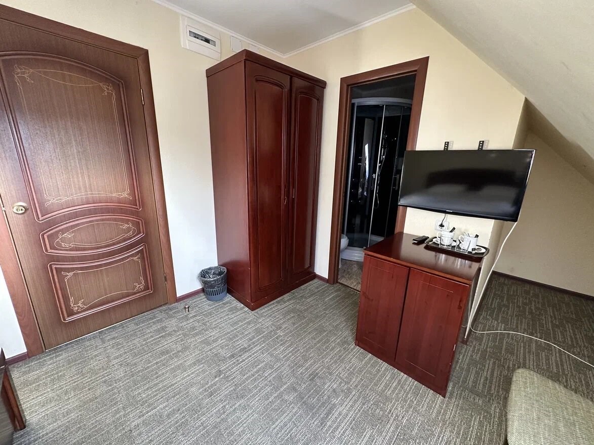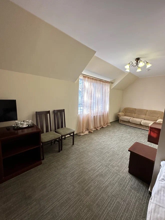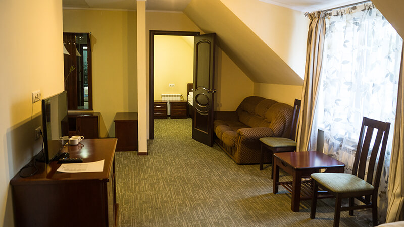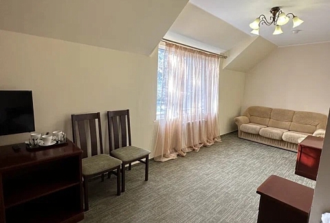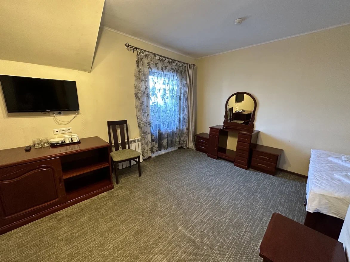 В номере: диван раскладной, кровать двуспальная, кровать односпальная, прикроватные тумбочки, стол, стулья, шкаф, набор посуды, телевизор