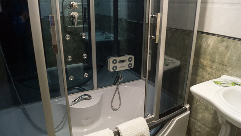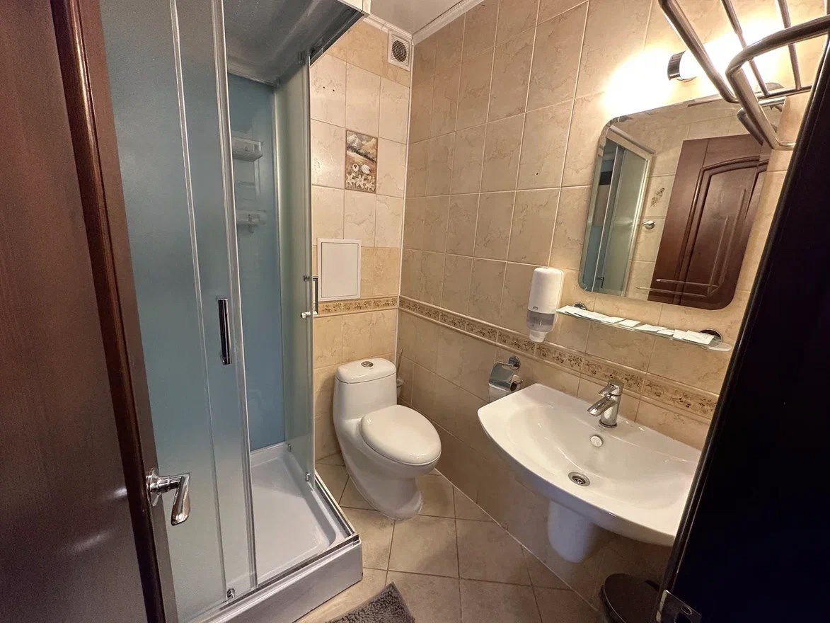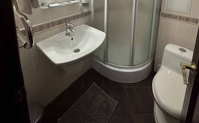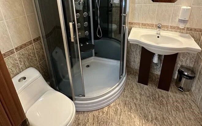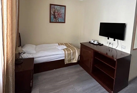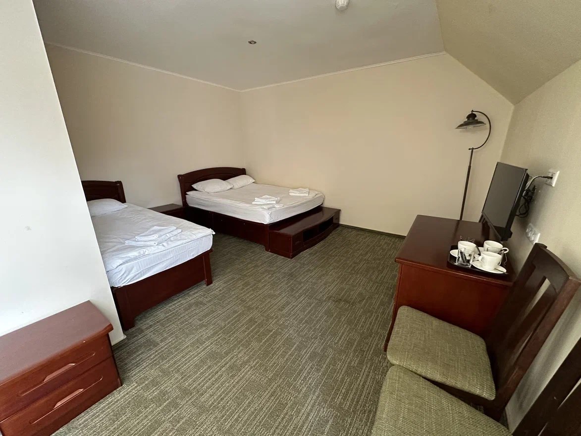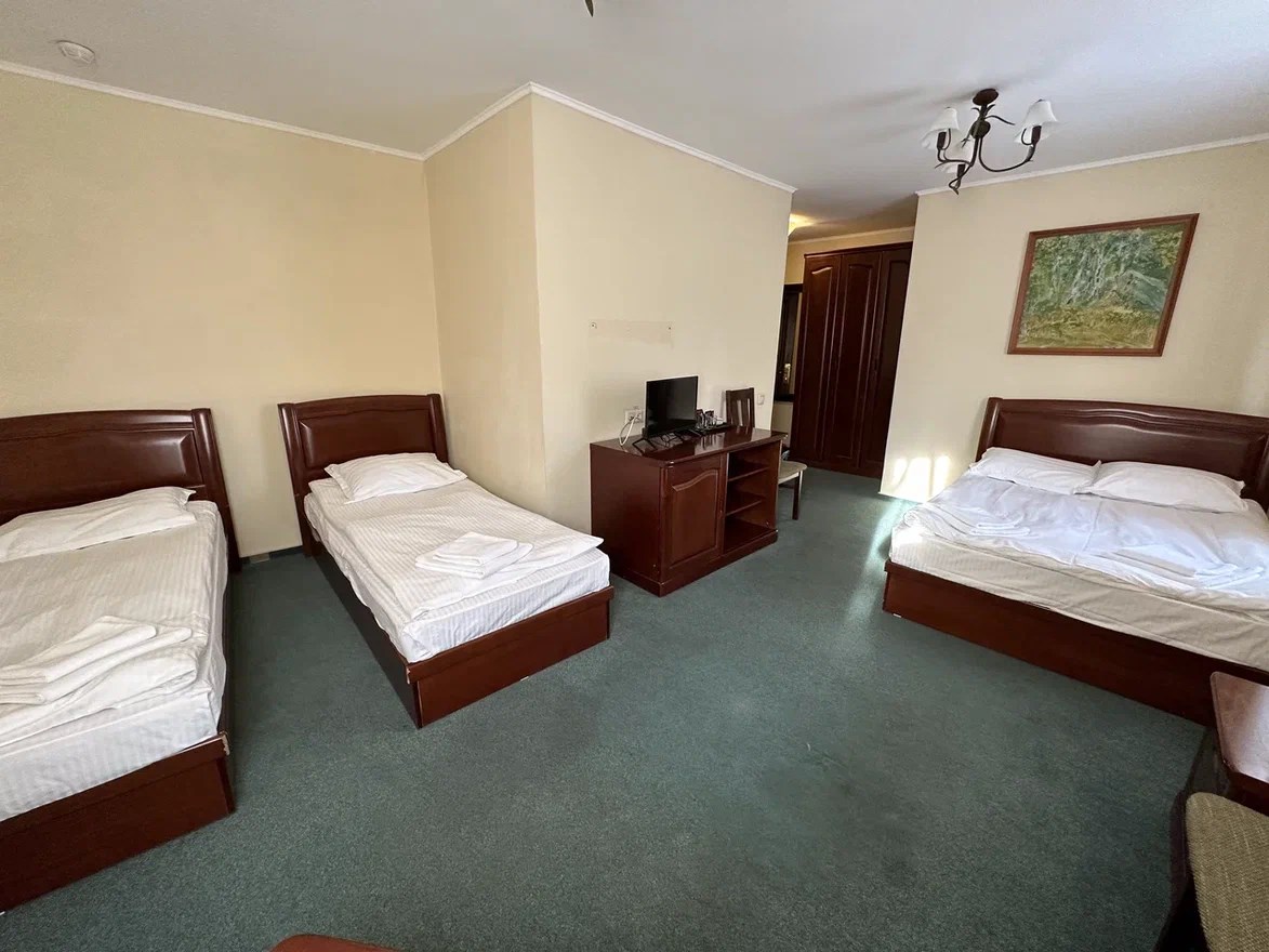В номере: диван раскладной, кровати односпальные, прикроватные тумбочки, стол, стулья, шкаф, набор посуды, телевизор