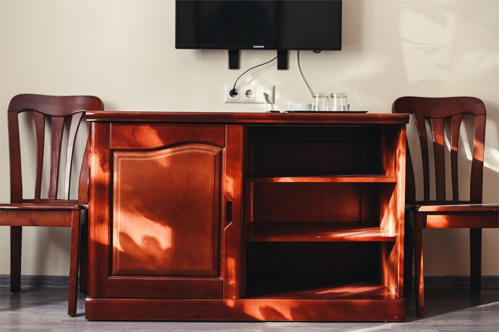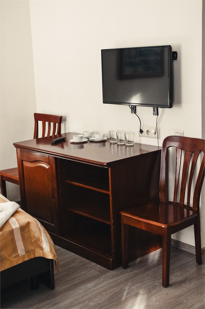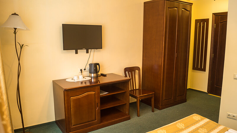 В номере: кровать двуспальная, прикроватная тумбочка, стол, стулья, шкаф, набор посуды, телевизор