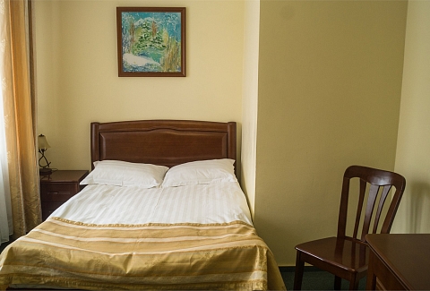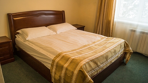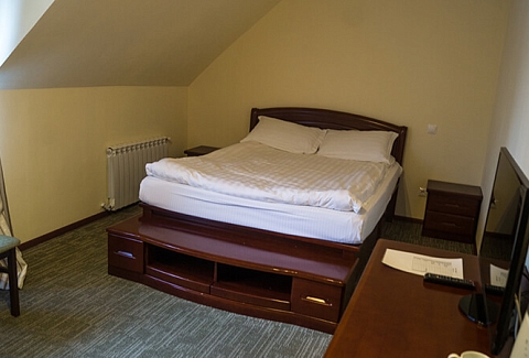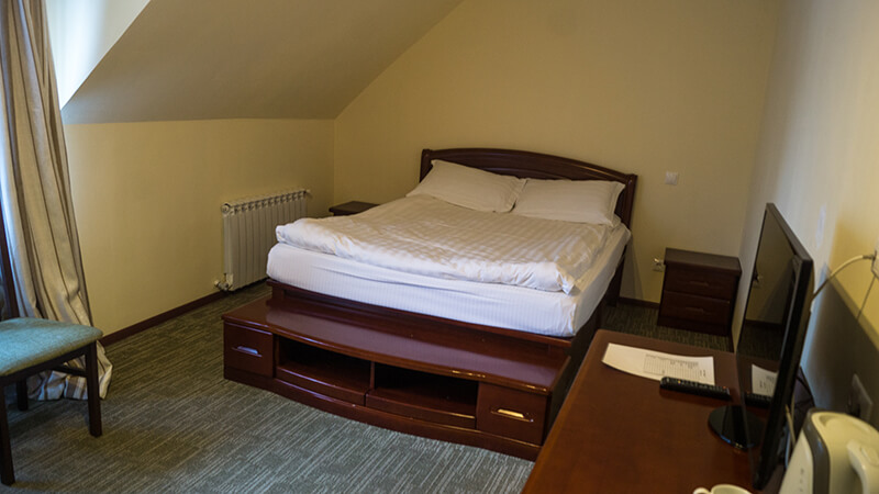 В номере: кровать двуспальная, прикроватные тумбочки, стол, стулья, шкаф, набор посуды, телевизор