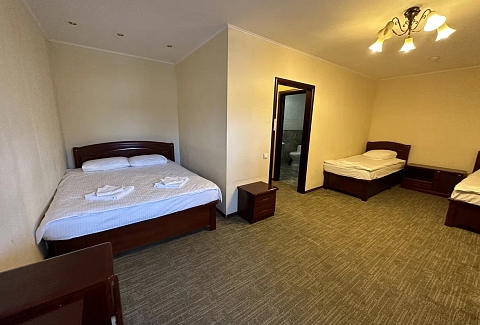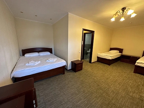 В номере: диван раскладной, кровати односпальные, кровать двуспальная, прикроватные тумбочки, стол, стулья, шкаф, набор посуды, телевизор