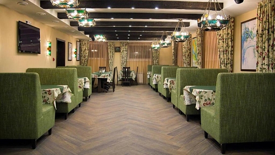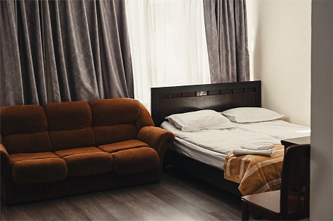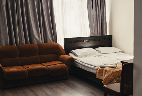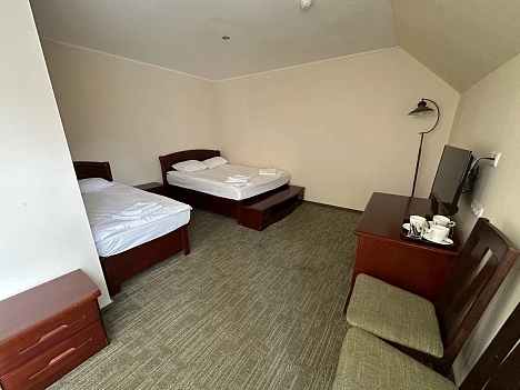 В номере: диван раскладной, кровати односпальные /одна двуспальная кровать, прикроватные тумбочки, стол, стулья, шкаф, набор посуды, телевизор