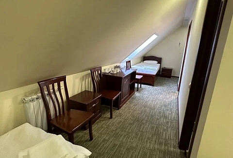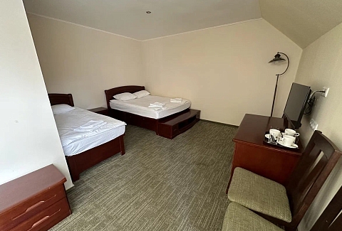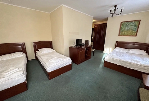 В номере: кровати односпальные, кровать двуспальная, прикроватные тумбочки, стол, стулья, шкаф, набор посуды, телевизор
