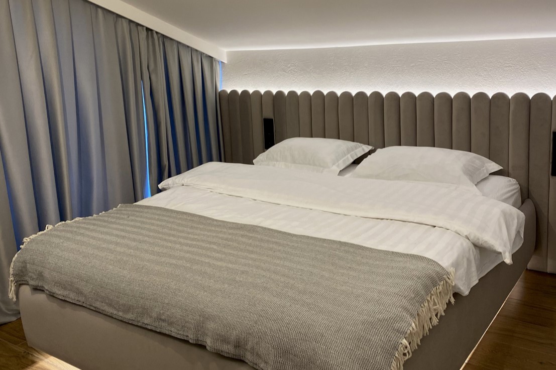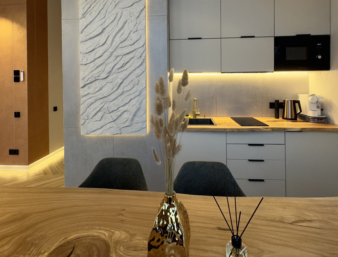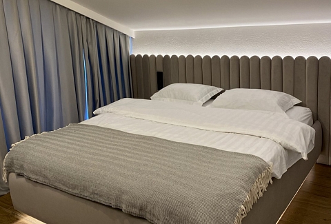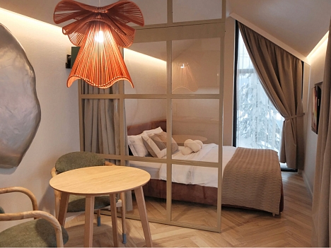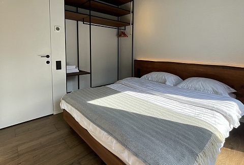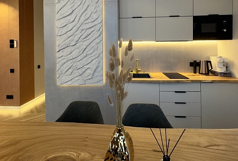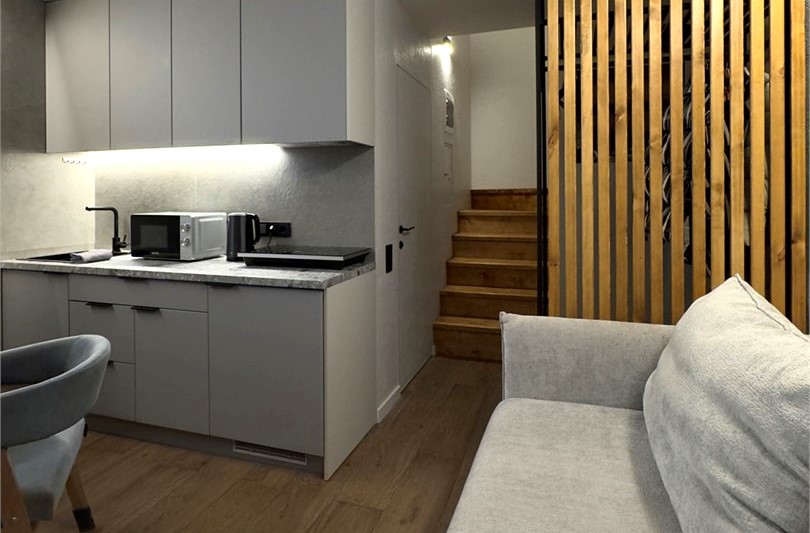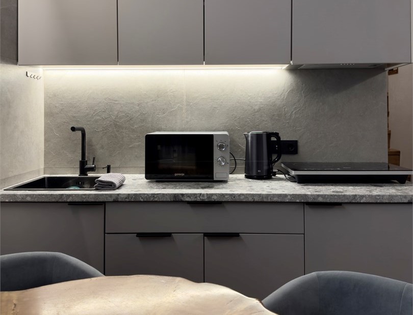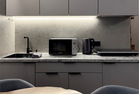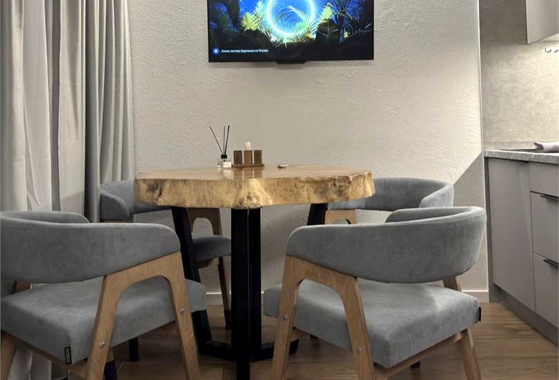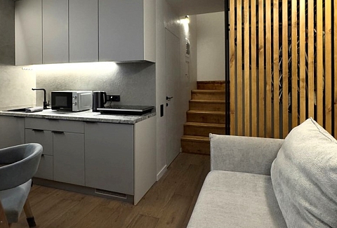 В номере: диван раскладной, кровать двуспальная, кухонная мебель, стол, стулья, шкаф, кондиционер, кофемашина, микроволновая печь, набор посуды, плита электрическая, телевизор, теплый пол, умная колонка, холодильник, электрочайник