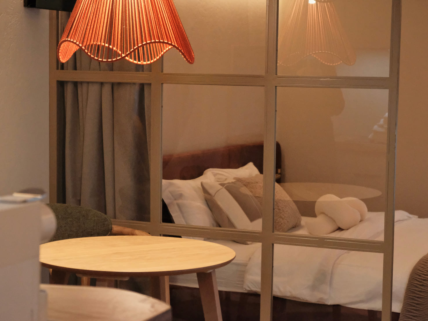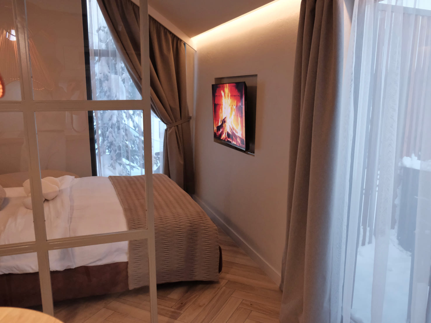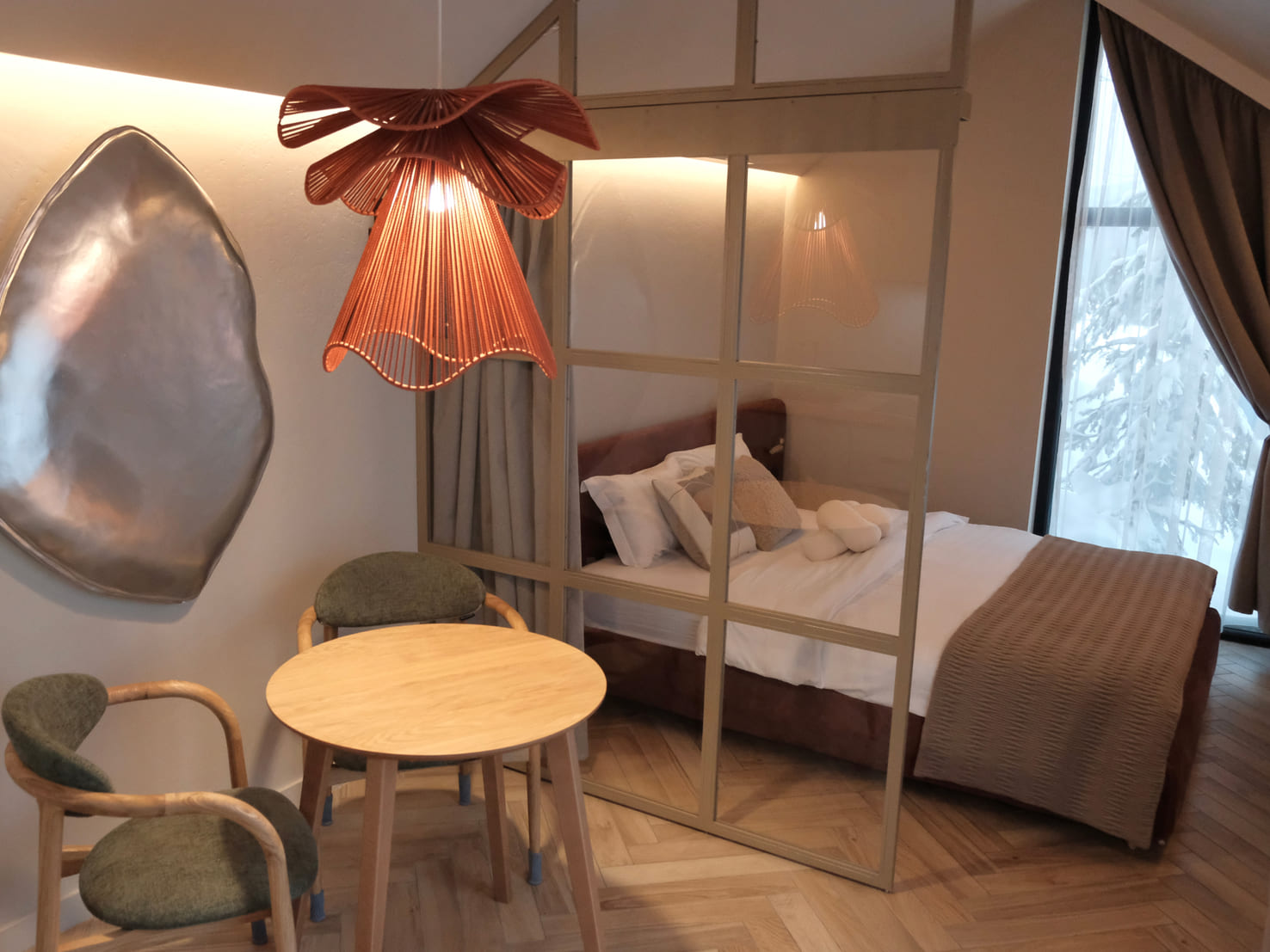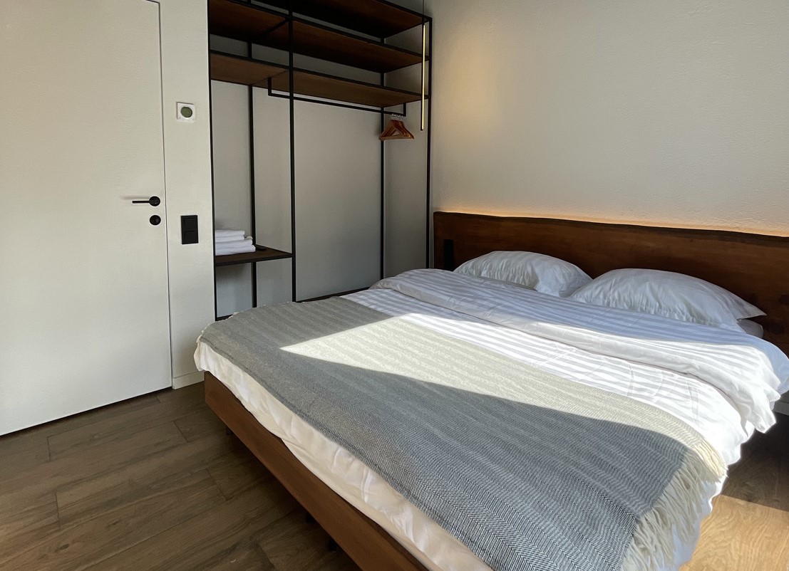 В номере: диван раскладной, кровать двуспальная, кухонная мебель, стол, стулья, шкаф, кондиционер, кофемашина, микроволновая печь, набор посуды, плита электрическая, телевизор, теплый пол, умная колонка, холодильник, электрочайник